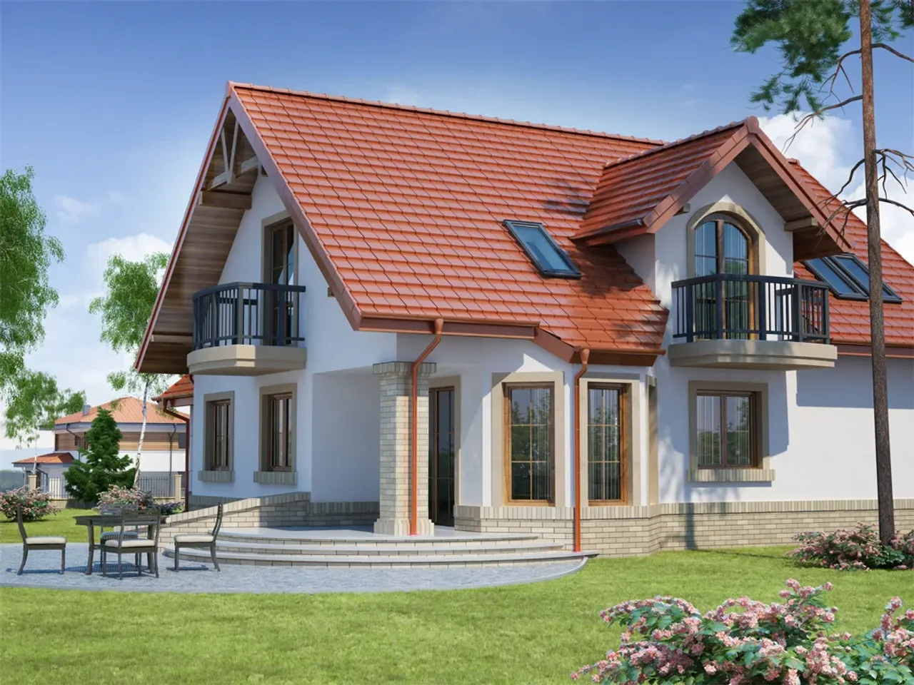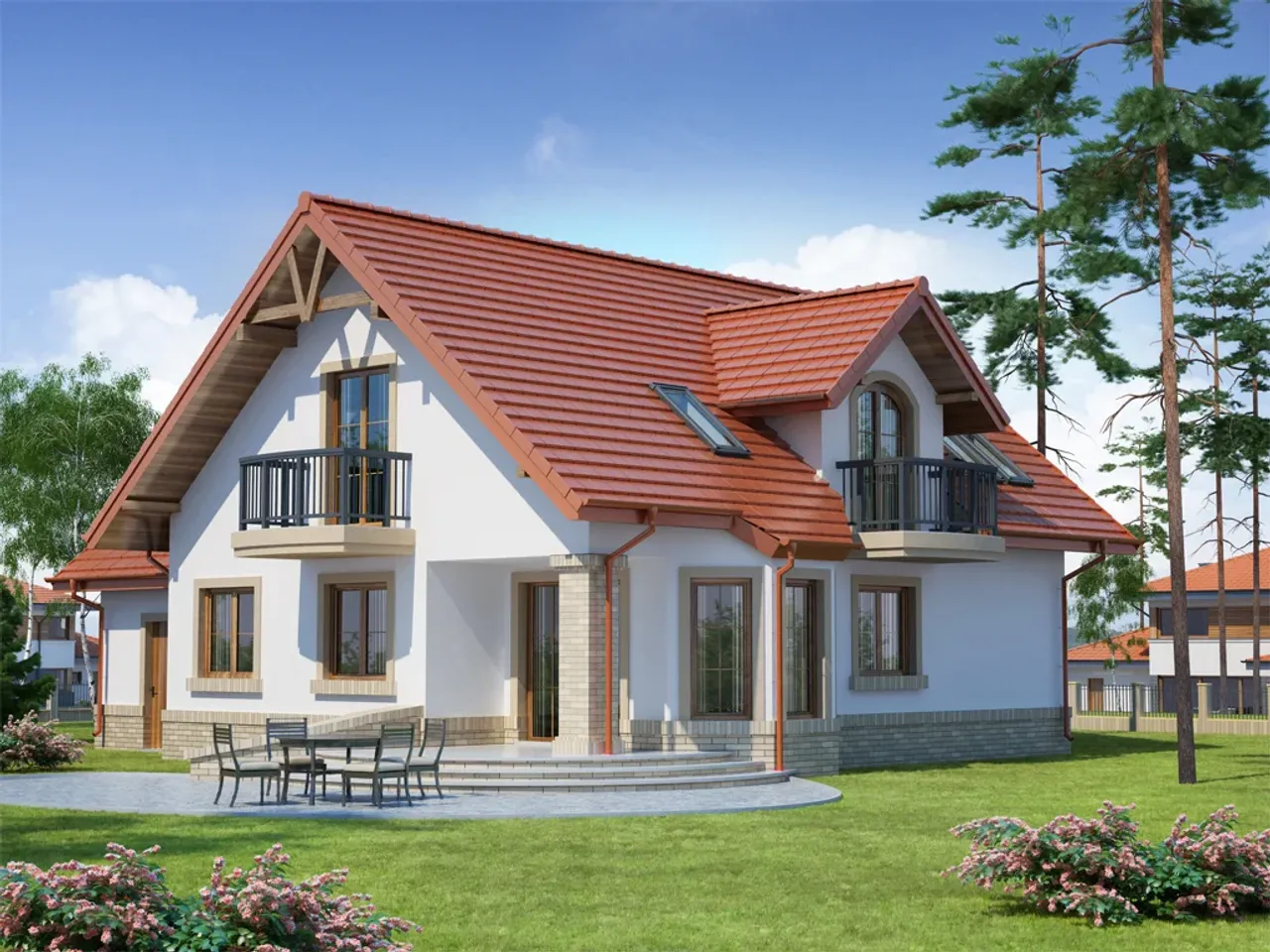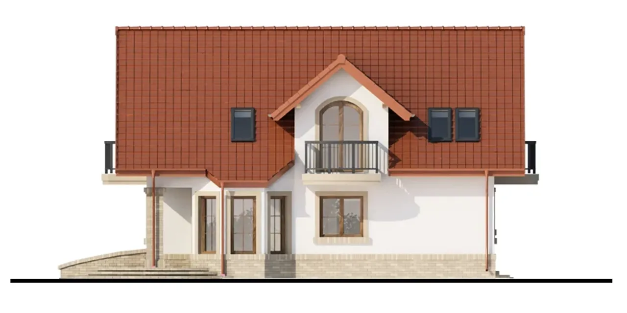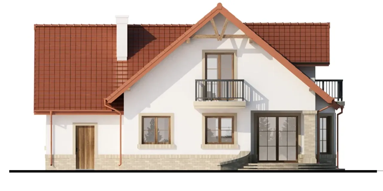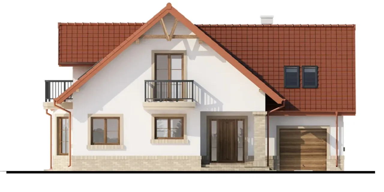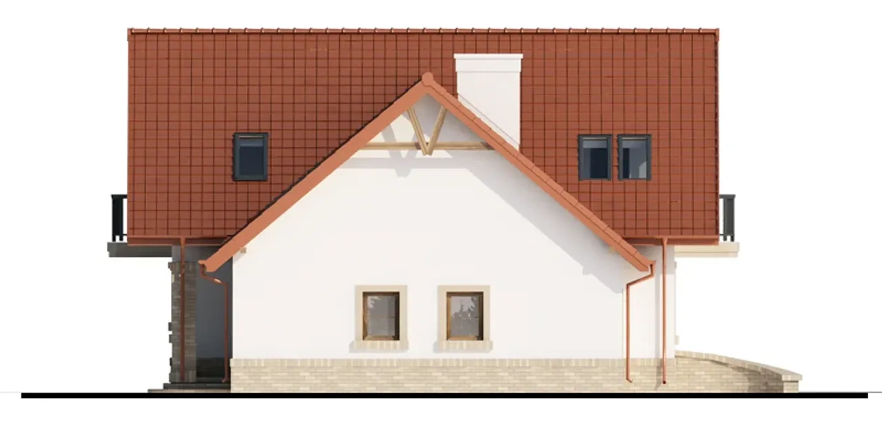 Projekt domu Itamon to parterowy dom z poddaszem pokryty dachem dwuspadowym. Budynek posiada tradycyjną formę od strony frontowej znajduj się zadaszone drzwi wejściowe oraz wjazd do garażu jednostanowiskowego z wydzielonym miejscem na pomieszczenie gospodarcze. W projekcie domu Itamon charakterystyczną cechą jest wykusz umieszczony przy częściowo zadaszonym tarasie. Trzy pokoje na poddaszu mają dostęp do oddzielnych balkonów, salon oraz jadalnia zostały dobrze doświetlone, poprzez zastosowanie dużych przeszkleń.