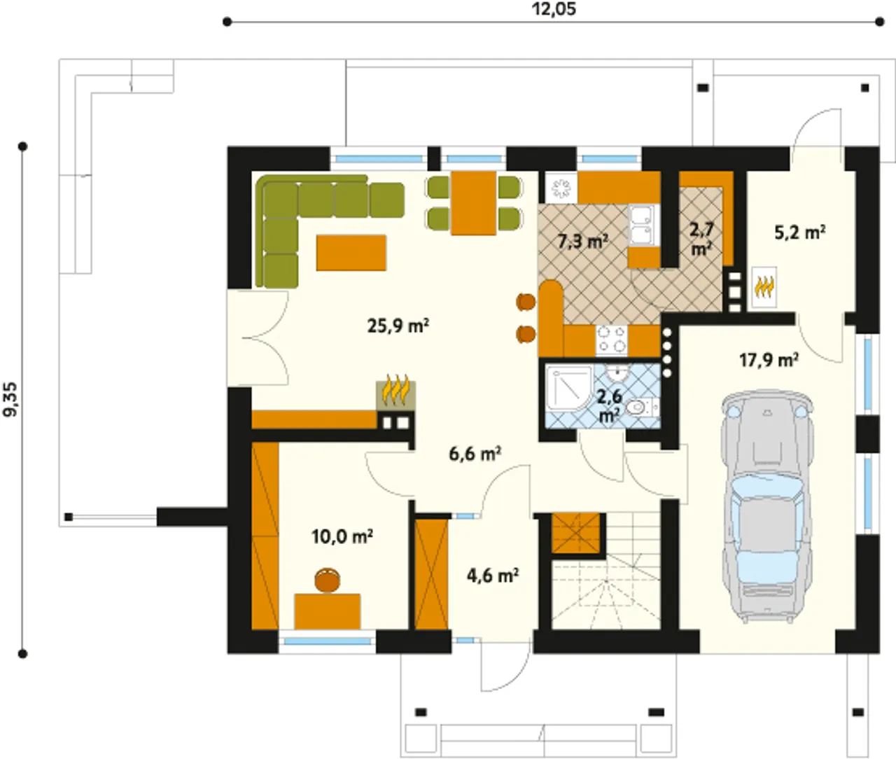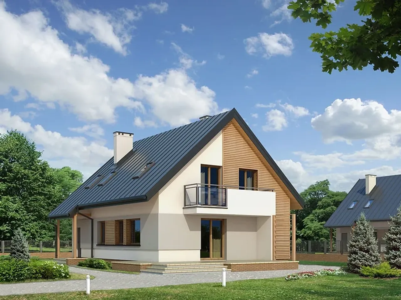 Gotowy projekt domu o nazwie Jabłoń (CE) to budynek całoroczny , zaprojektowany w technologii murowanej - tradycyjnej. Elewacja budynku wykończona jest w stylu nowoczesnym, natomiast dom pokryty jest dachem dwuspadowym. Projekt domu Jabłoń (CE) zmieści się na działkę o szerokości 20.65, jego powierzchnia użytkowa 132.3 obejmuje parter oraz poddasze budynku. W projekcie Jabłoń (CE) w garażu zmieści się jedno auto (prosimy o sprawdzenie w innych wersjach projektu Jabłoń (CE)).Jest to dom energooszczędny.z kominkiem,bez piwnicy.