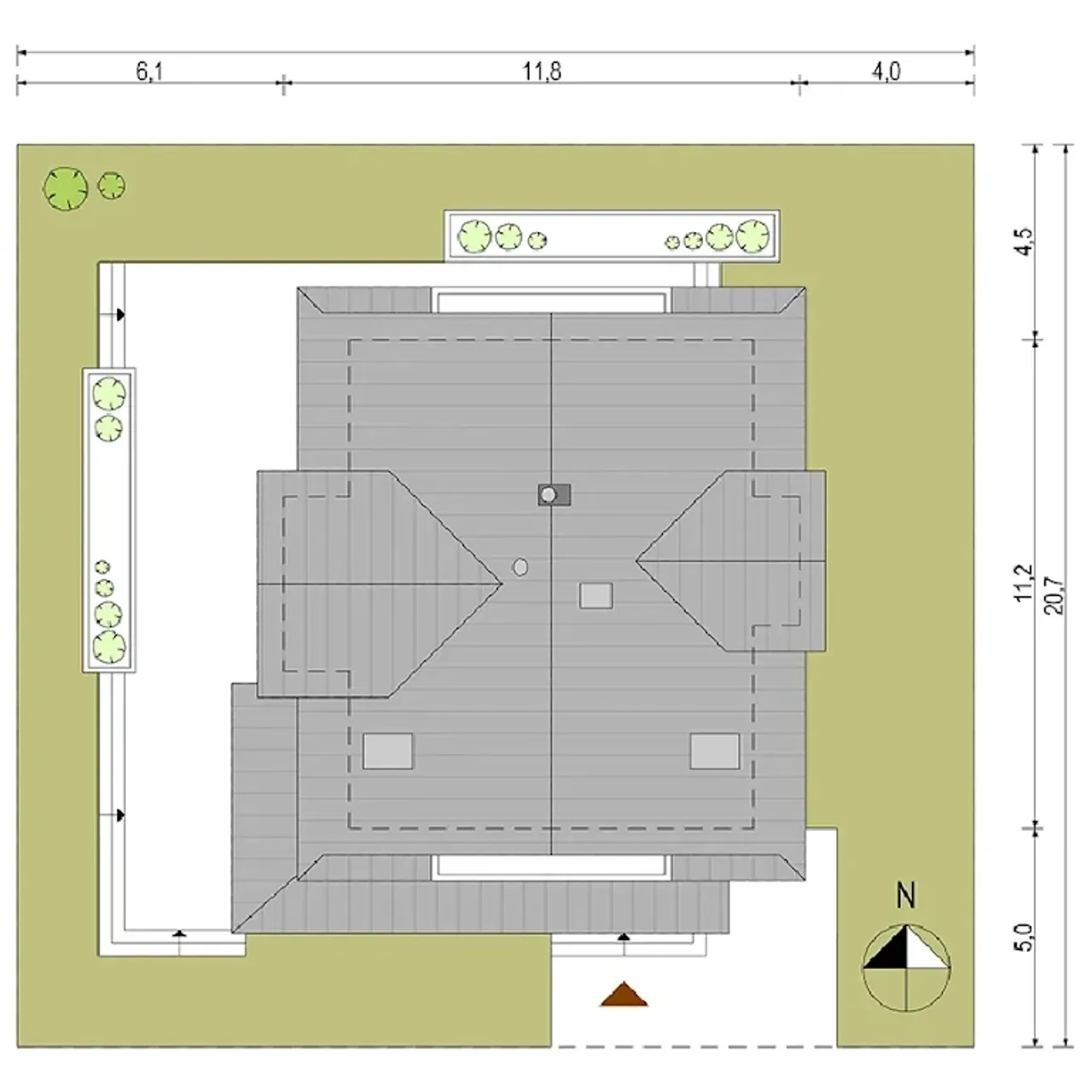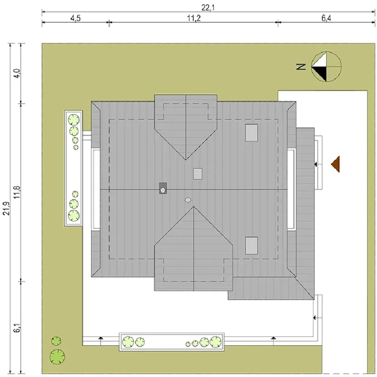 - rzut dachu - ukazuje jego kształt, wymiary, kąt nachylenia połaci, rozmieszczenie okien połaciowych, lukarn, świetlików i rur spustowych, pokazuje rozmieszczenie kominów i informuje o sposobie odwodnienia: rozmieszczeniu i rozmiarach rynien