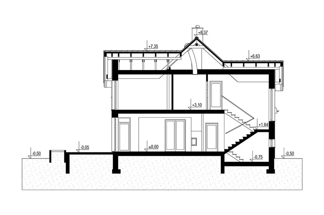 - przekroje - pokazują wszystkie elementy budynku po przecięciu go wzdłuż lub w poprzek od dachu do fundamentów tj. warstwy podłogi, stropów i dachu