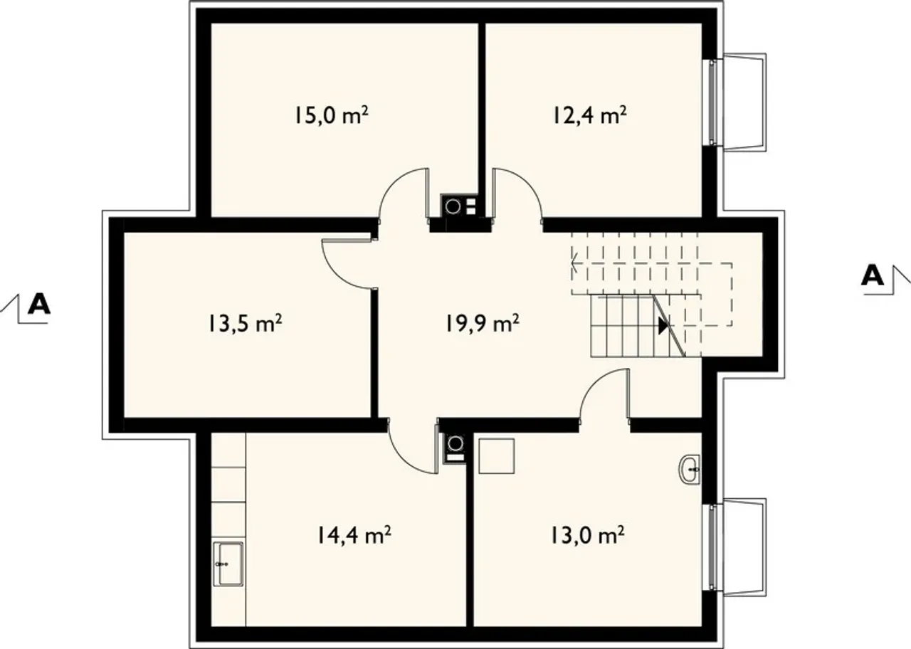 - rzuty wszystkich kondygnacji- pokazuje rozmieszczenie poszczególnych pomieszczeń i ich wymiary, powierzchnie, rozmieszczenie ścian, rozmieszczenie otworów drzwiowych, okiennych, urządzeń kuchennych i sanitarnych