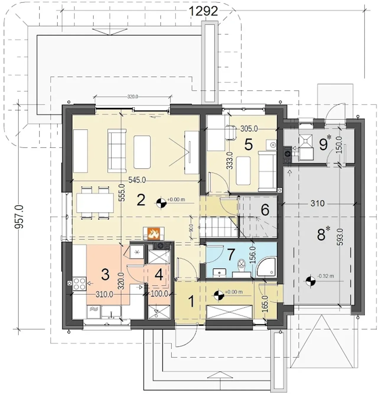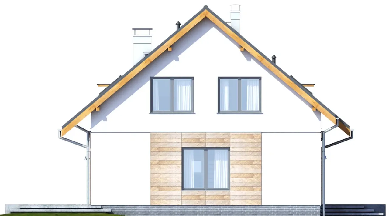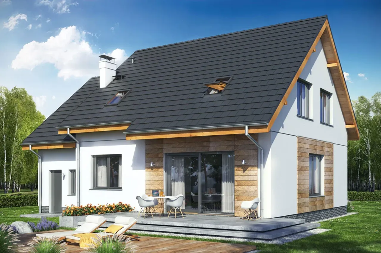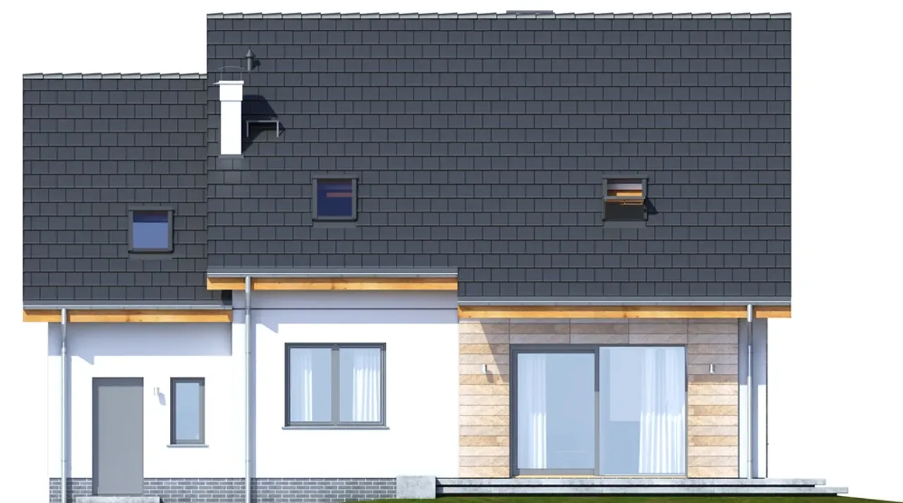Dom posiada przestronne wnętrze z pięcioma pokojami, praktyczną spiżarnią i kominkiem w strefie dziennej. Jednostanowiskowy garaż, bezpośrednio połączony z częścią mieszkalną, ułatwia codzienne funkcjonowanie domownikom. Energooszczędność spełniająca wymagania WT 2021 i solidna technologia wykonania dają poczucie komfortu i bezpieczeństwa przez lata.