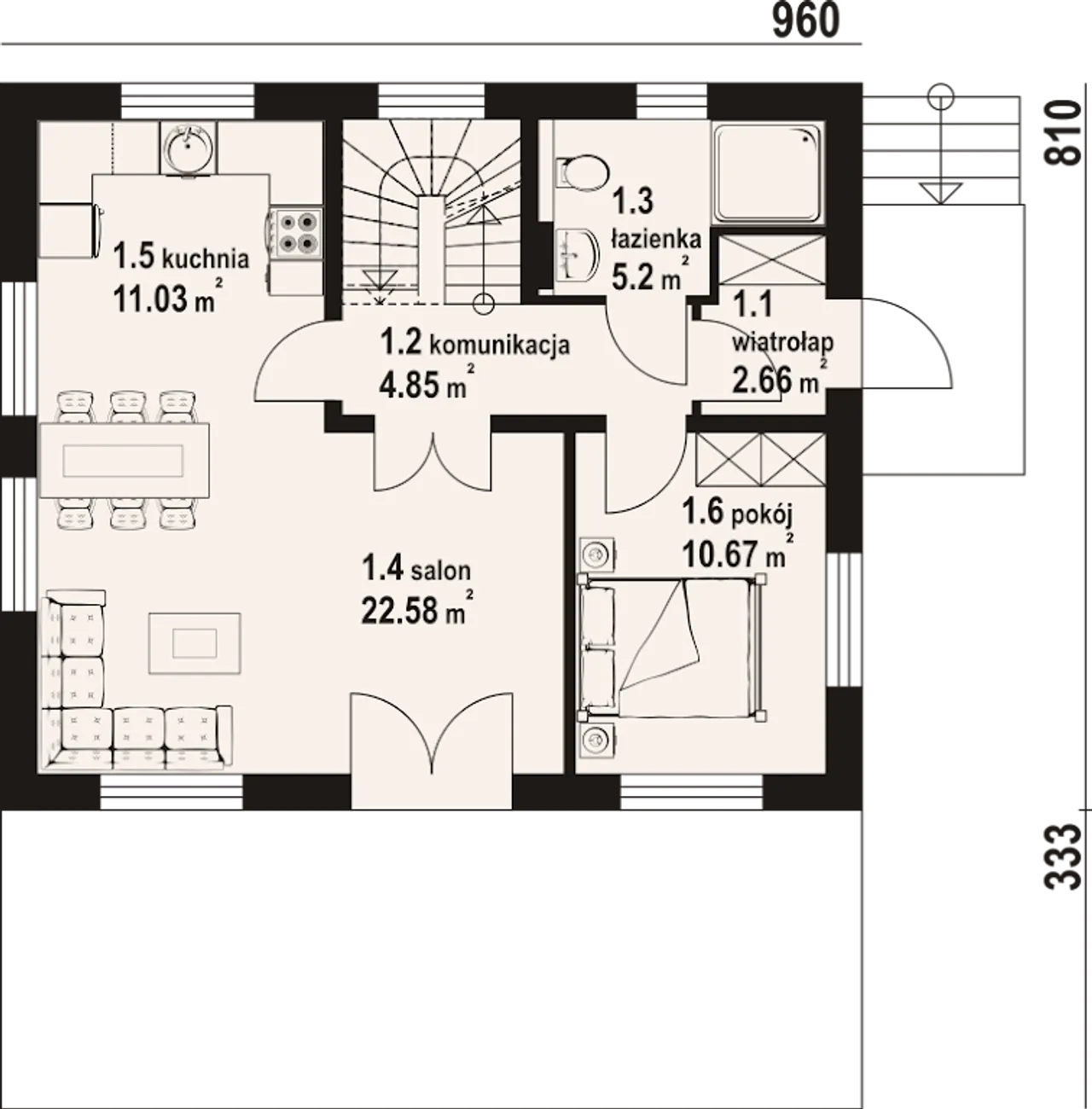 - opisu architektonicznego zawierającego m.in. opis przyjętych rozwiązań, zestawienia powierzchni (użytkowej, zabudowy, netto), kubatury oraz powierzchni poszczególnych pomieszczeń