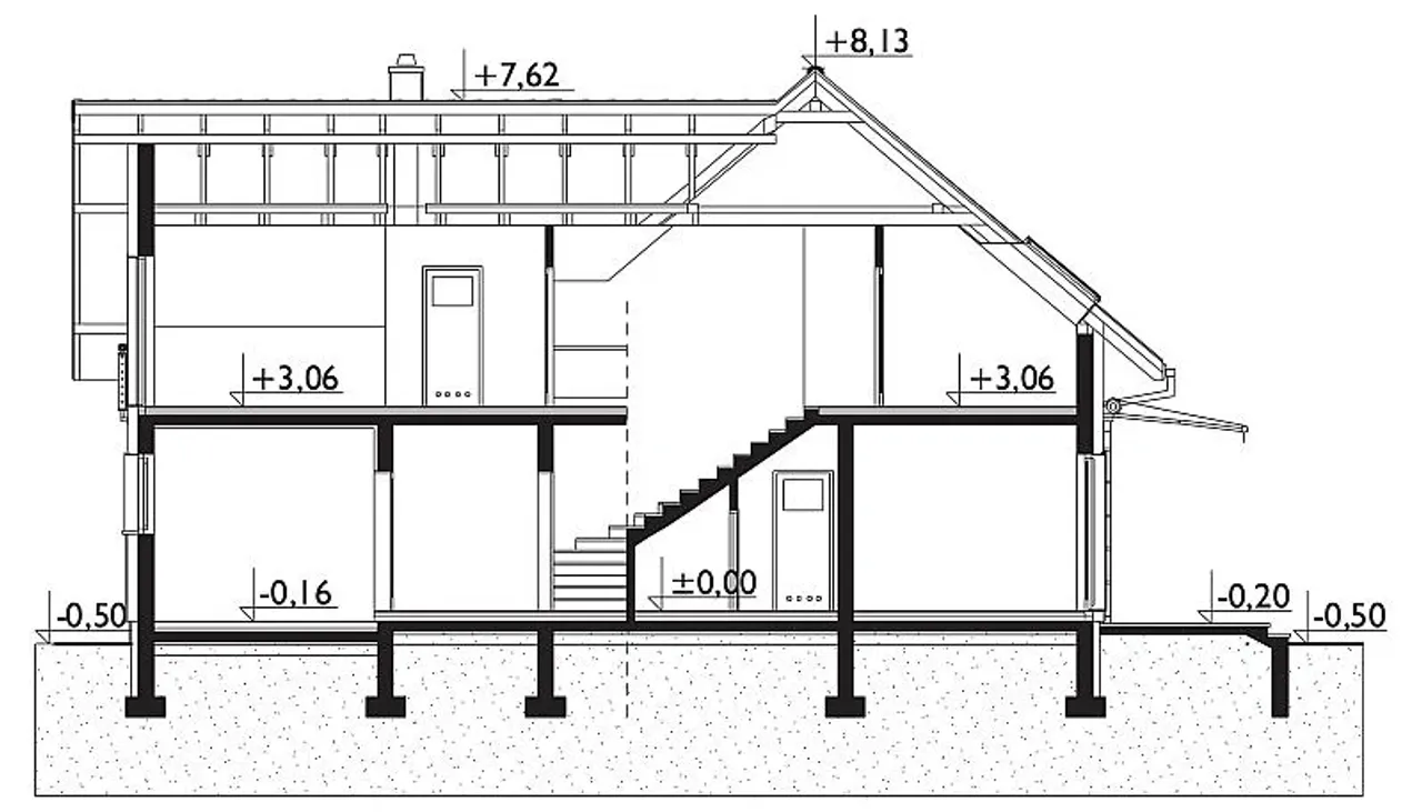- przekroje - pokazują wszystkie elementy budynku po przecięciu go wzdłuż lub w poprzek od dachu do fundamentów tj. warstwy podłogi, stropów i dachu