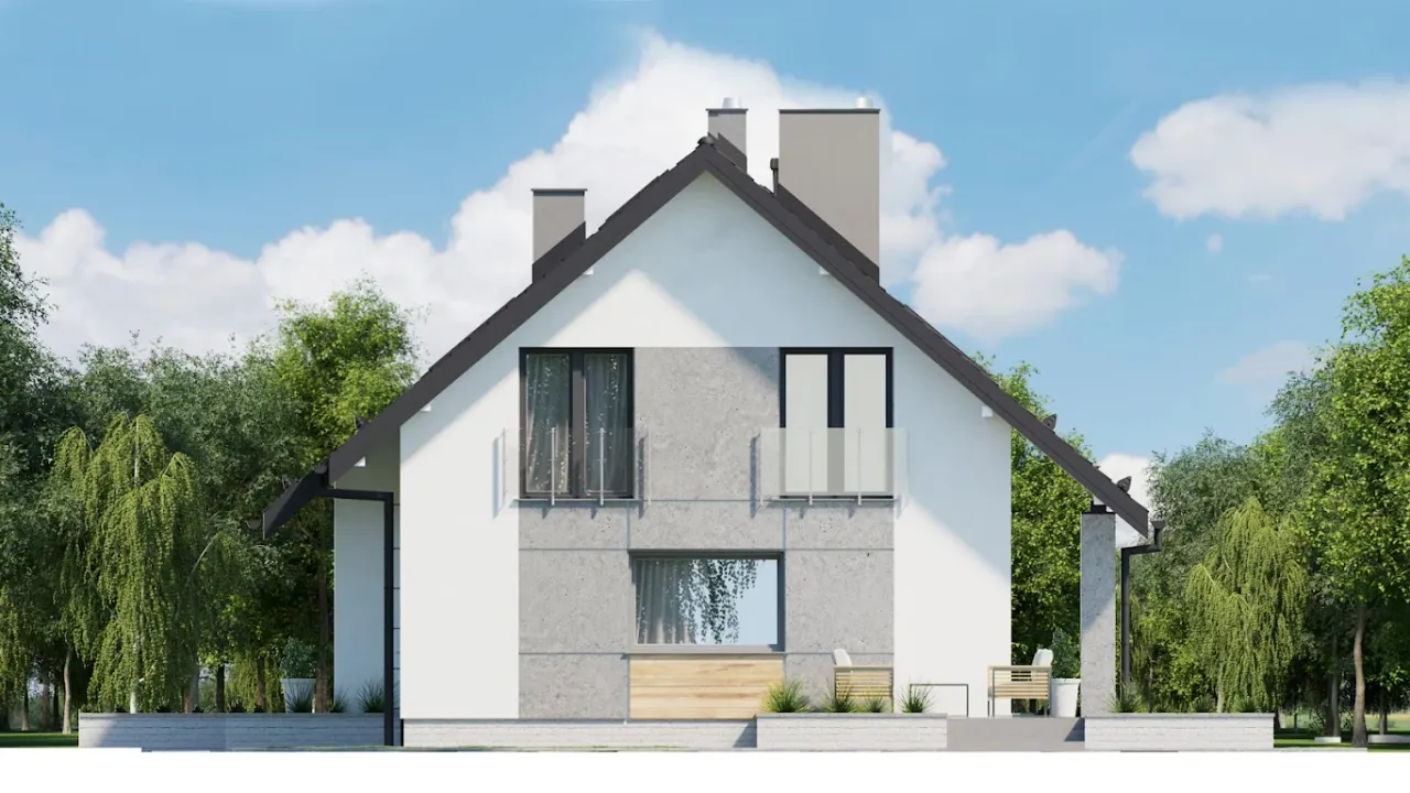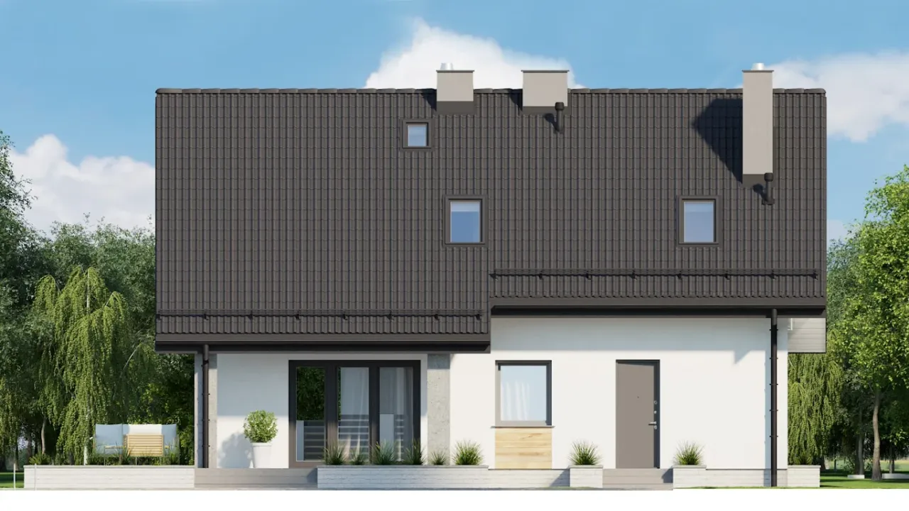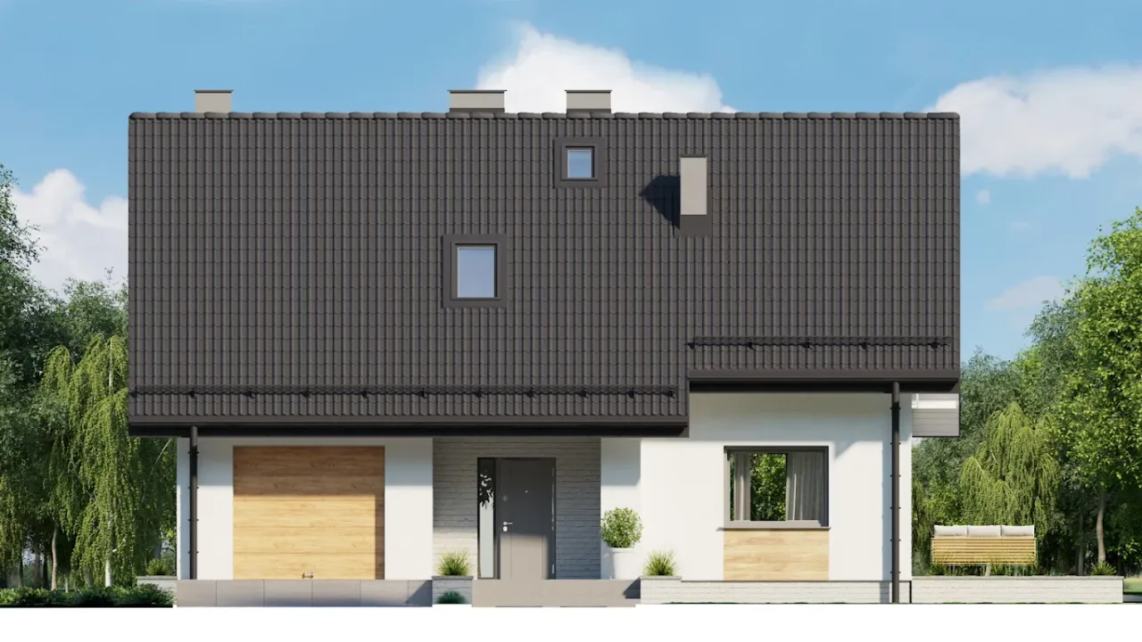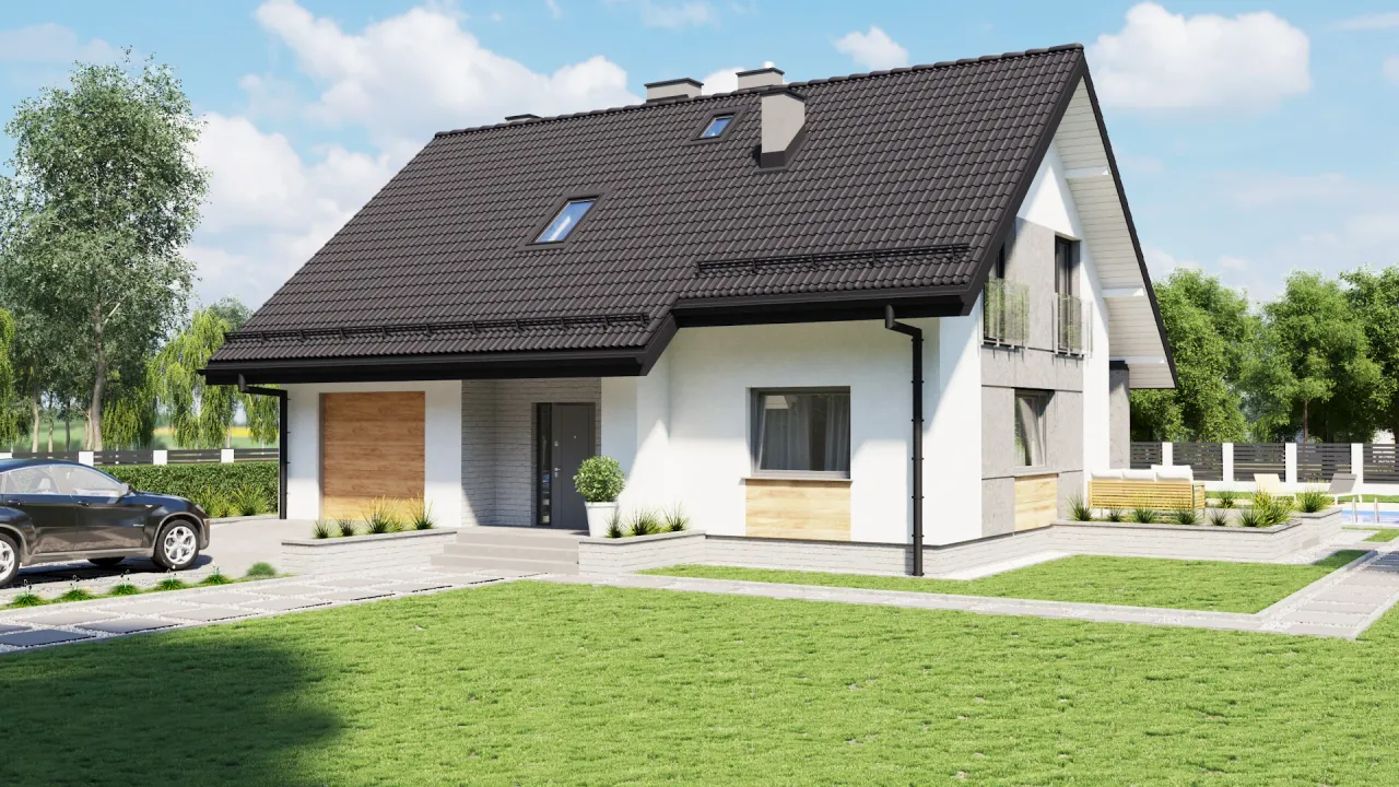 - Elewacje: wykończone tynkiem strukturalnym, płytką łupkową, drewnem naturalnym lub imitacją drewna.