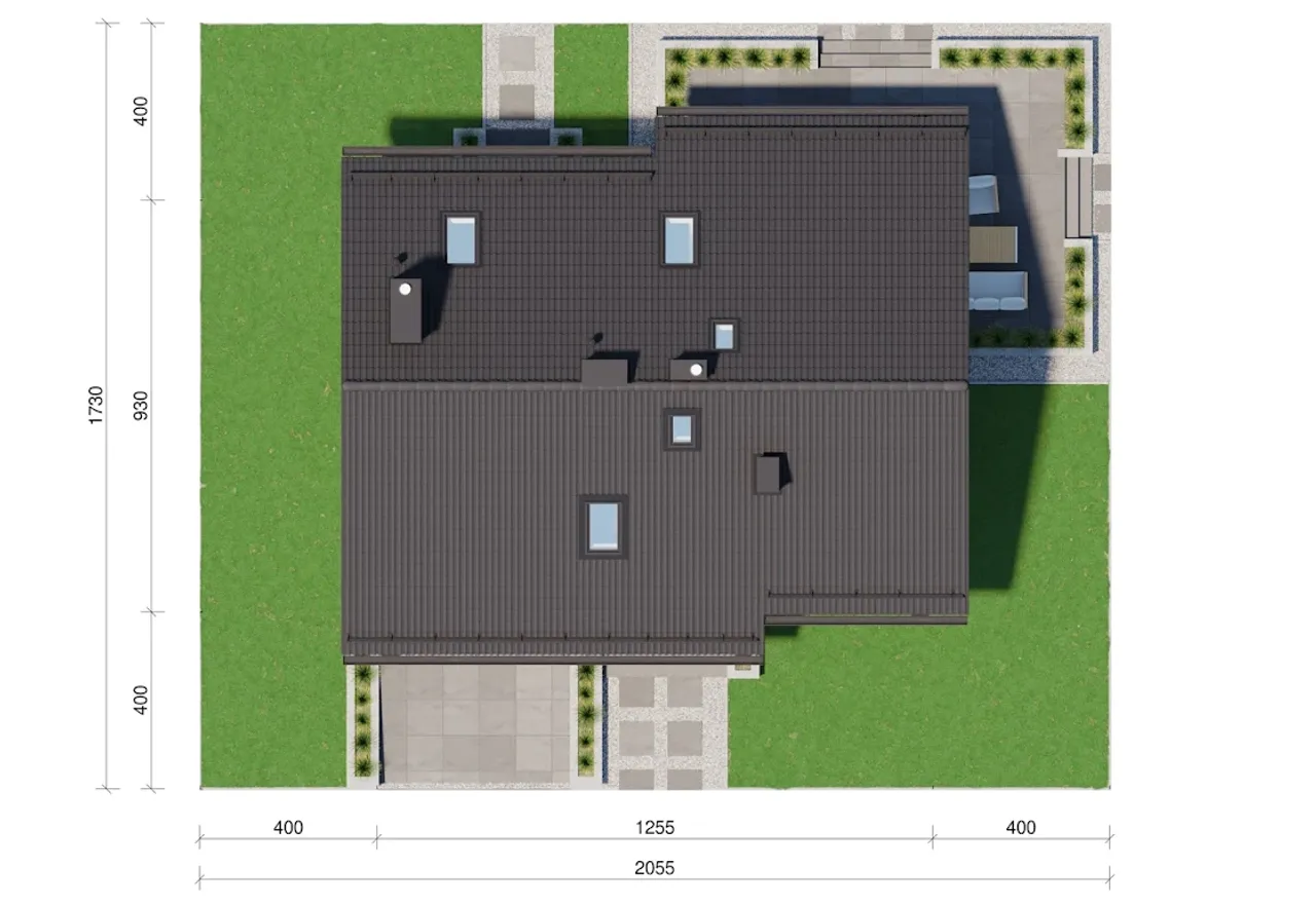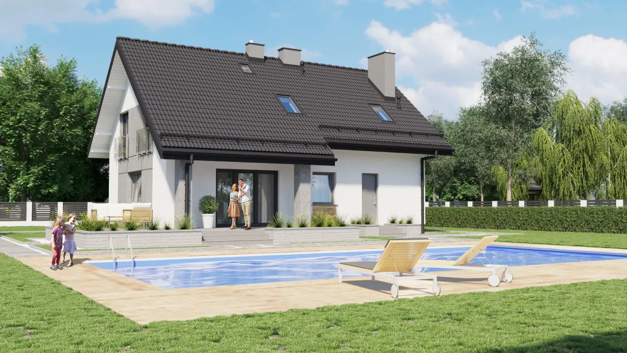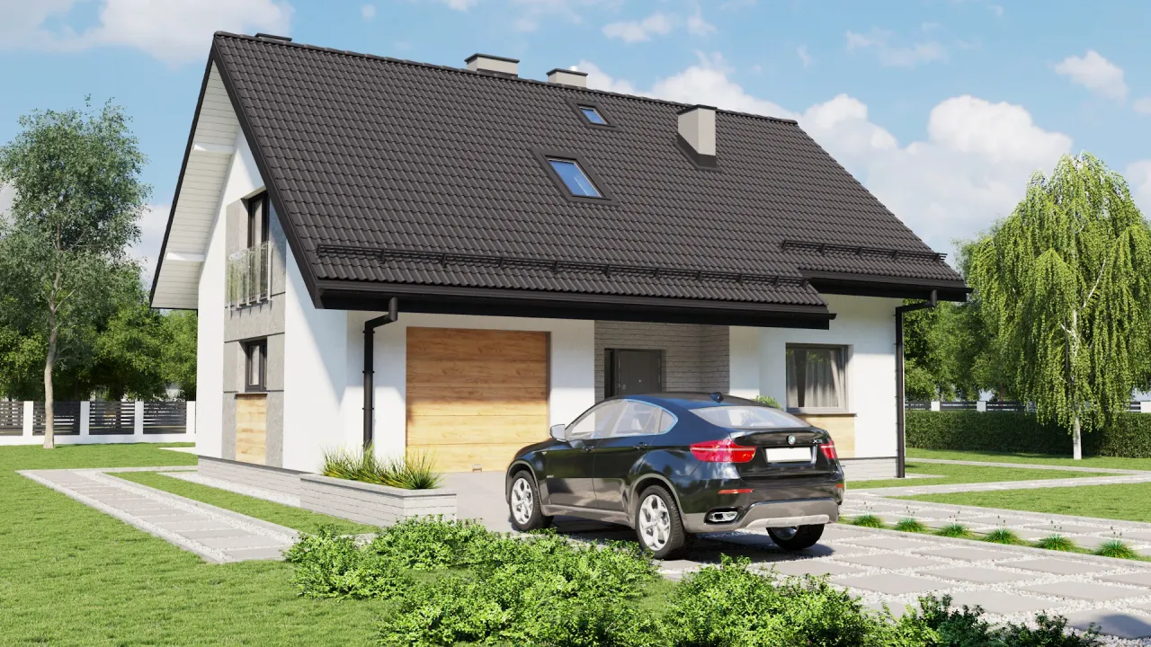 - Elewacje: wykończone tynkiem strukturalnym, płytką łupkową, drewnem naturalnym lub imitacją drewna.