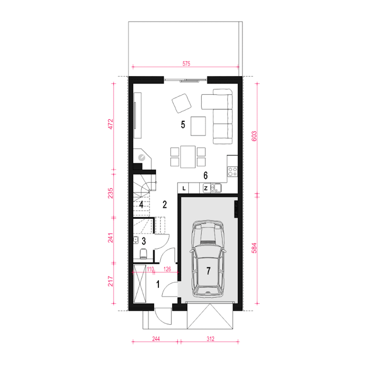 Wypełnij formularz i otrzymaj rysunki w pdf z dokładnymi wymiarami budynku i pomieszczeń (długość, szerokość, wysokość) dla projektu Jukka z garażem 1-st. A1-SZ