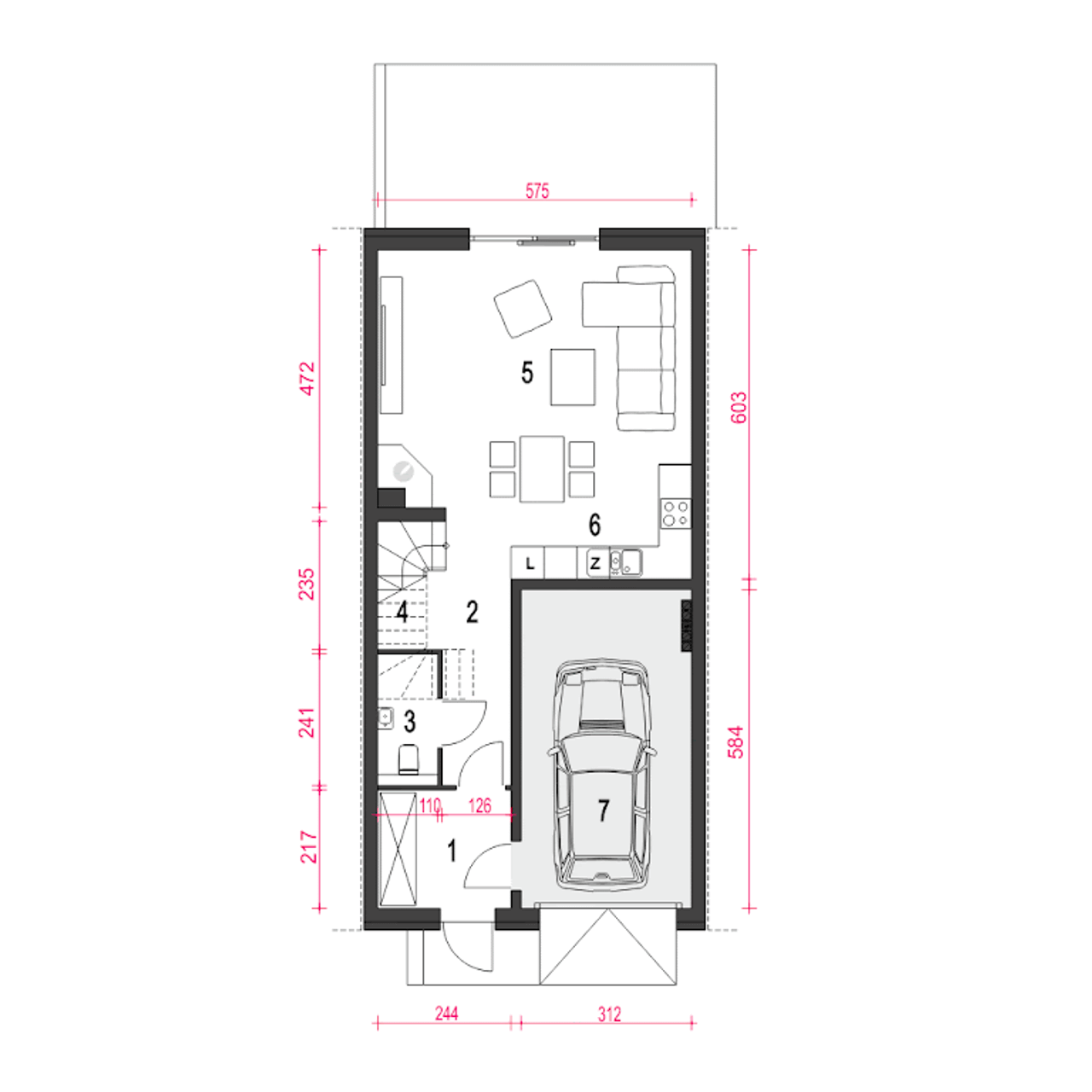 Wypełnij formularz i otrzymaj rysunki w pdf z dokładnymi wymiarami budynku i pomieszczeń (długość, szerokość, wysokość) dla projektu Jukka z garażem 1-st. A1-SZP