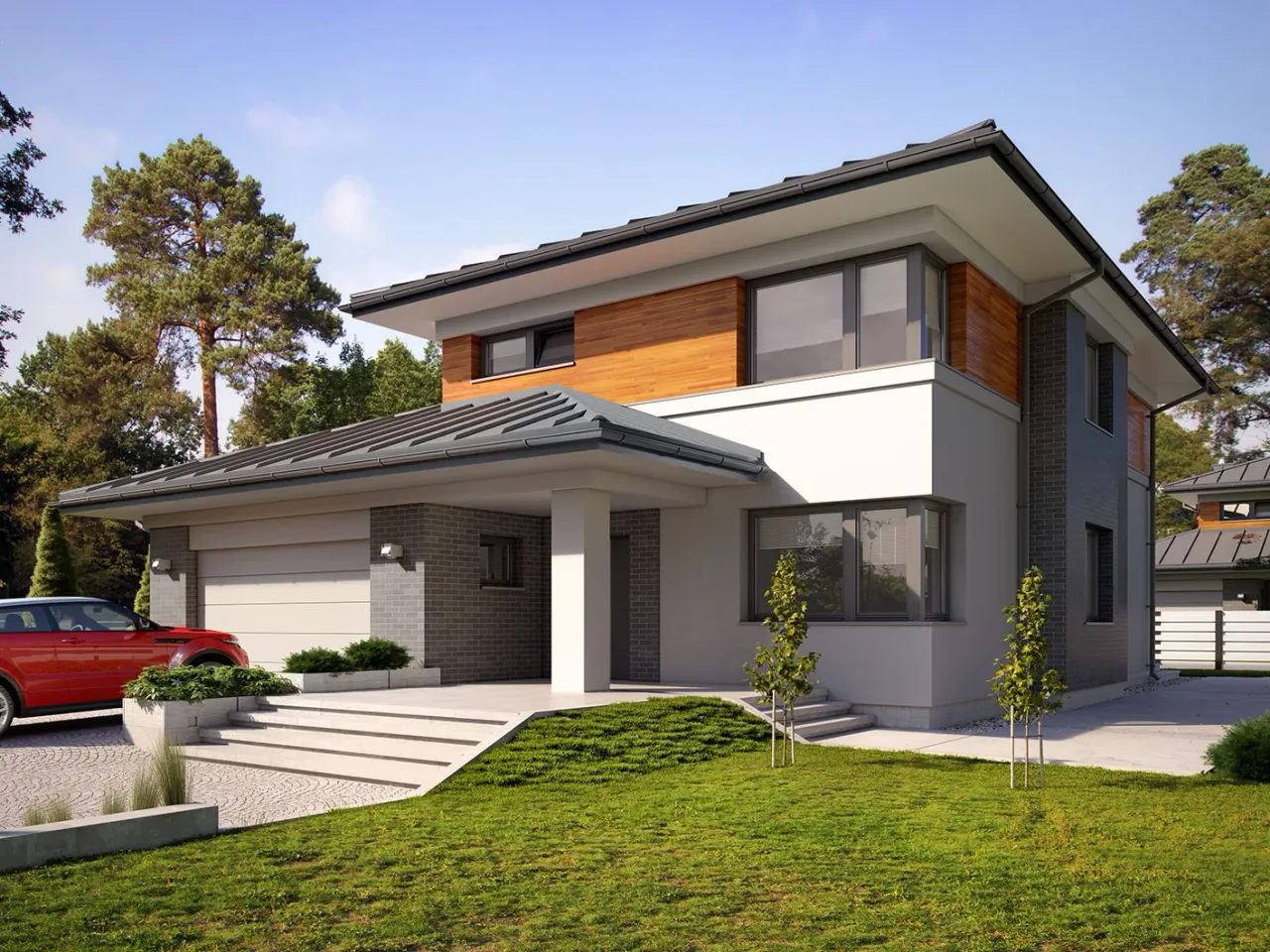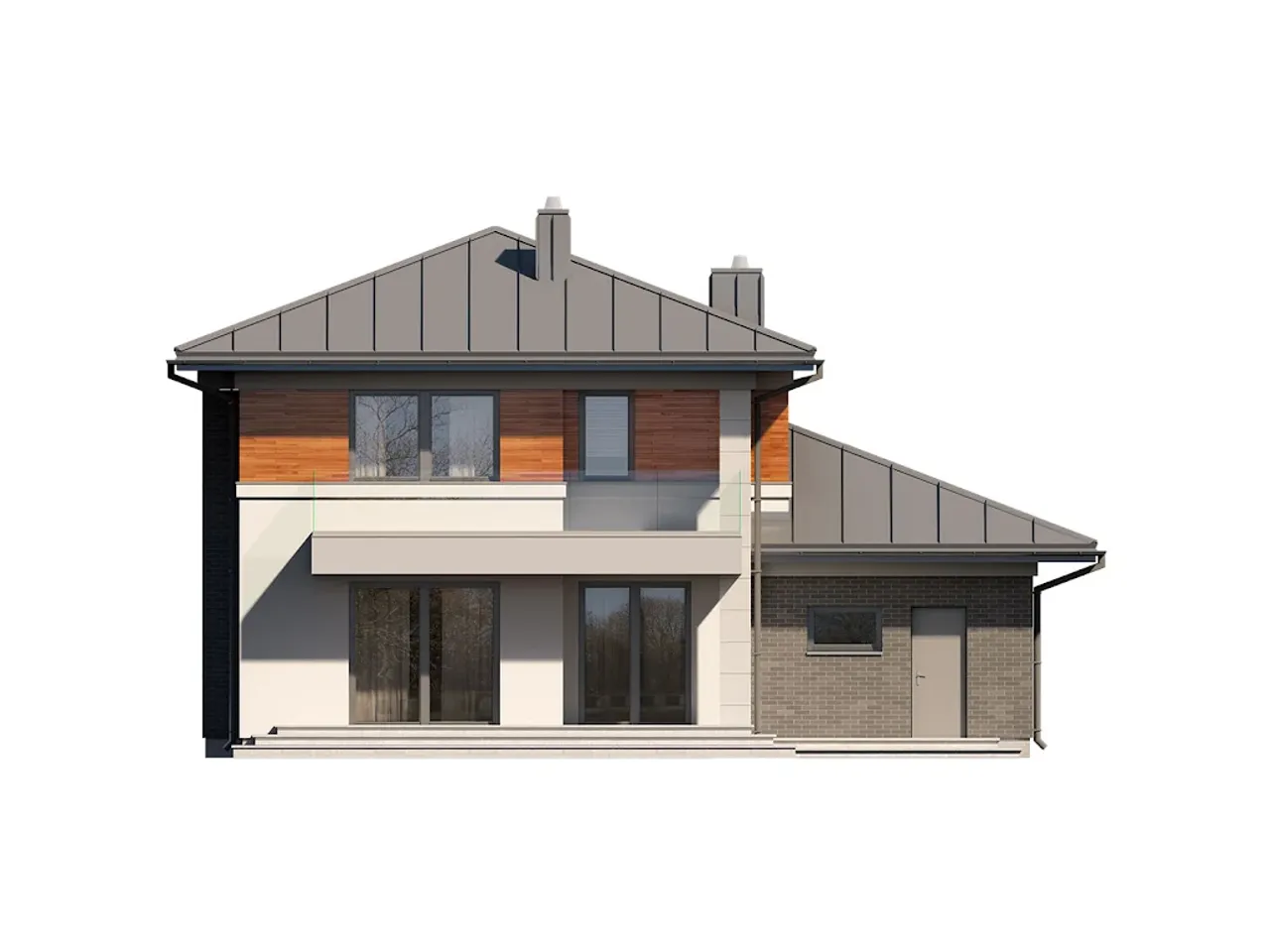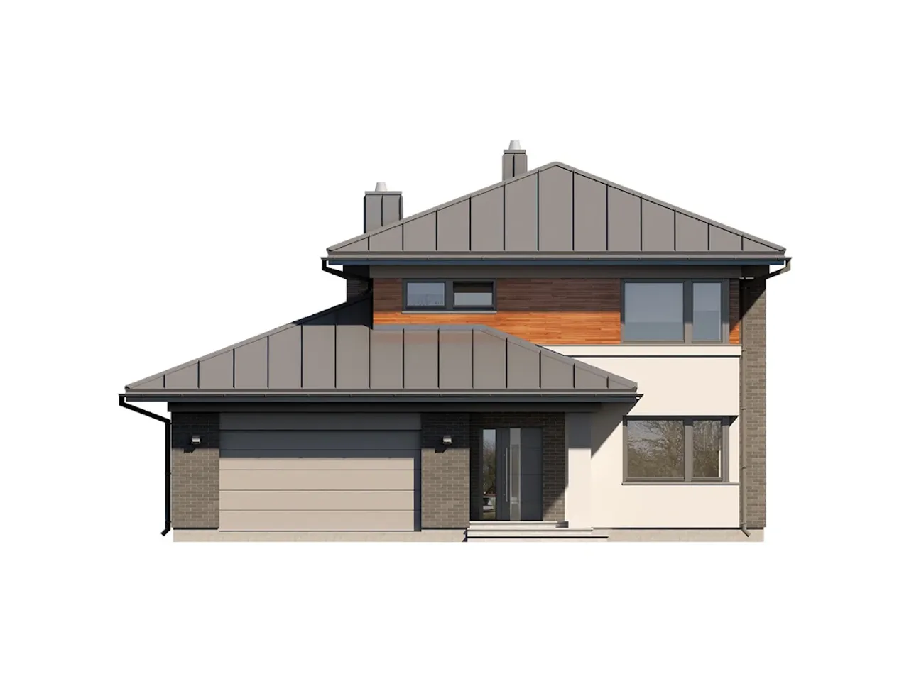 Nowoczesny dom dla 4-osobowej rodziny. Piętrowa rezydencja o optymalnej powierzchni użytkowej. Na parterze znajduje się otwarta dzienna przestrzeń, w której skład wchodzi salon,jadalnia i kuchnia. Główna sypialnia ma dodatkowo garderobę. Ten projekt to ponadczasowa klasyka.