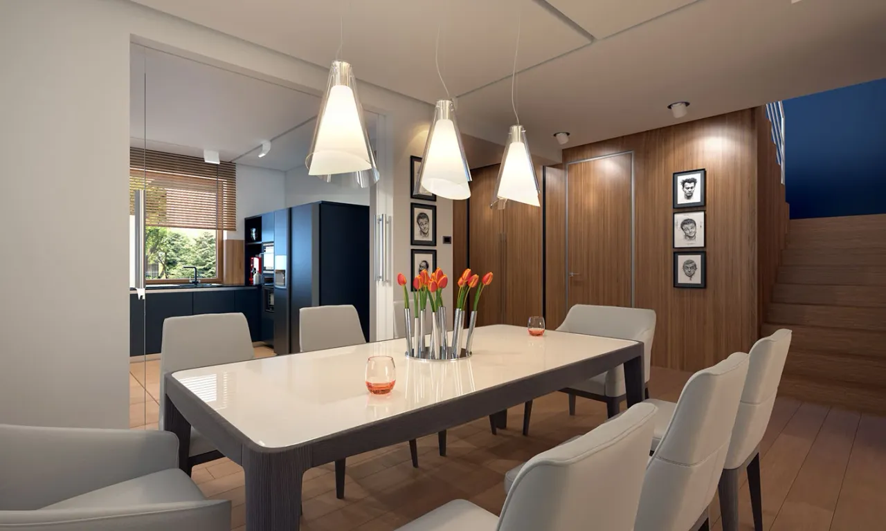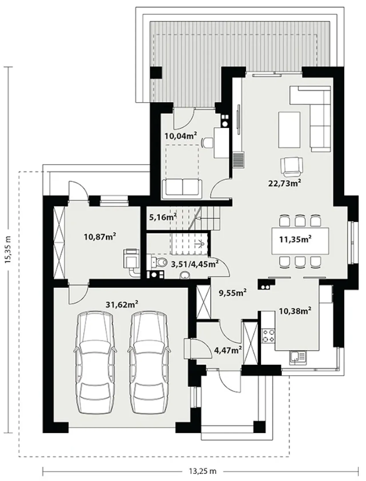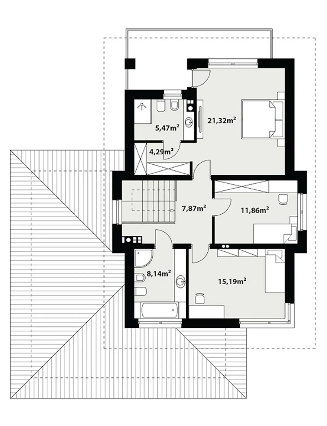 Nowoczesny dom dla 4-osobowej rodziny. Piętrowa rezydencja o optymalnej powierzchni użytkowej. Na parterze znajduje się otwarta dzienna przestrzeń, w której skład wchodzi salon,jadalnia i kuchnia. Główna sypialnia ma dodatkowo garderobę. Ten projekt to ponadczasowa klasyka.
