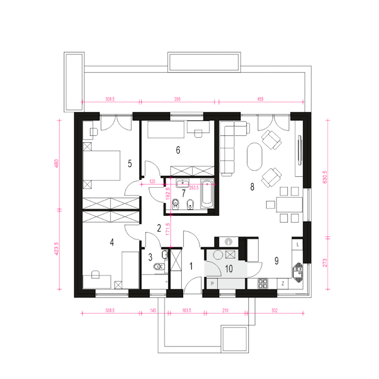 Wypełnij formularz i otrzymaj rysunki w pdf z dokładnymi wymiarami budynku i pomieszczeń (długość, szerokość, wysokość) dla projektu Kalcyt IV bez garażu B