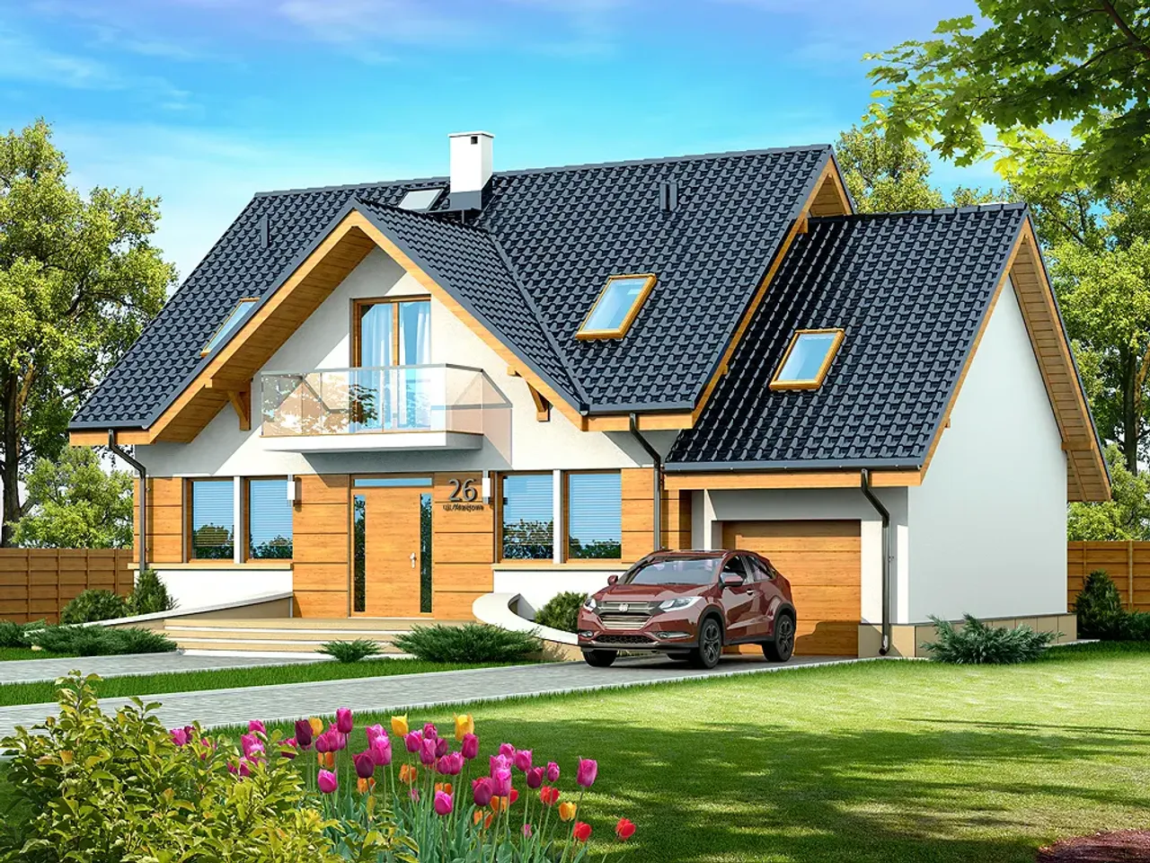 Karmelita Gold to bardzo ciekawy, funkcjonalny dom przeznaczony dla 3-6 osobowej rodziny o eleganckiej formie i współczesnej estetyce. Gotowy projekt domu Karmelita Gold to budynek parterowy z użytkowym poddaszem, niepodpiwniczony, z garażem jednostanowiskowym. Na parterze zlokalizowana jest obszerna strefa dzienna składająca się z kuchni, jadalni oraz salonu otwartego na taras i ogród.