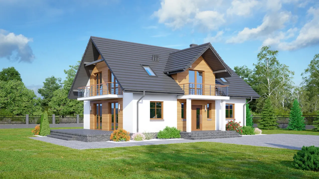 Projekt Karowice m1x to dom, który łączy nowoczesne trendy z użytecznością. Przemyślany rozkład sześciu pokoi stwarza komfortową przestrzeń do życia dla 4-6 osobowej rodziny. Parter to część dzienna - salon z miejscem na kominek, otwarta kuchnia ze spiżarnią oraz bezpośrednie wyjście na przestronny taras. Poddasze doświetlają stylowe lukarny, a ściana kolankowa o wysokości 0,86 m ułatwia aranżację pomieszczeń pod dachem.