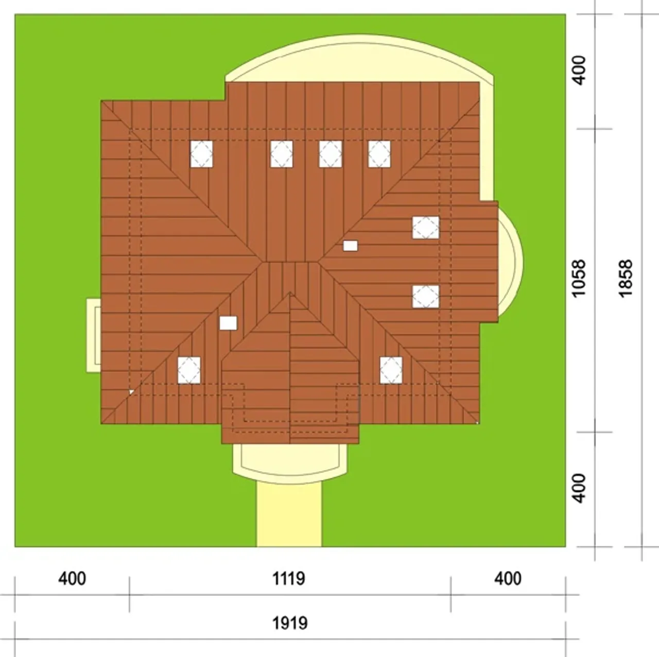 4. Rzut dachu – dokładnie zwymiarowany pokazujący kształt dachu i jego kąt nachylenia ,rozmieszczenie okien połaciowych, lukarn oraz rur spustowych.