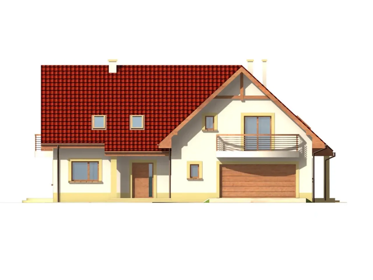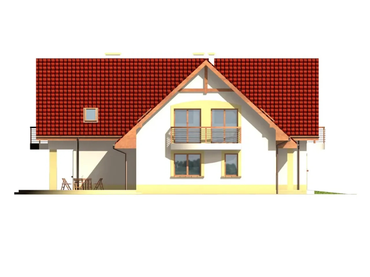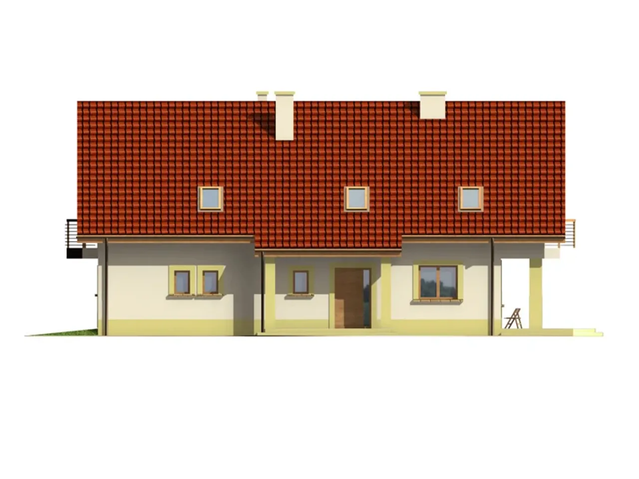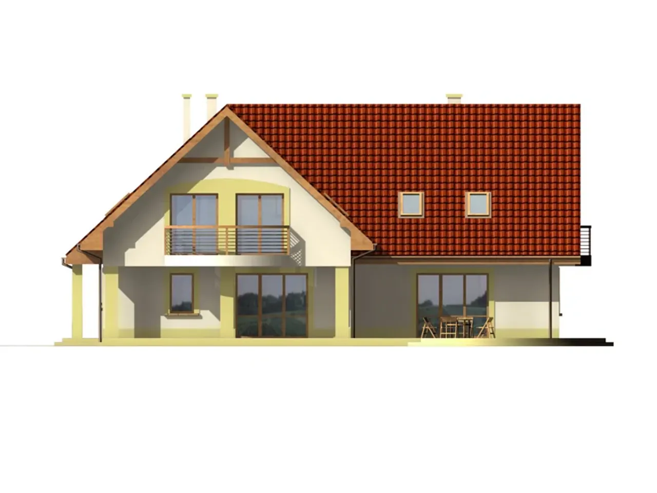 Projekt domu Klaudia 2rodziny to duży dom o kształtkej bryle z wbudowanym dwustanowiskowym garażem. Dom przykryty wielospadowym dachem. Przeznaczony dla dwóch rodzin. Elewację zdrobi bardzo ładny taras znajdujący się z tyłu domu. Według projektu domu Klaudia 2rodziny dom podzielony jest na dwie strefy mieszkalne, większą i mniejszą, każda z oddzielnym wejściem. Łączy je wspólny taras i garaż. Na parterze domu znajdują się dwie kuchnie oraz salon z jadalnią oraz pokój dzienny. Na poddaszu ulokowano pięc sypialni oraz dwie łazienki.
