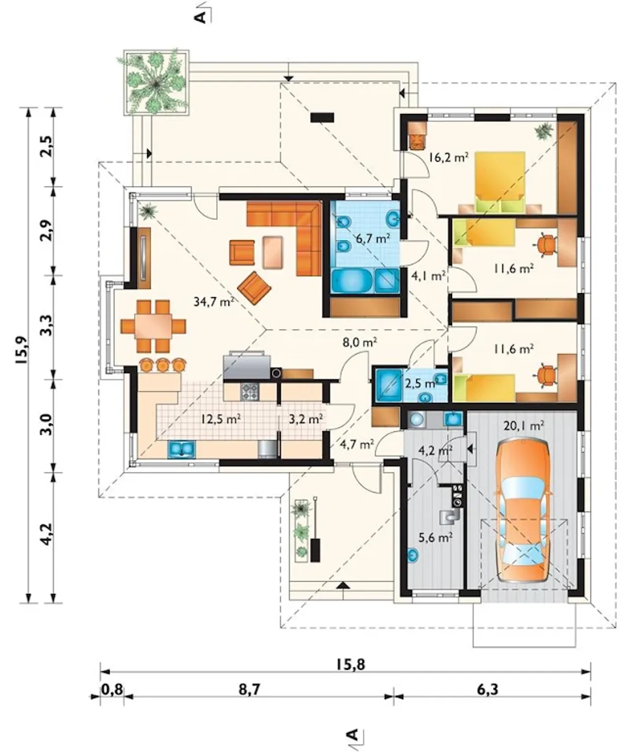 - elewacje - pokazują dokładny wygląd domu od frontu, z tyłu i z boków