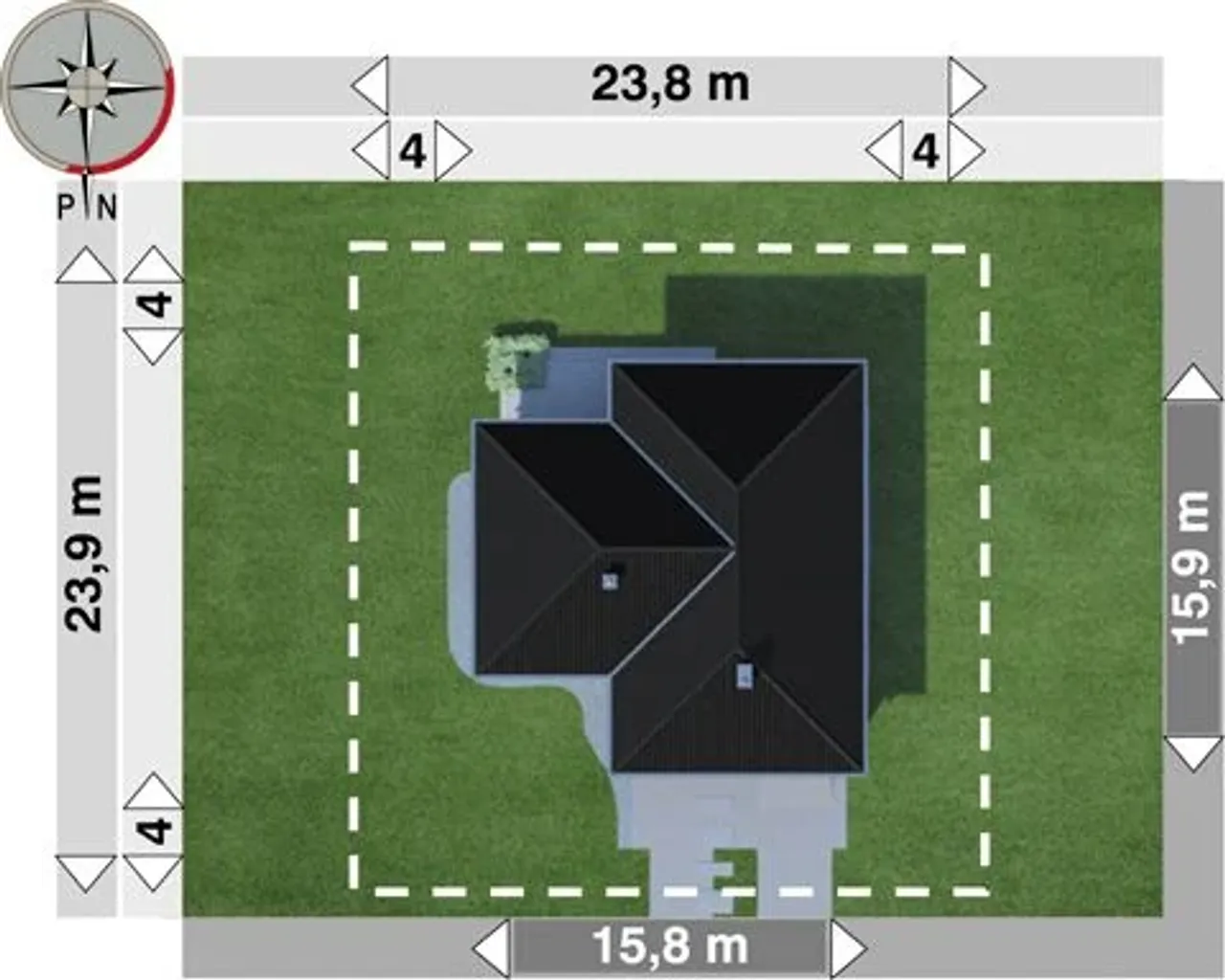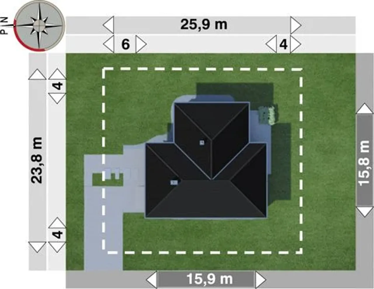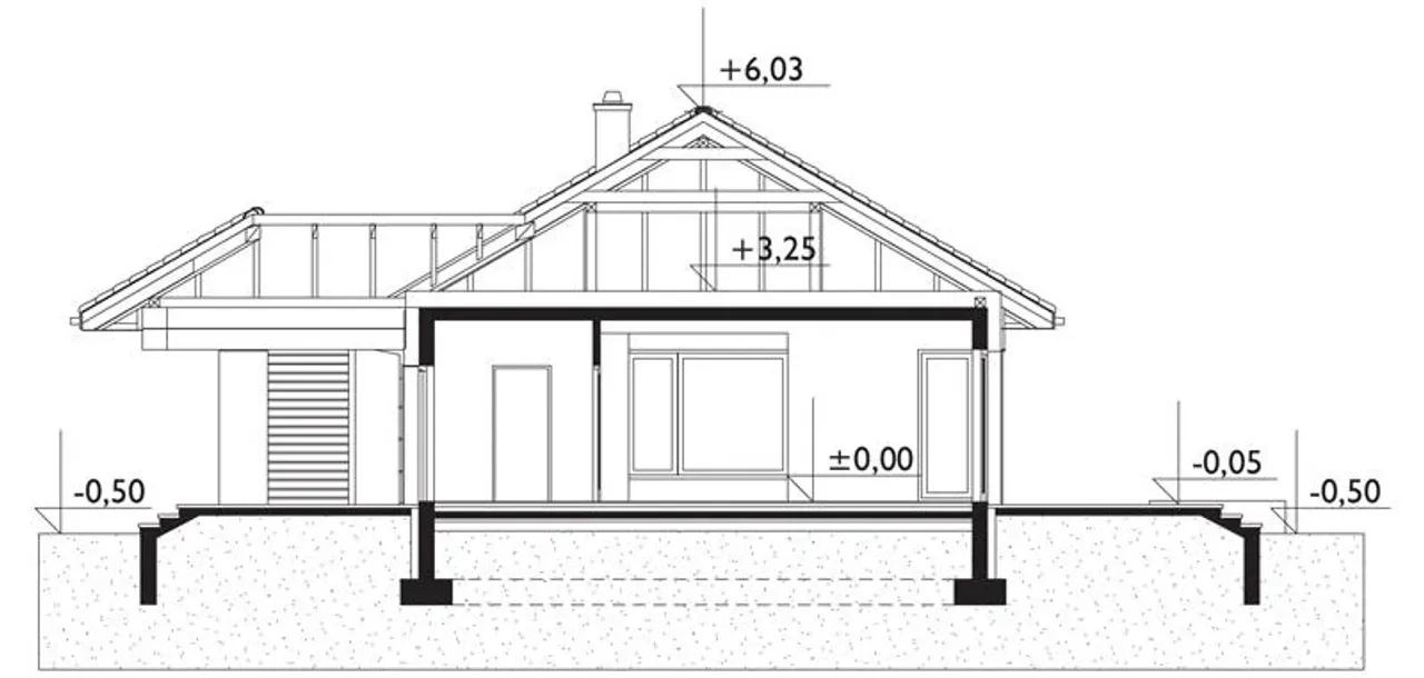 - rzut dachu - ukazuje jego kształt, wymiary, kąt nachylenia połaci, rozmieszczenie okien połaciowych, lukarn, świetlików i rur spustowych, pokazuje rozmieszczenie kominów i informuje o sposobie odwodnienia: rozmieszczeniu i rozmiarach rynien