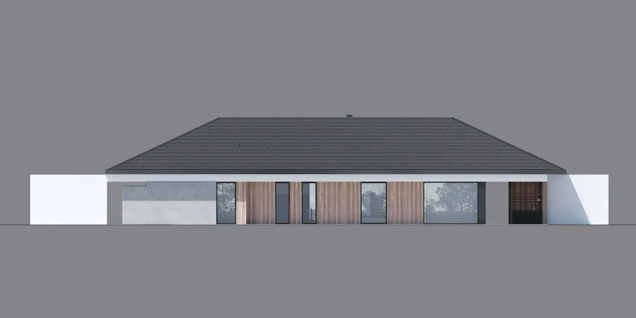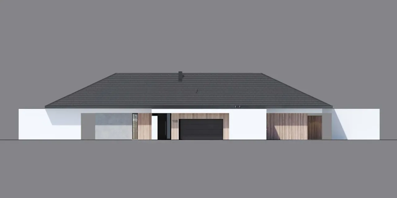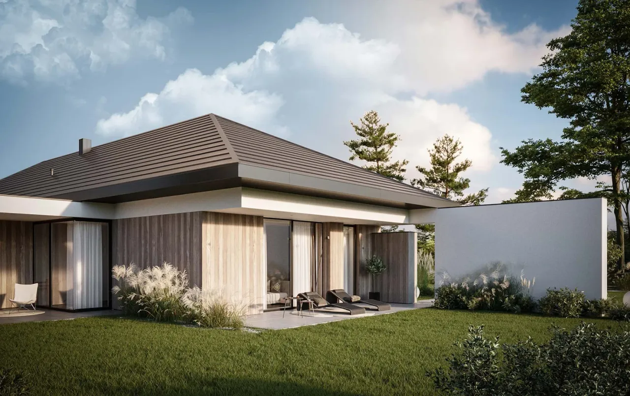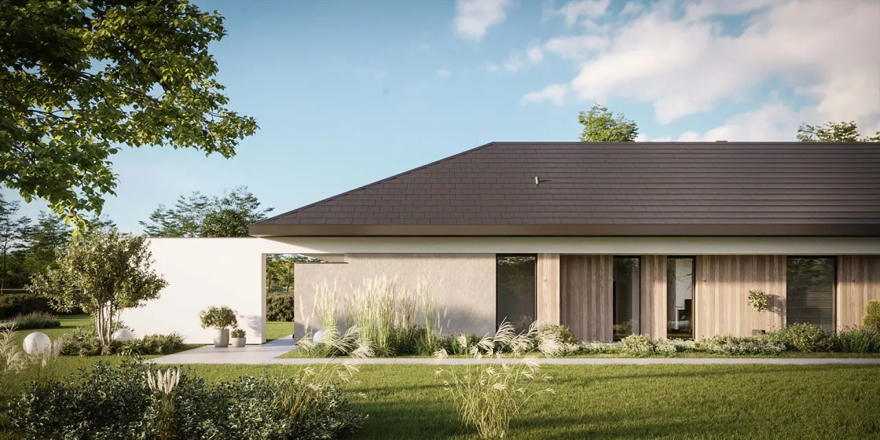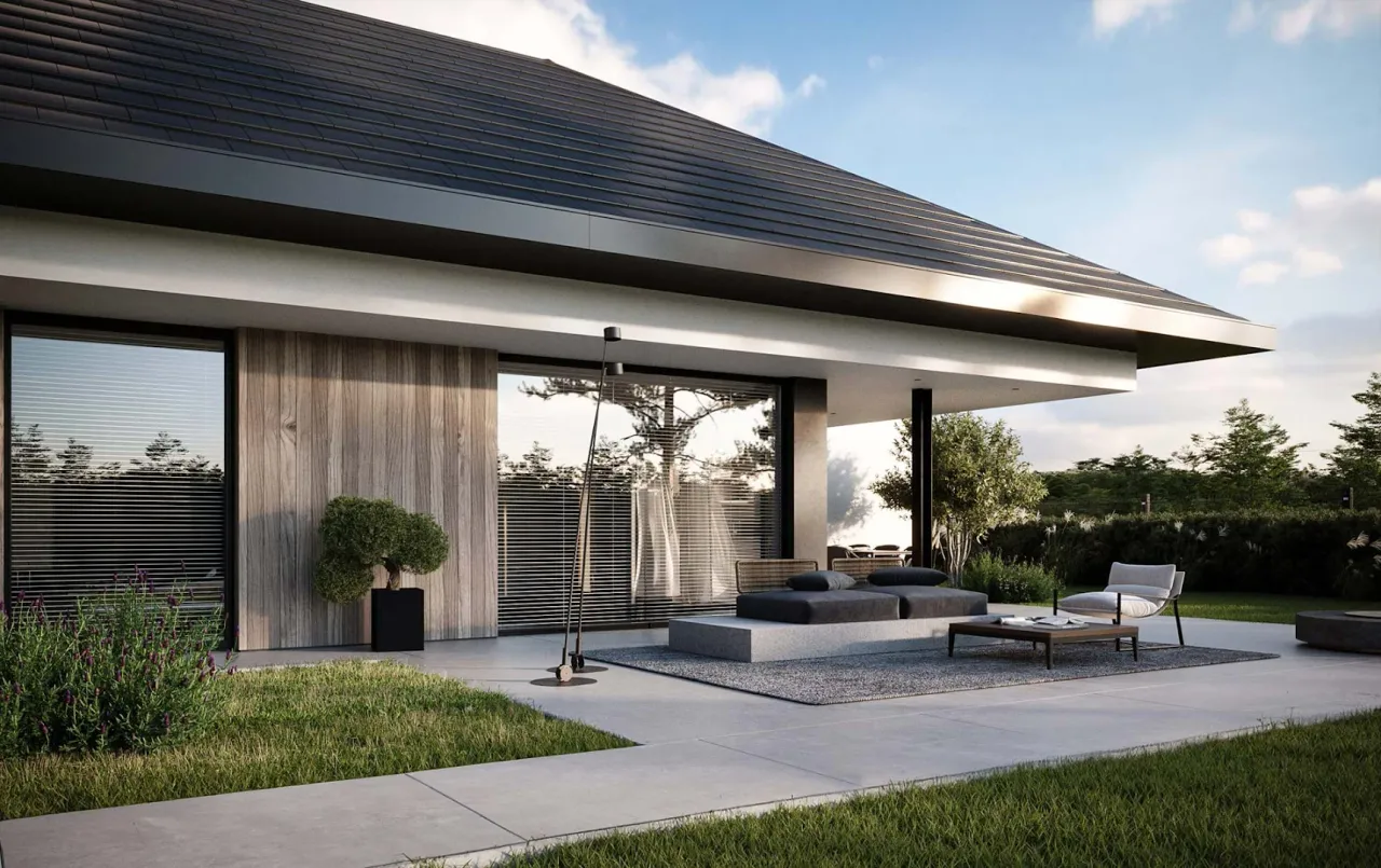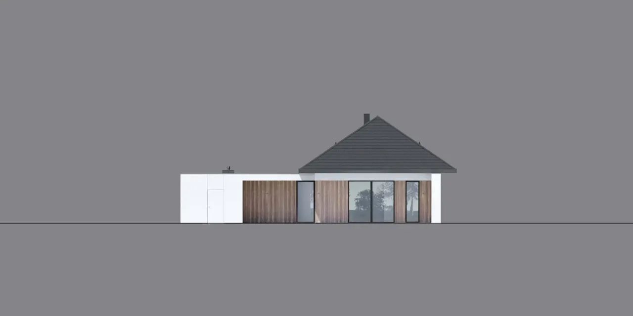 - Elewacja: tynk silikonowy połączony z deskami elewacyjnymi.
