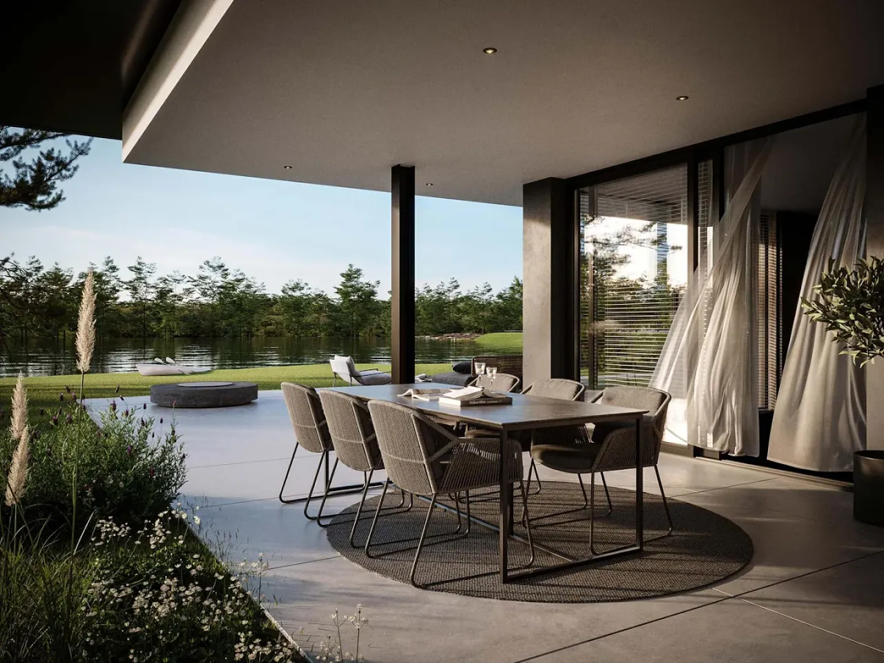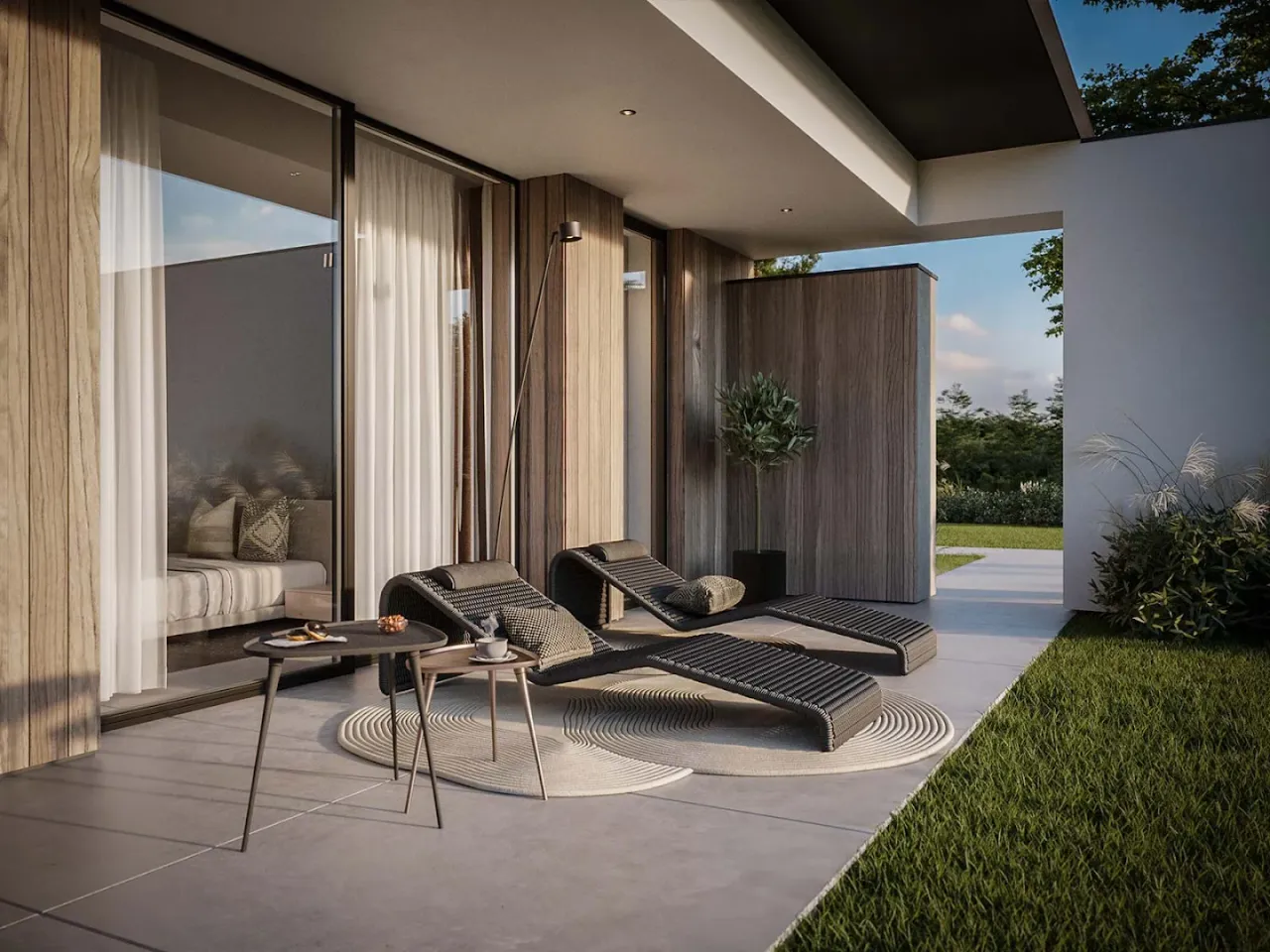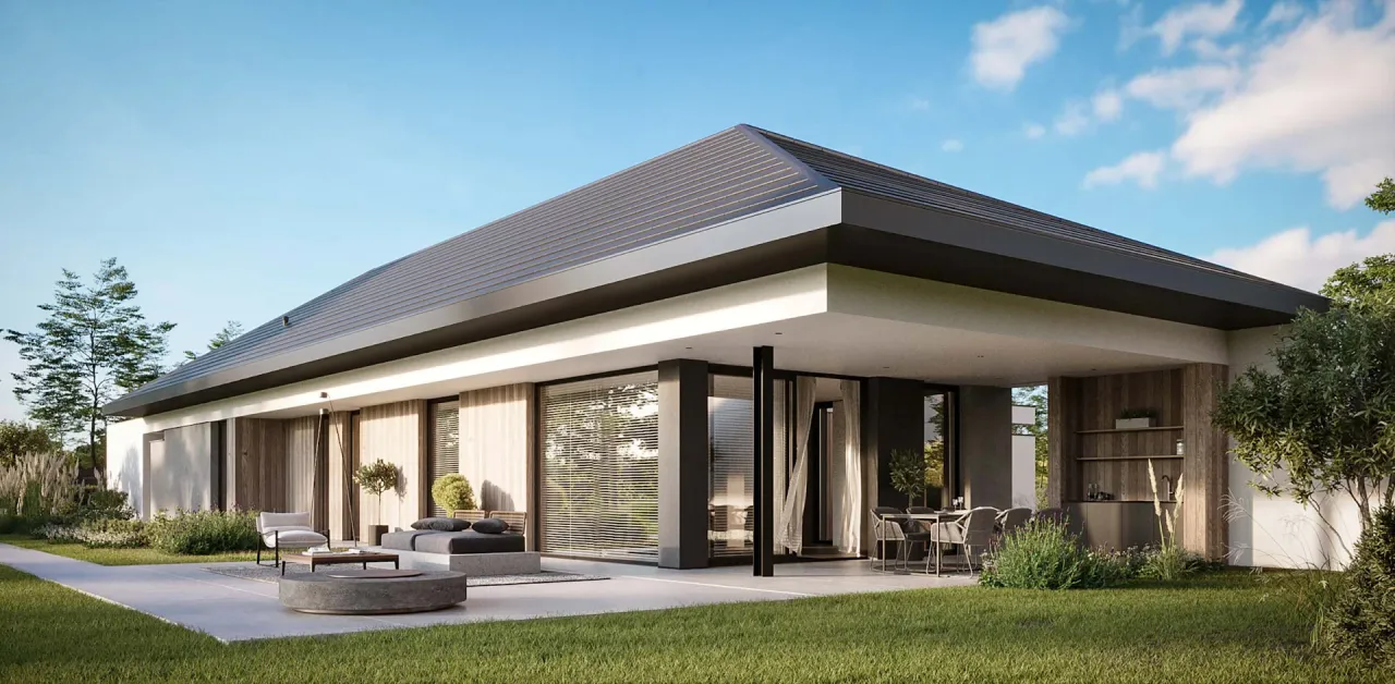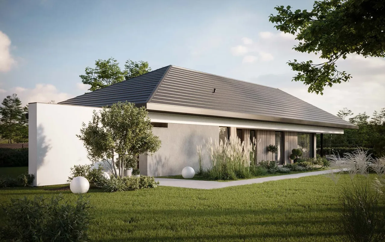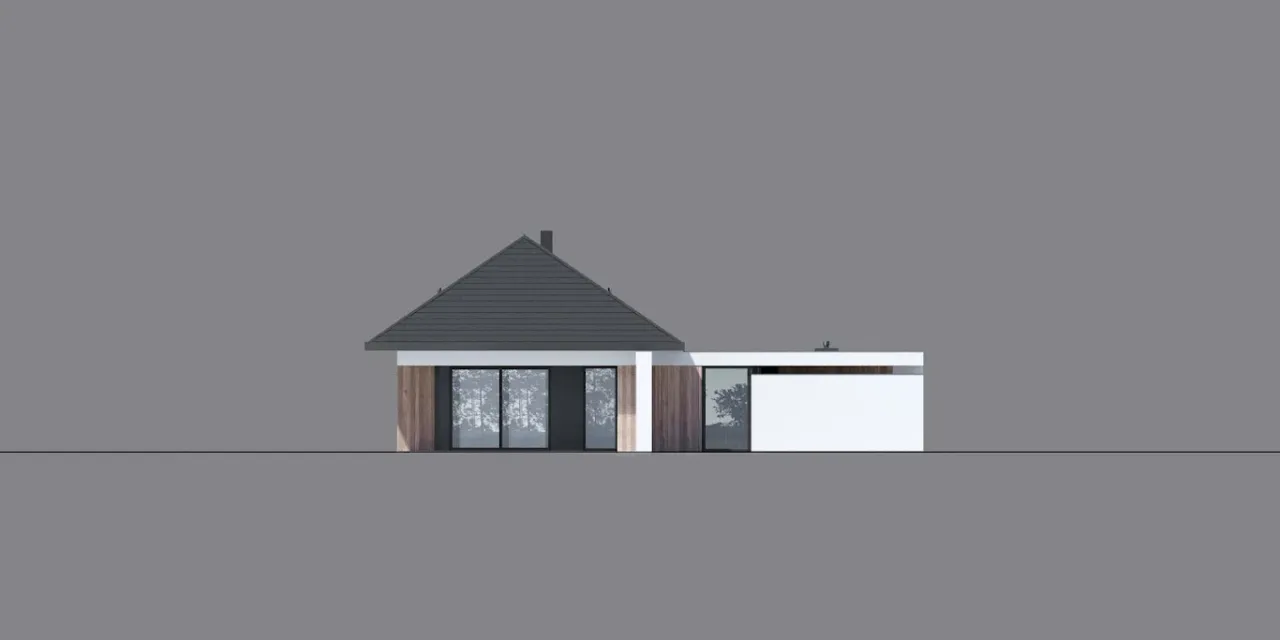 - Elewacja: tynk silikonowy połączony z deskami elewacyjnymi.