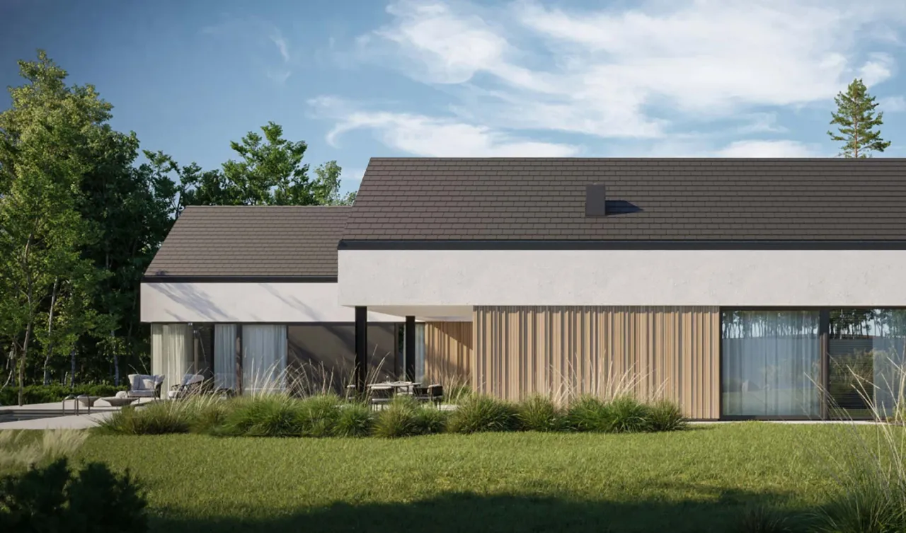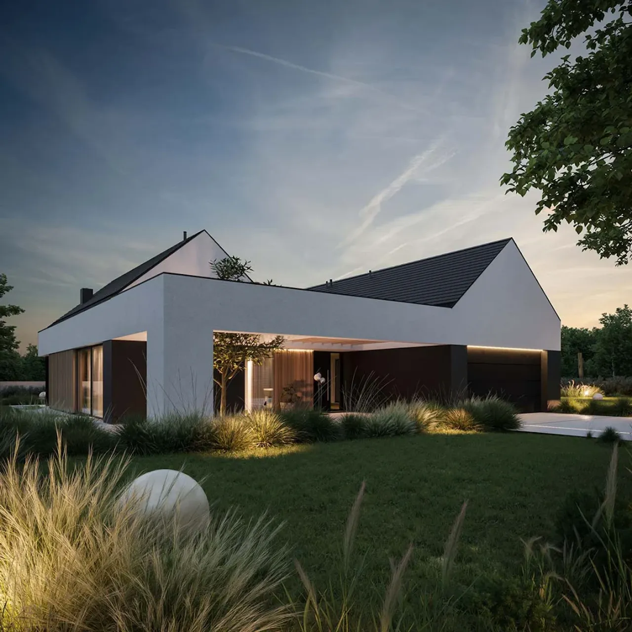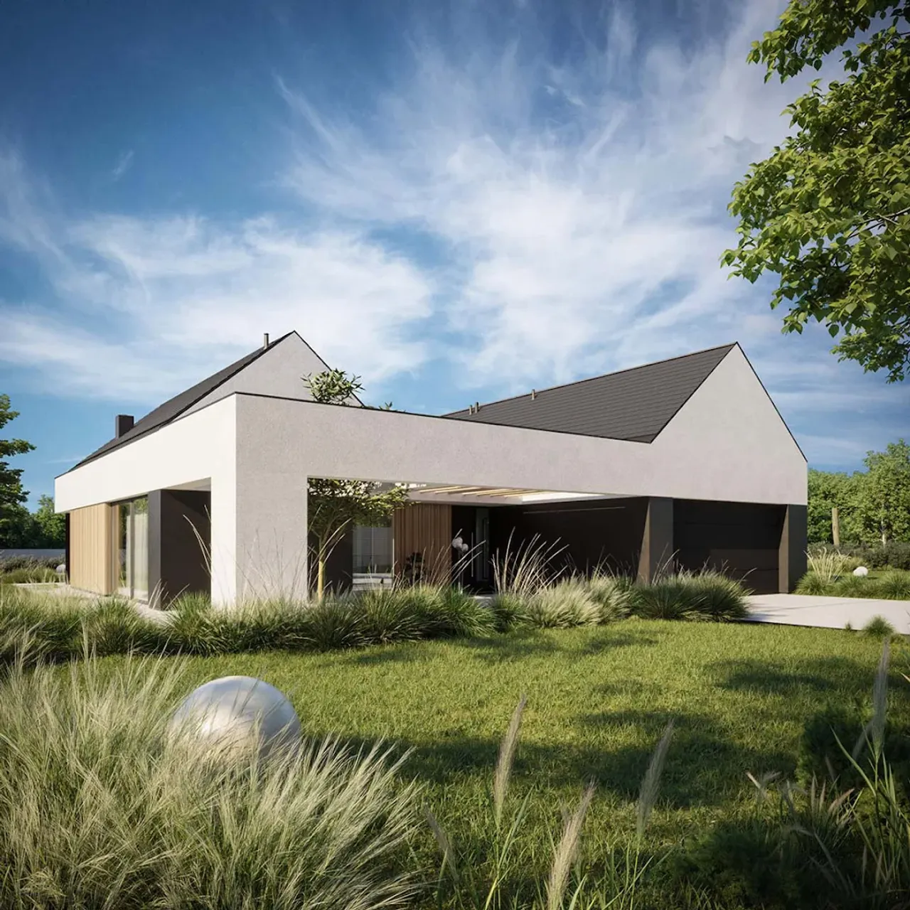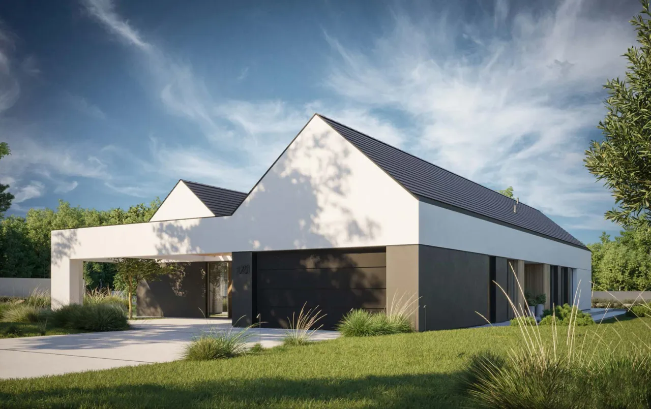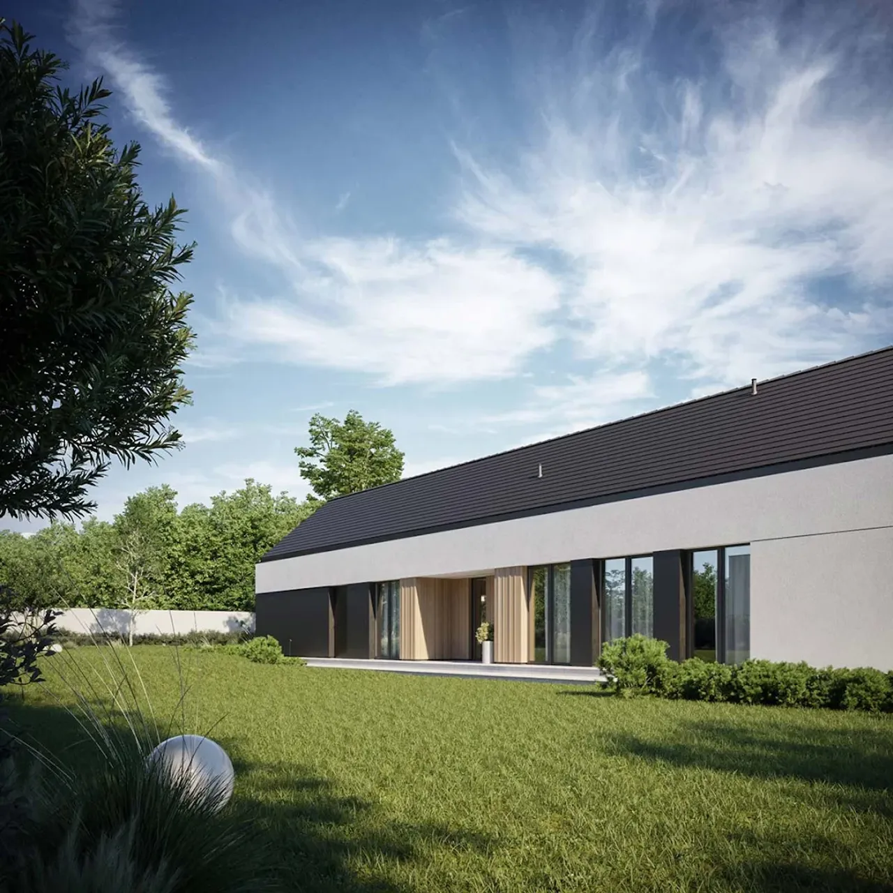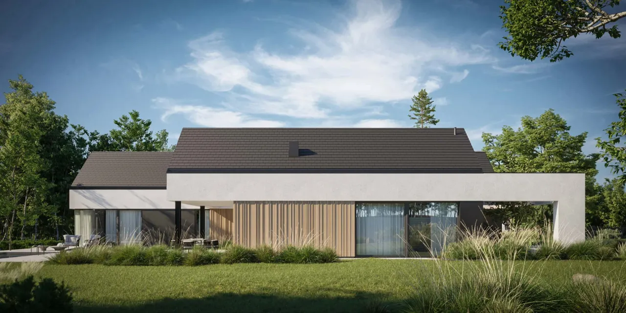 - Elewacja: tynk silikonowy połączony z deską elewacyjną.