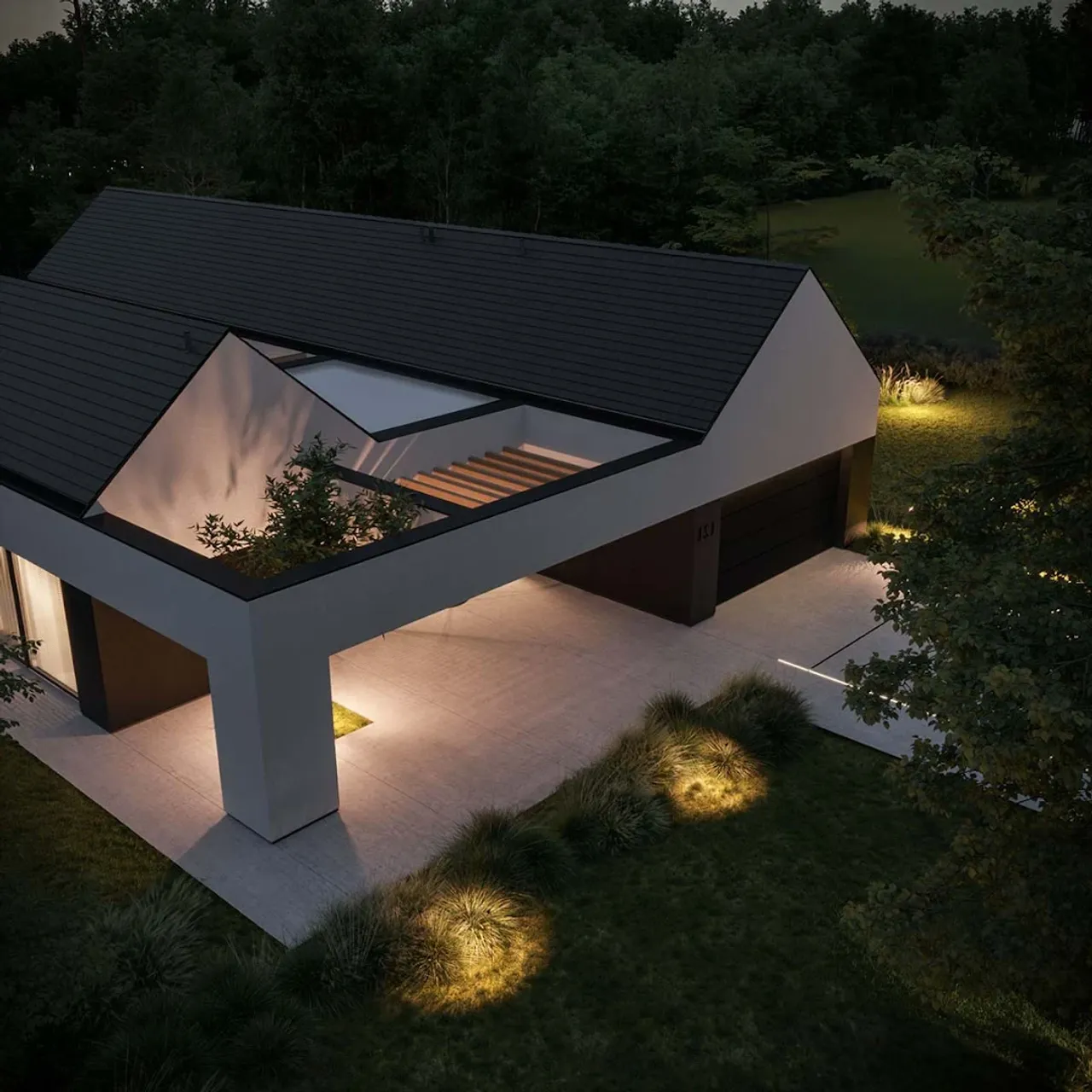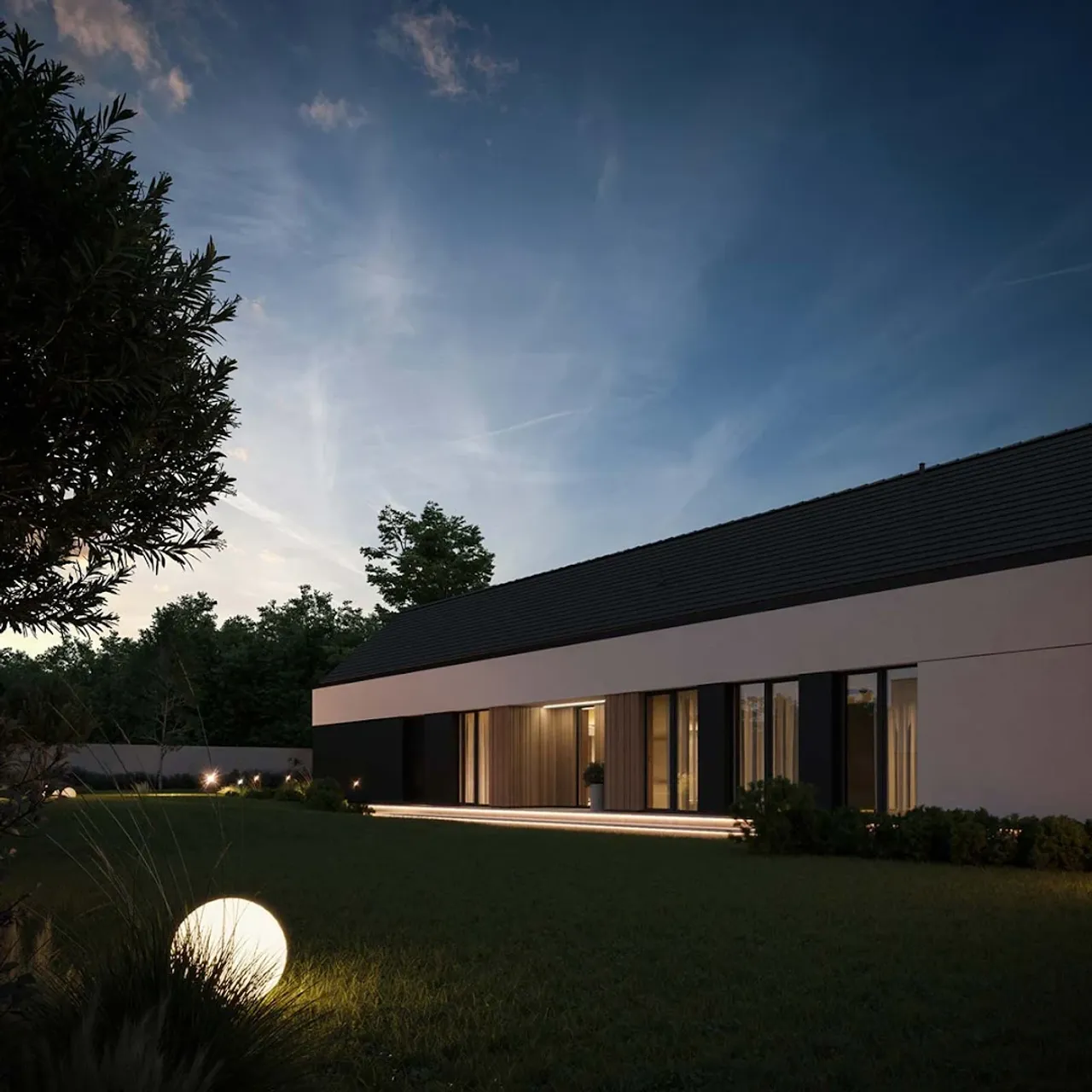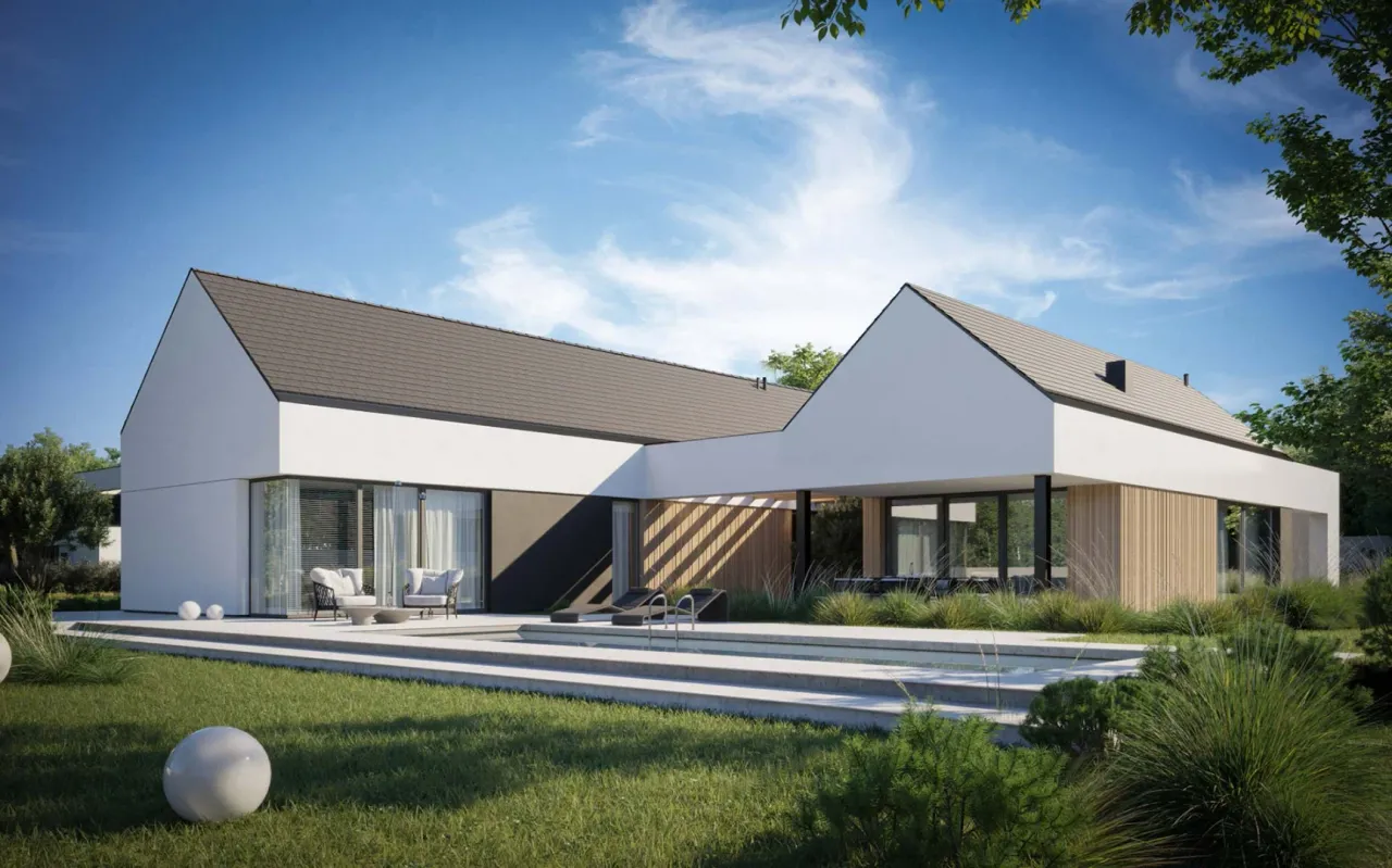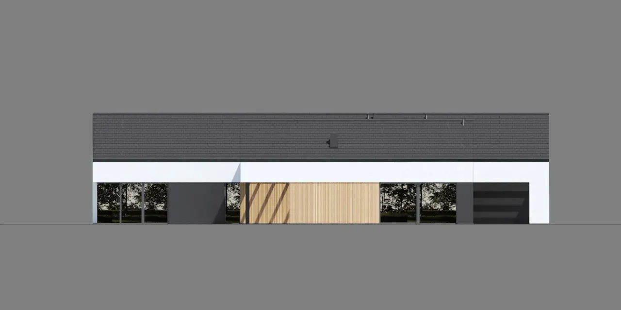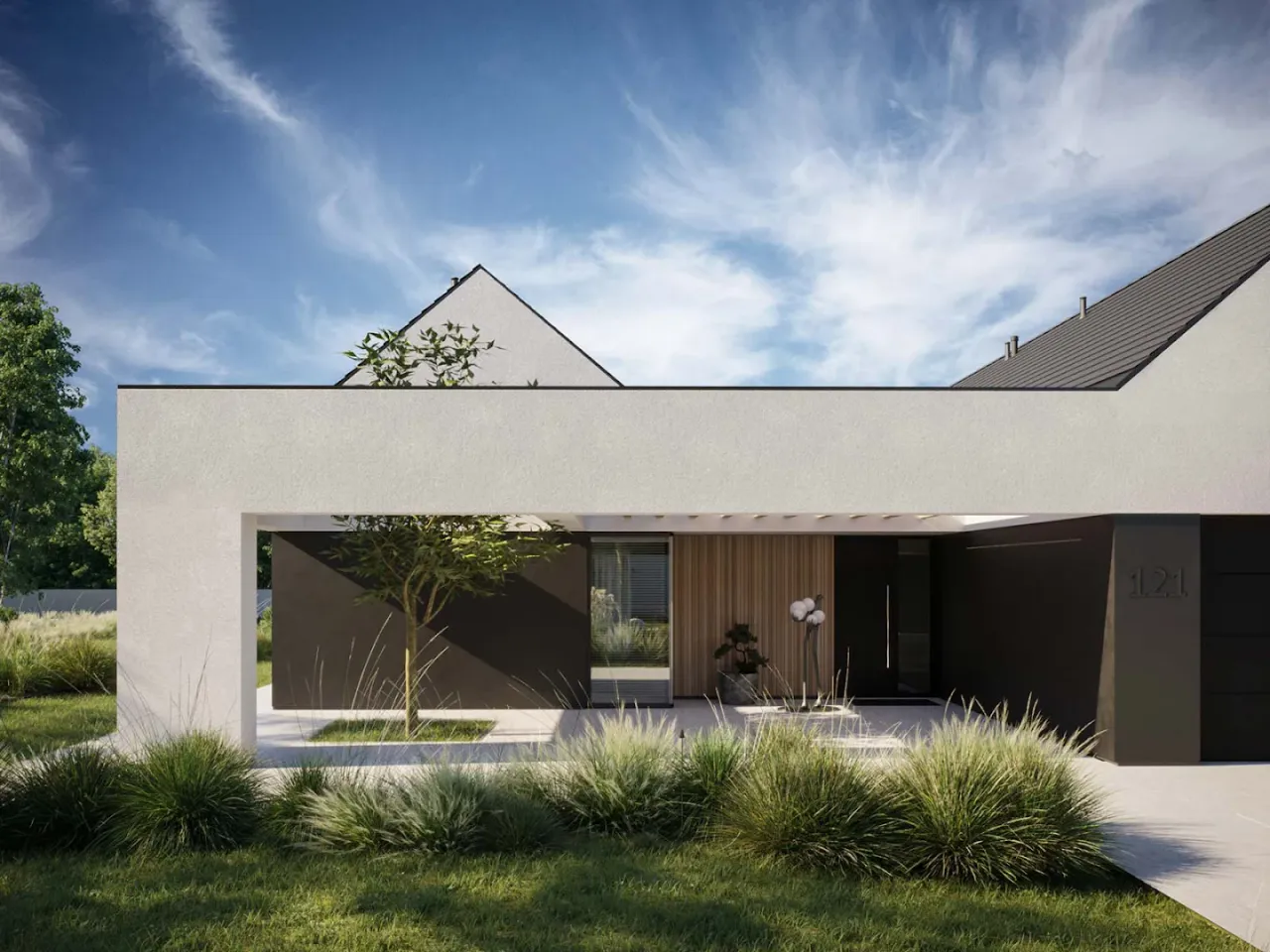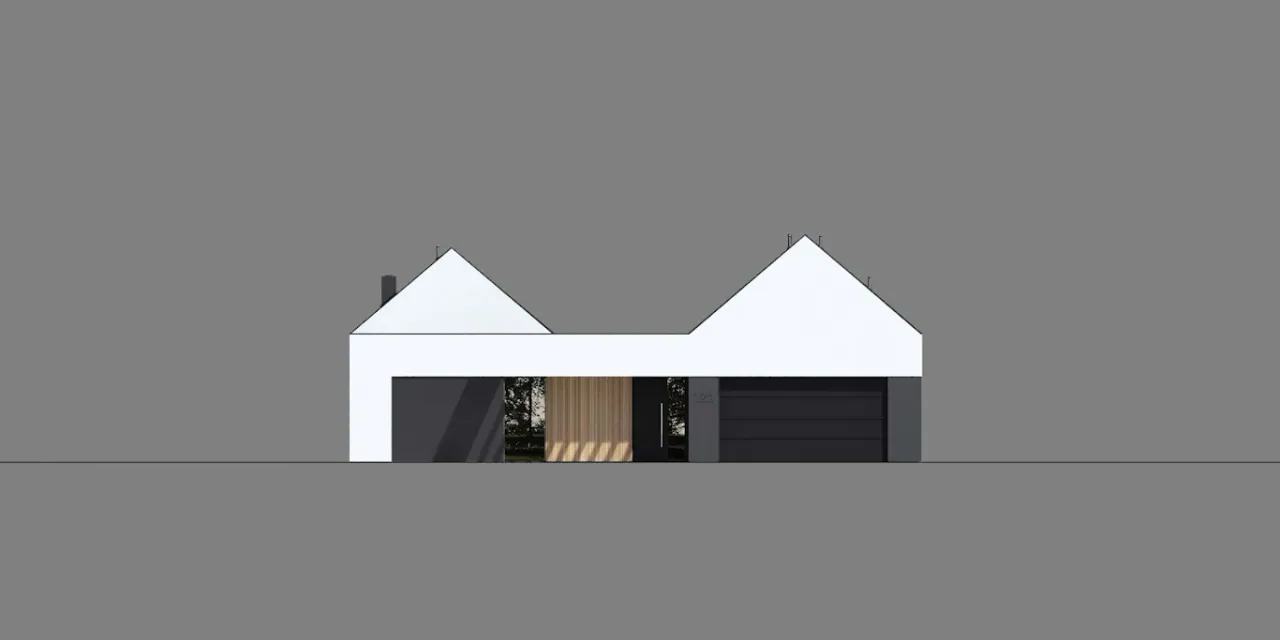 - Elewacja: tynk silikonowy połączony z deską elewacyjną.