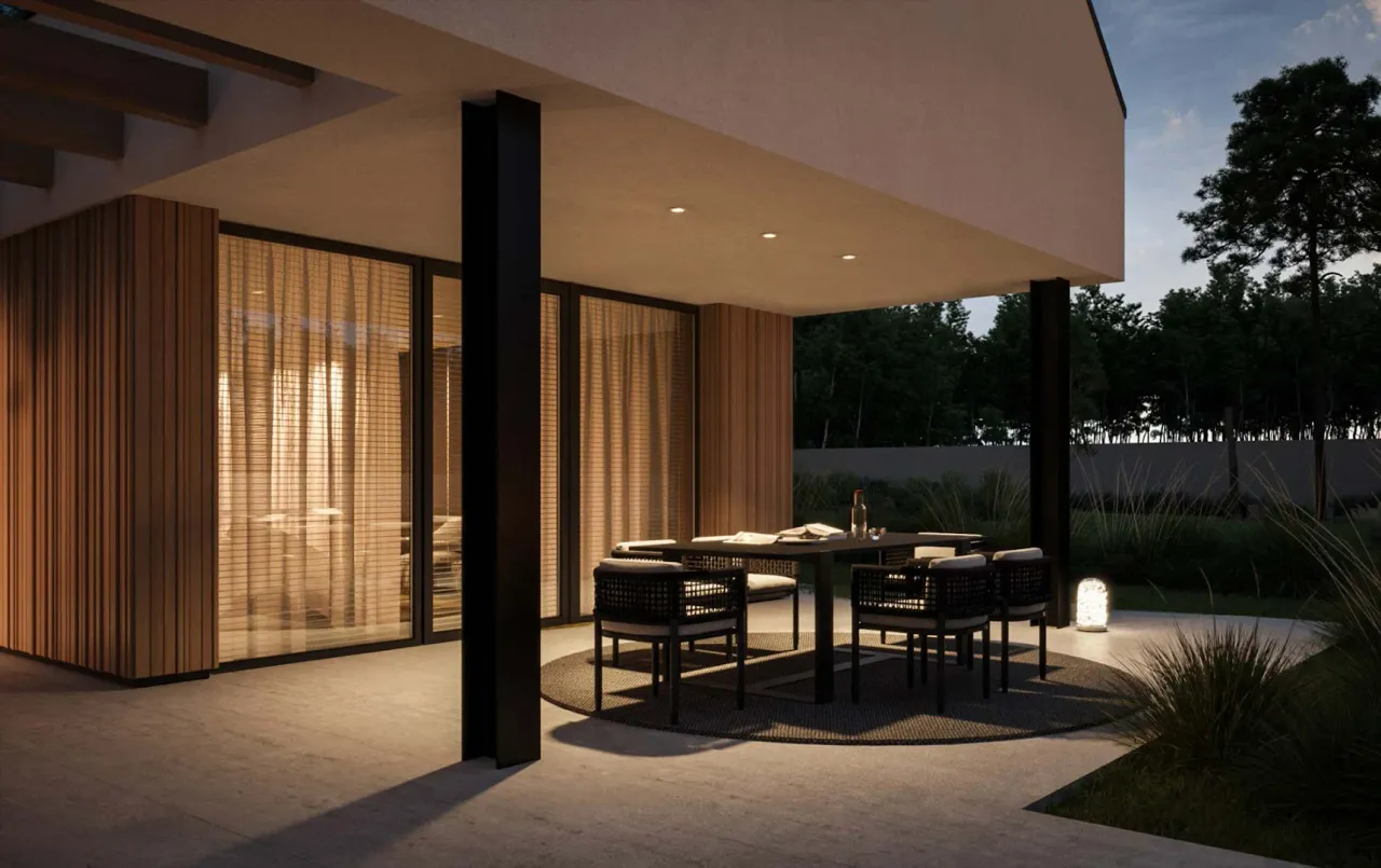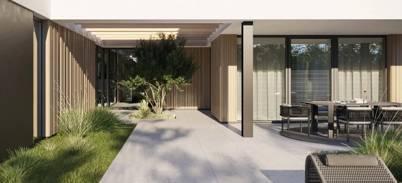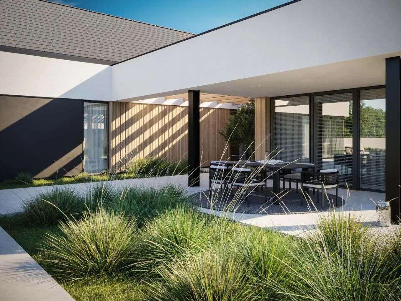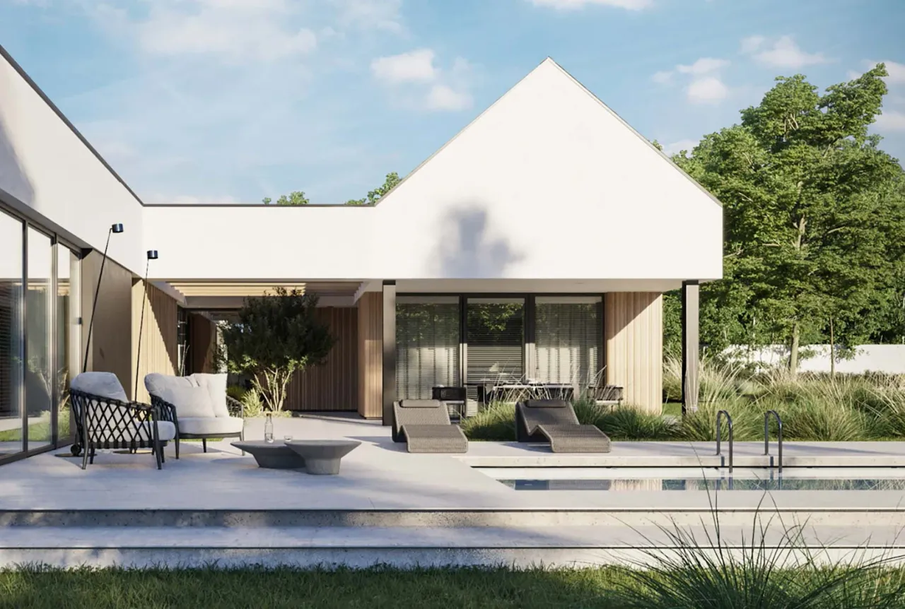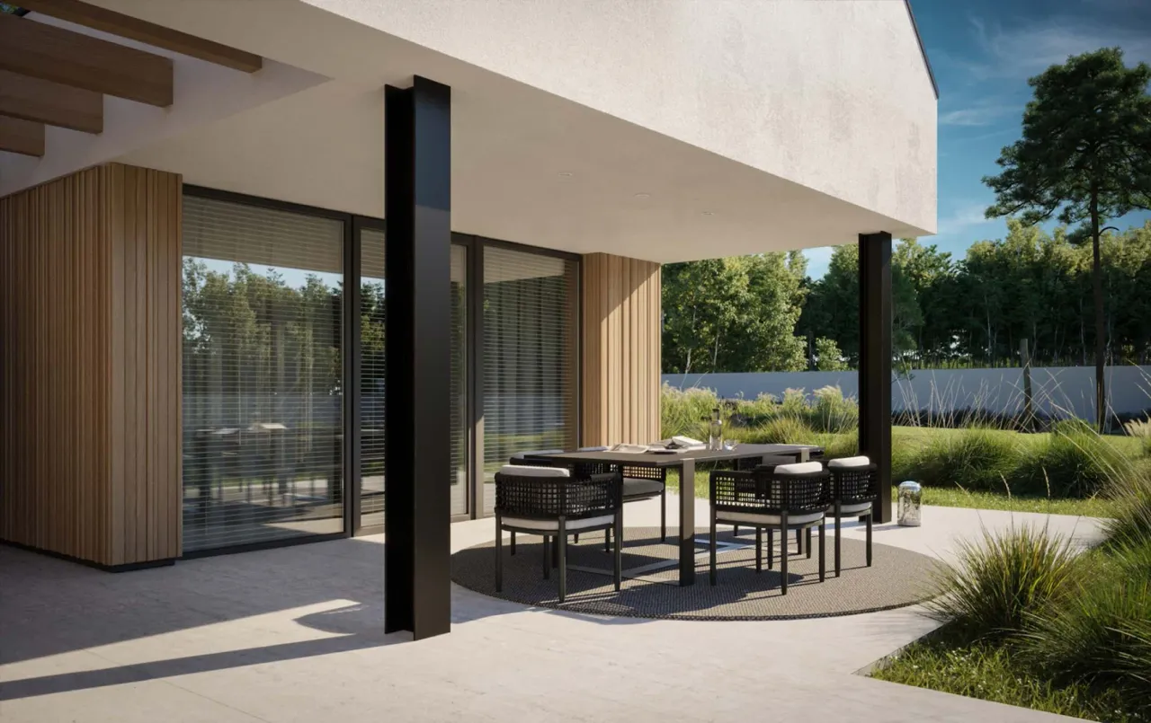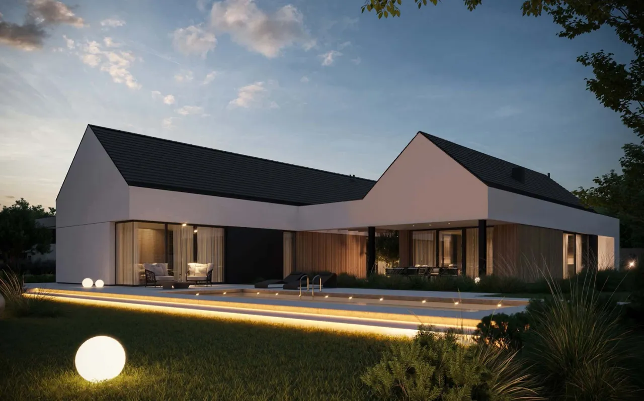 - Elewacja: tynk silikonowy połączony z deską elewacyjną.