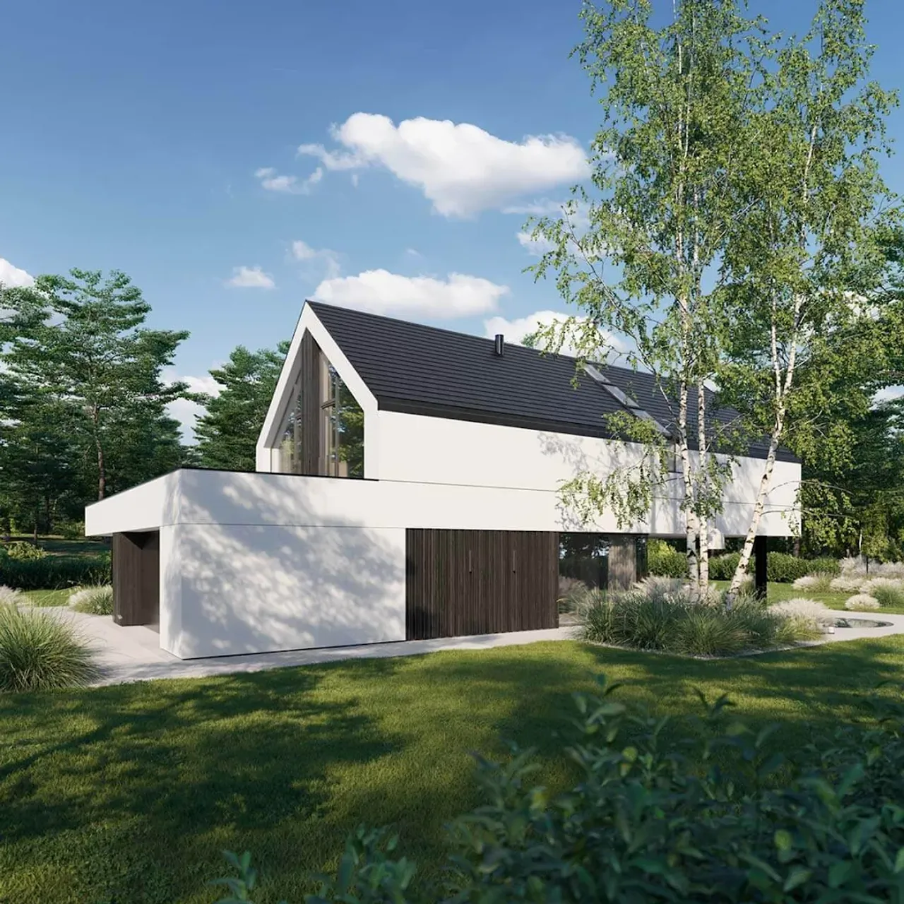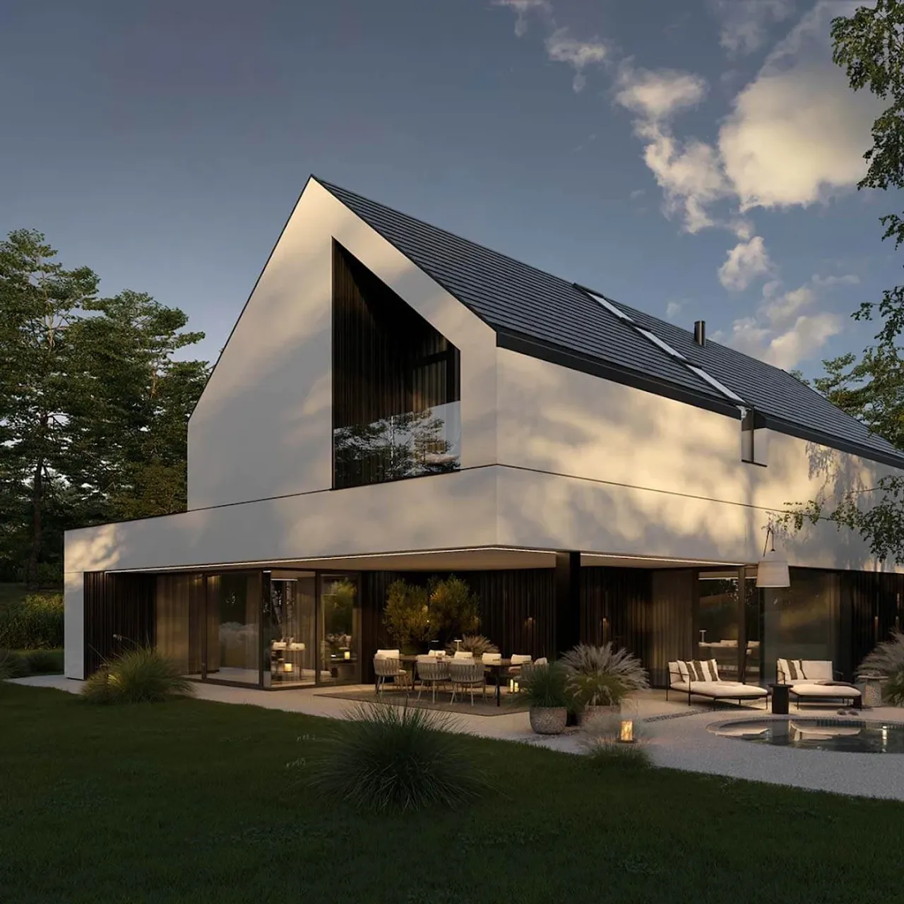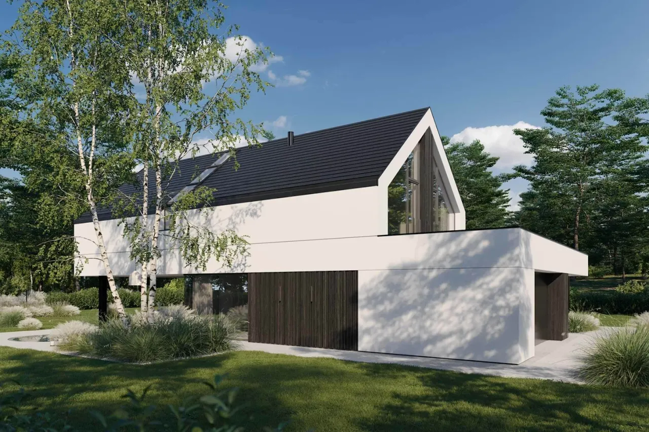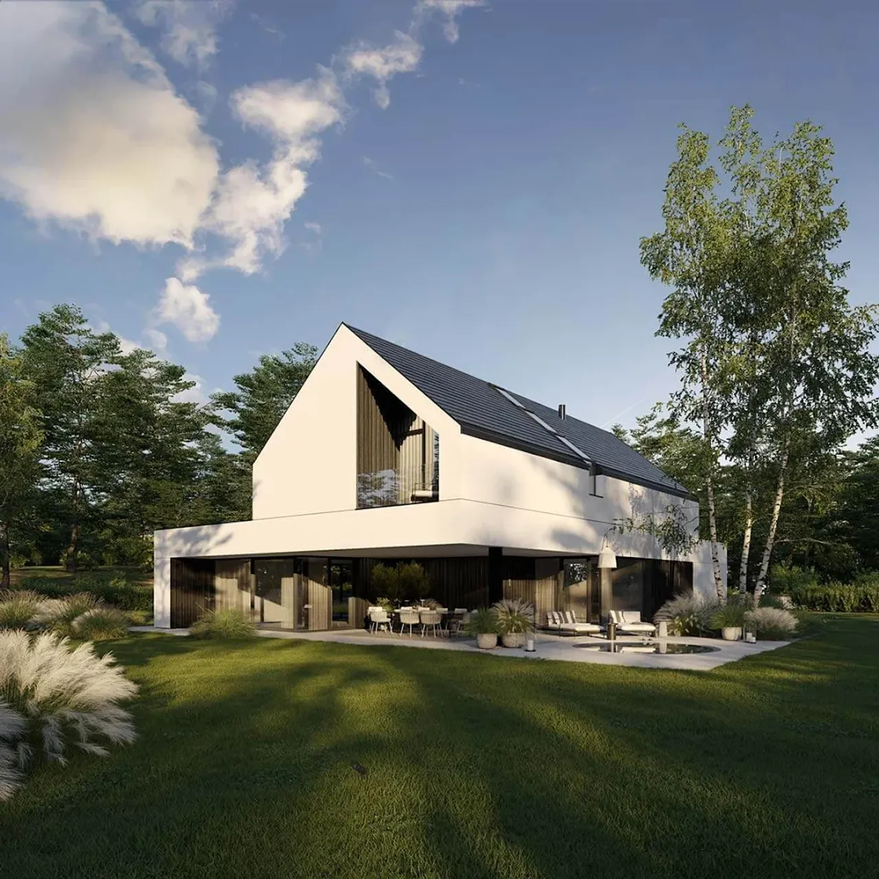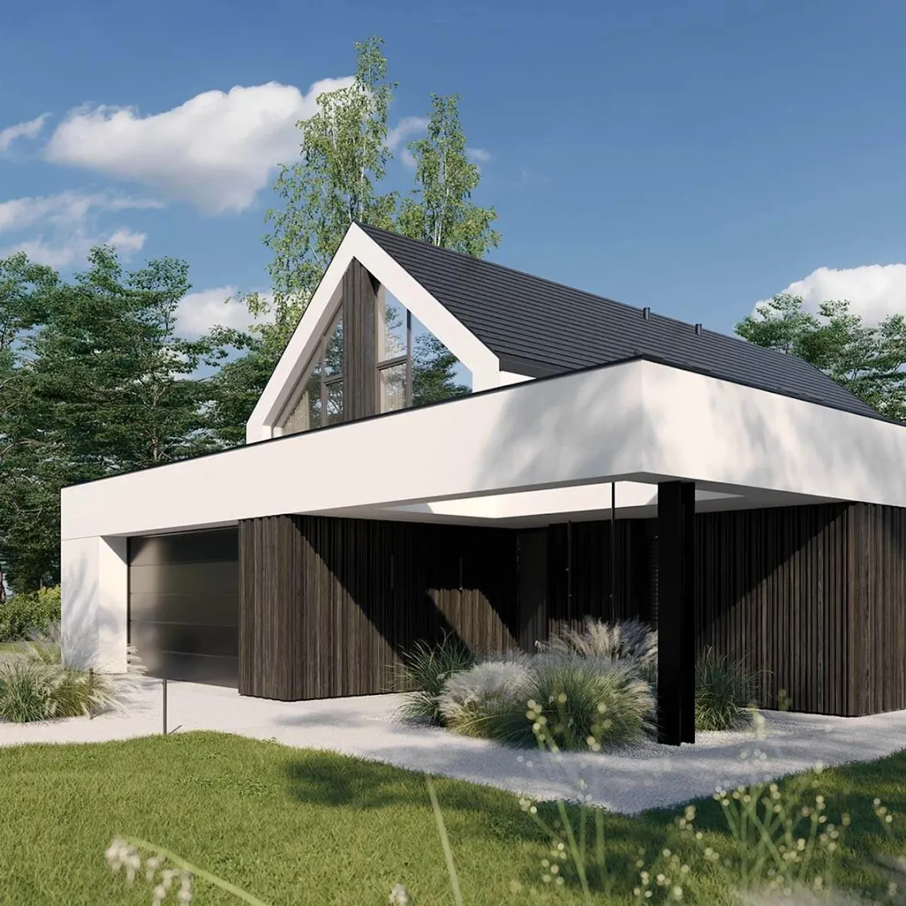 - Elewacja: tynk silikonowy połączony z deską elewacyjną.
