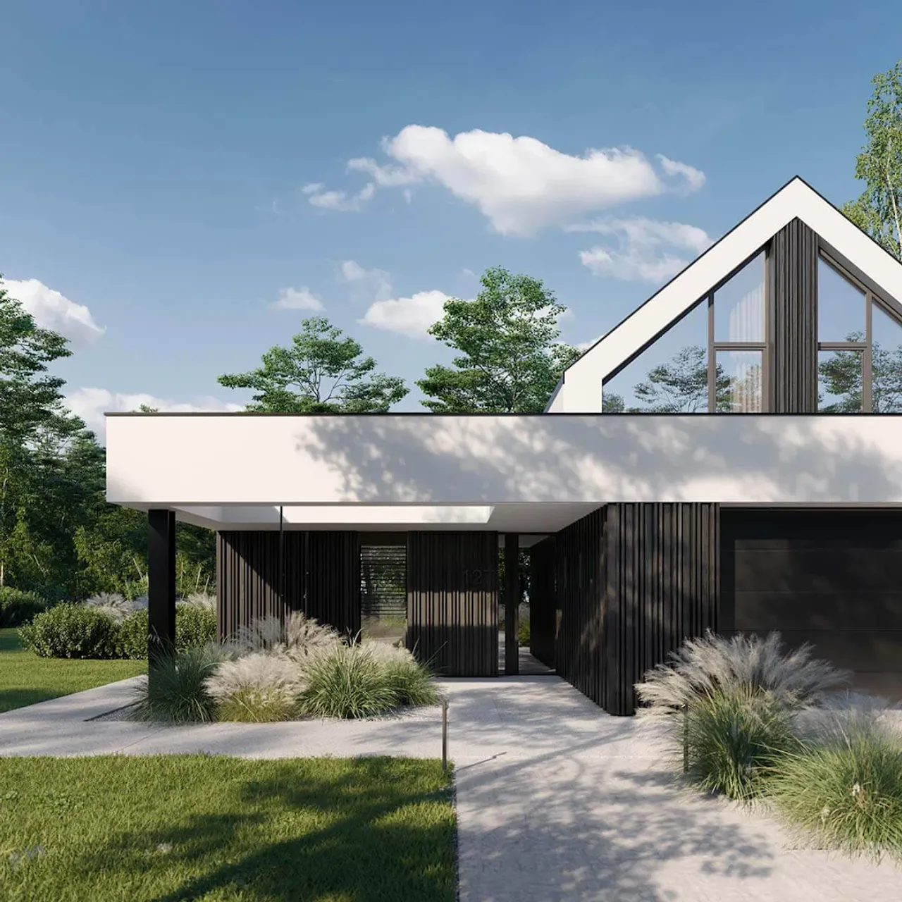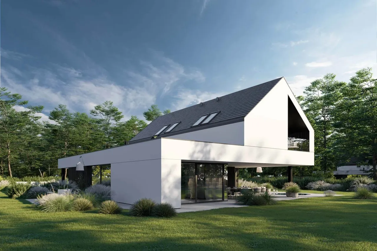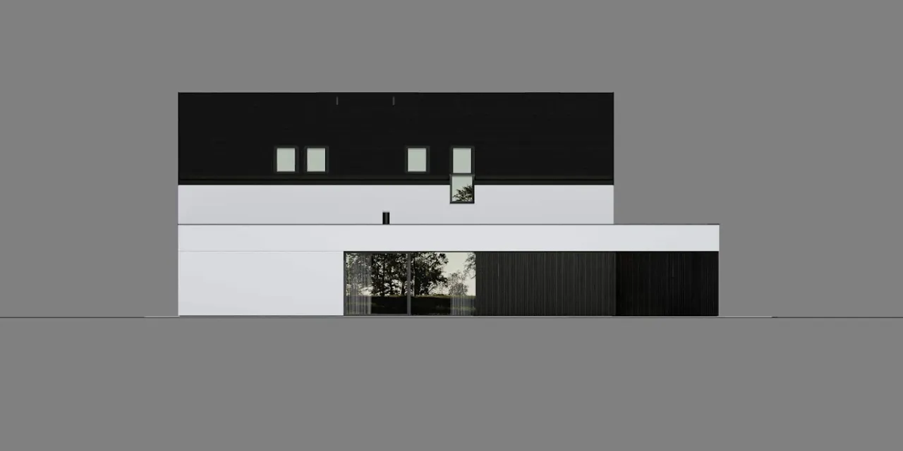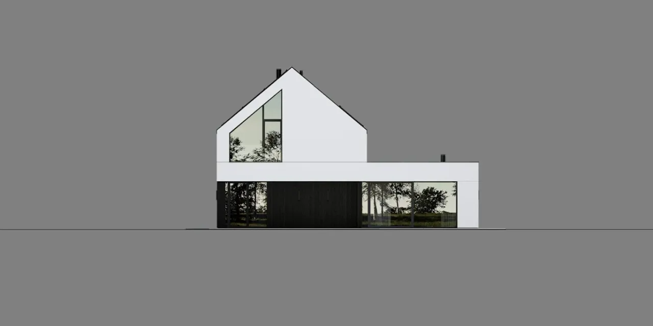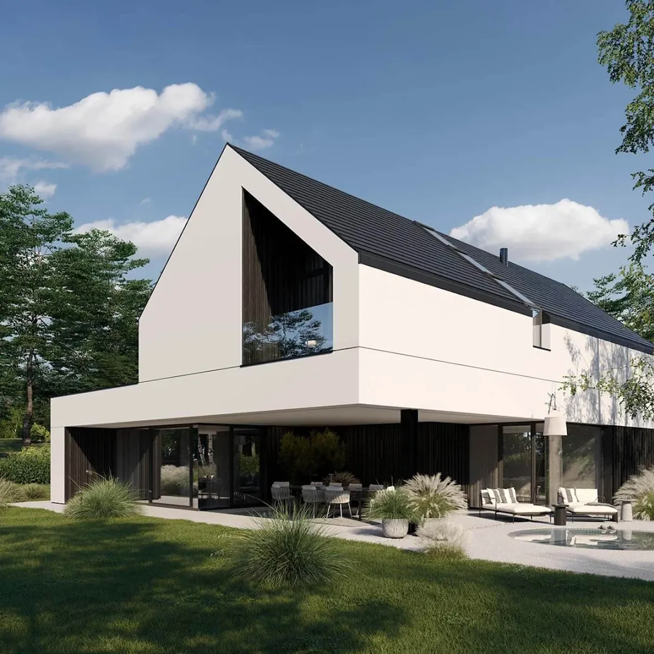 - Elewacja: tynk silikonowy połączony z deską elewacyjną.