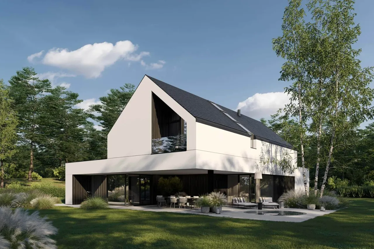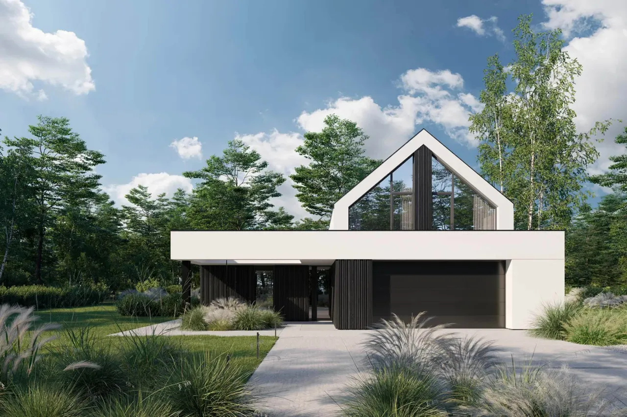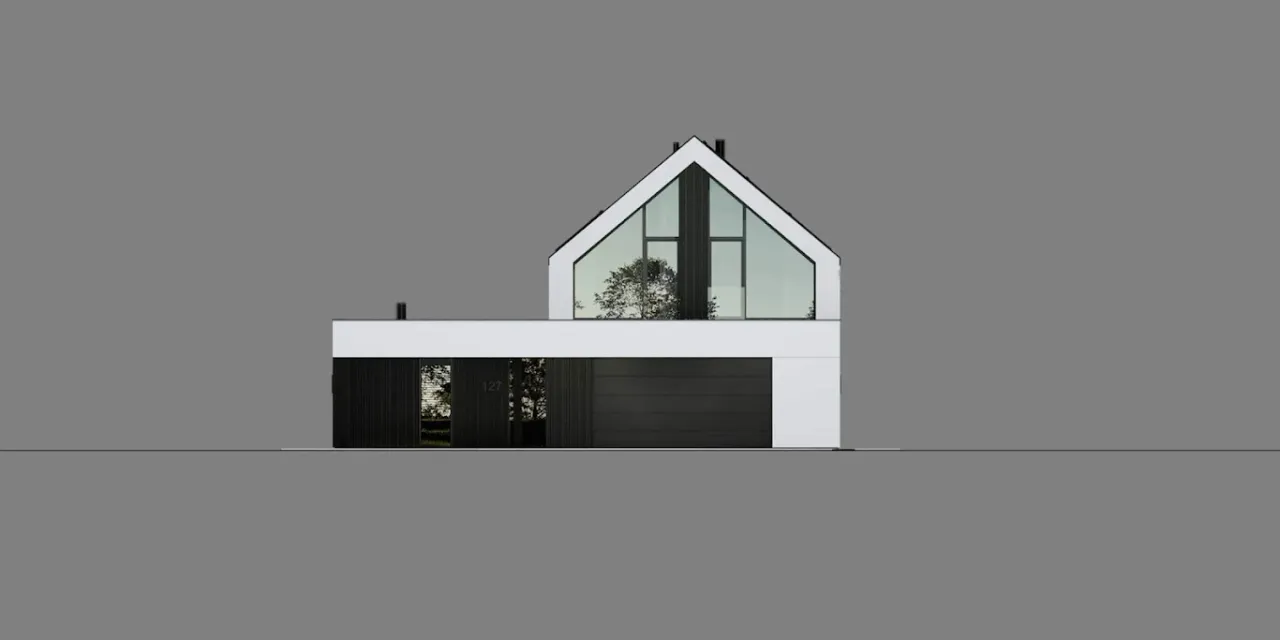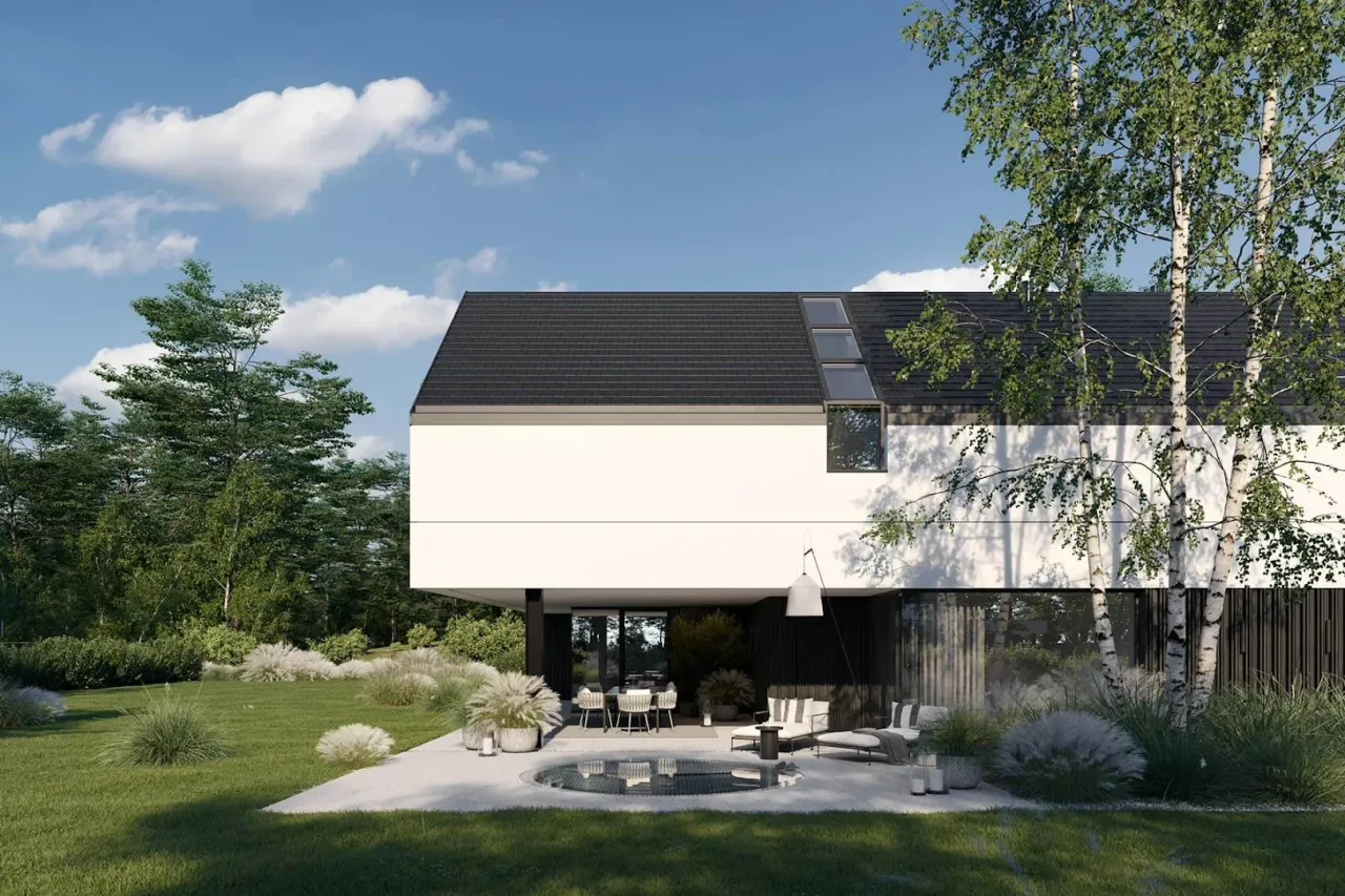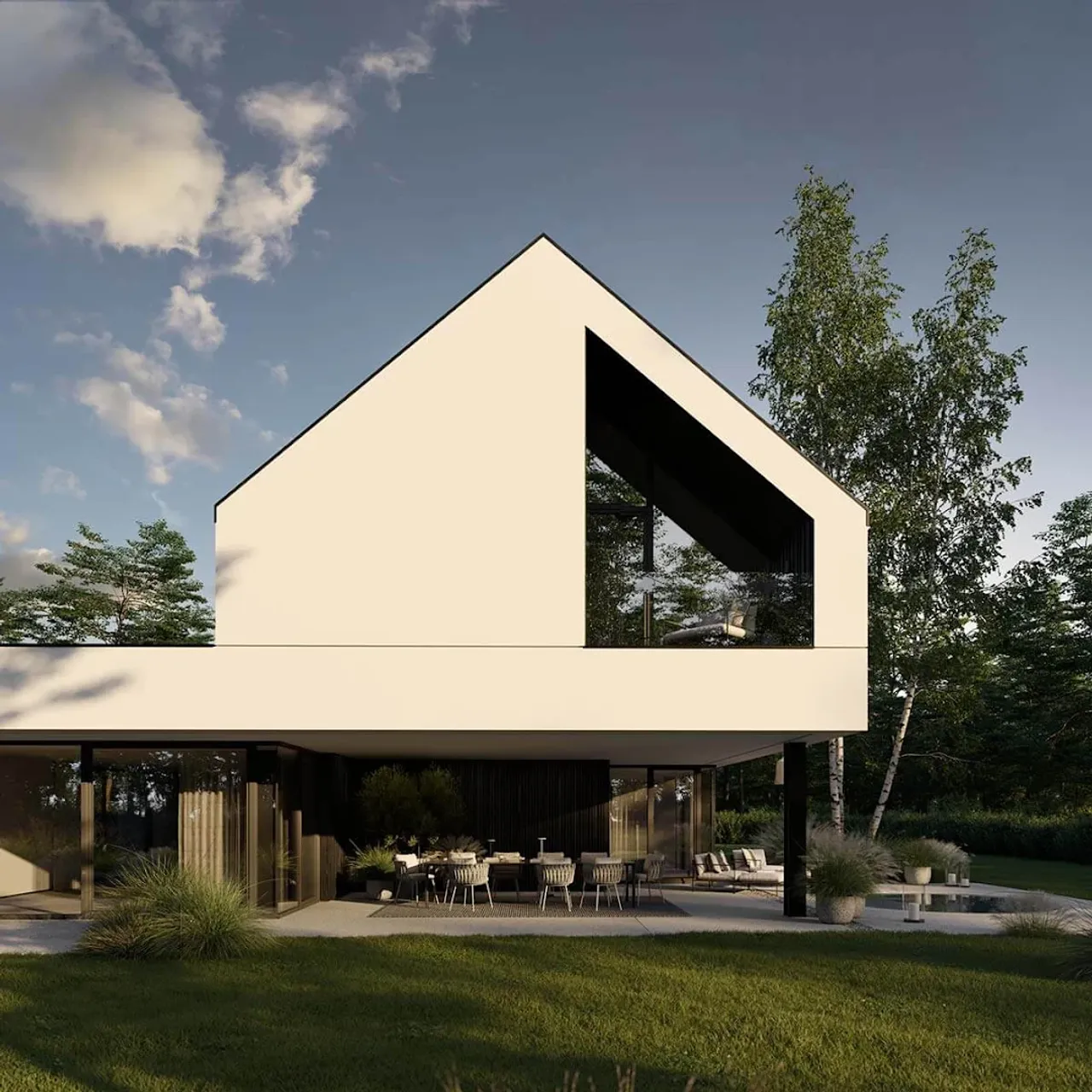 - Elewacja: tynk silikonowy połączony z deską elewacyjną.