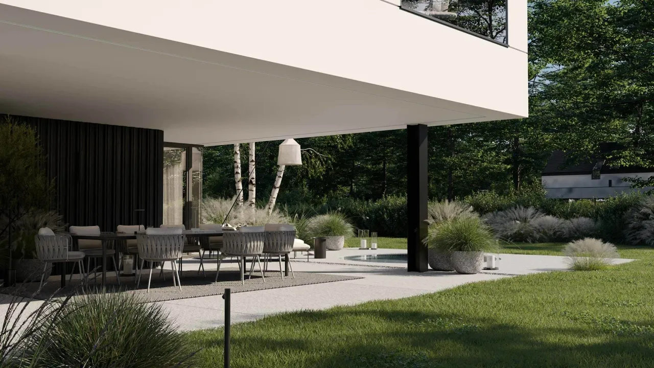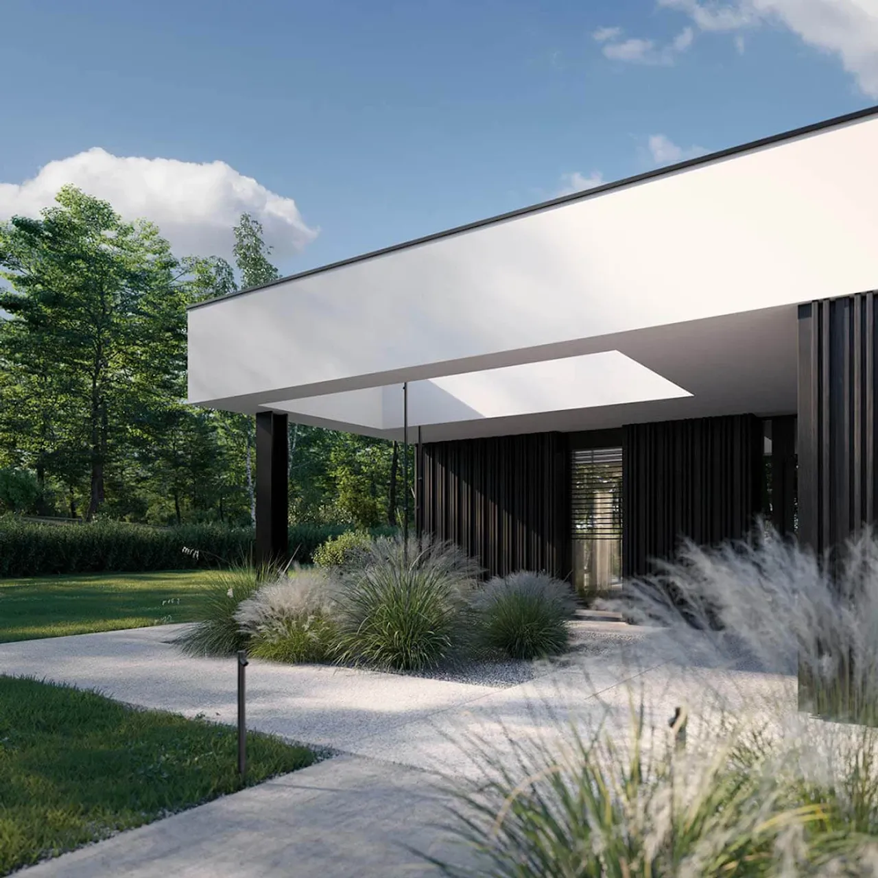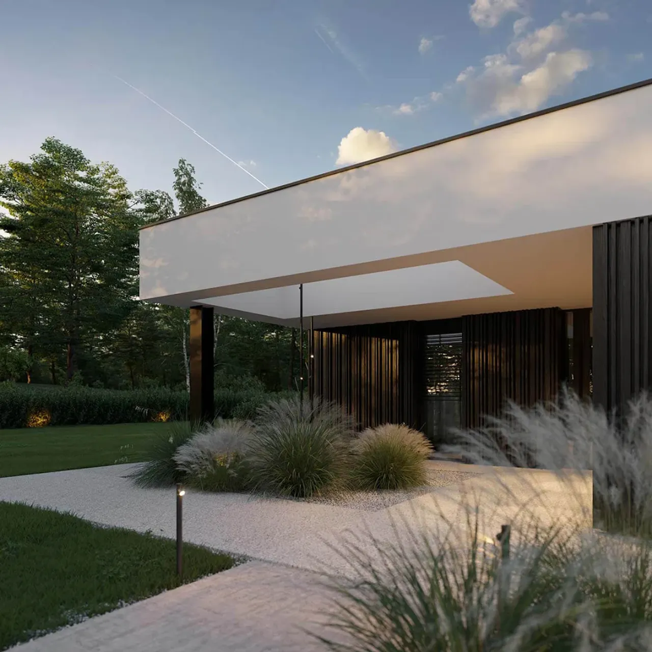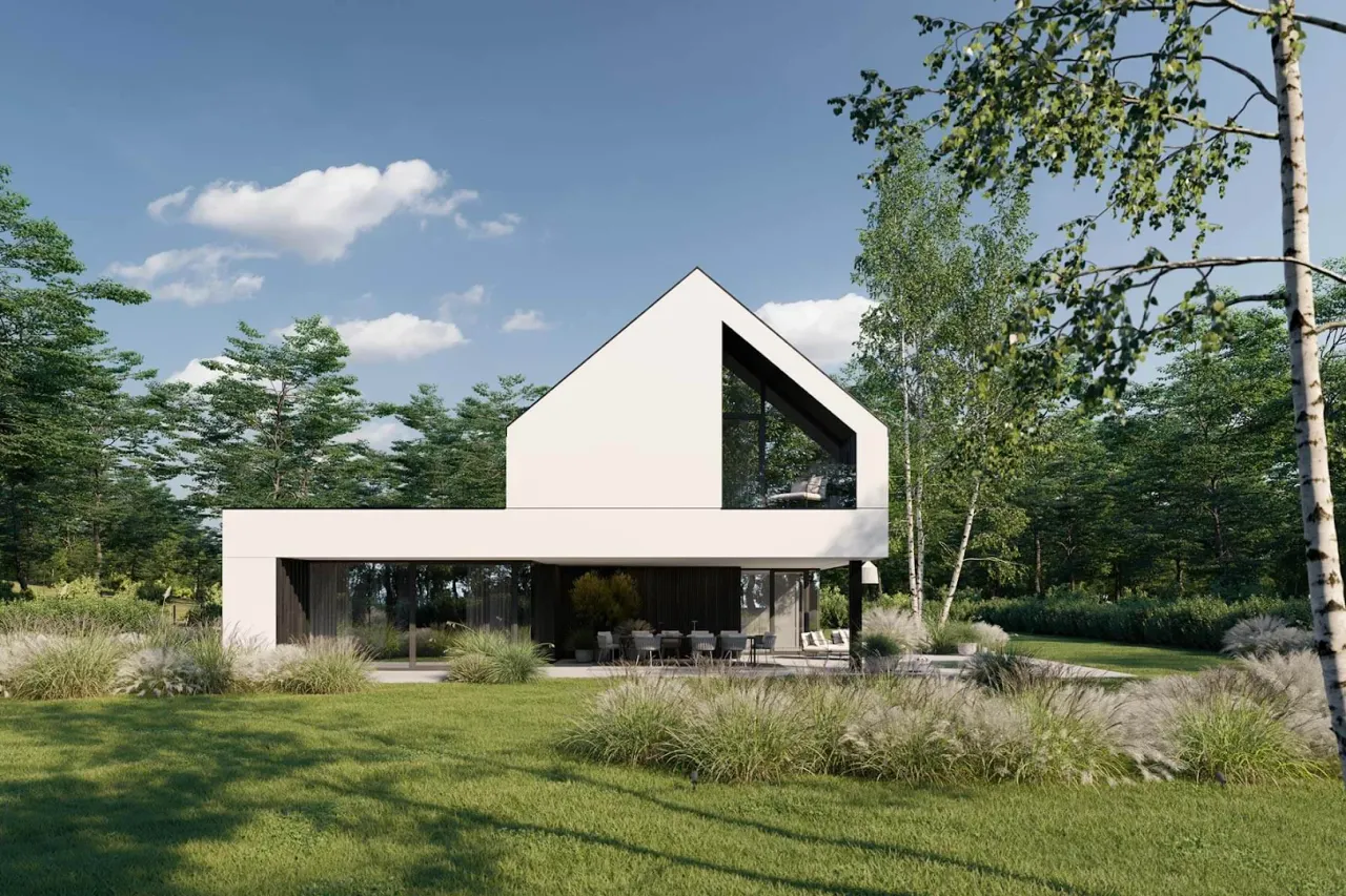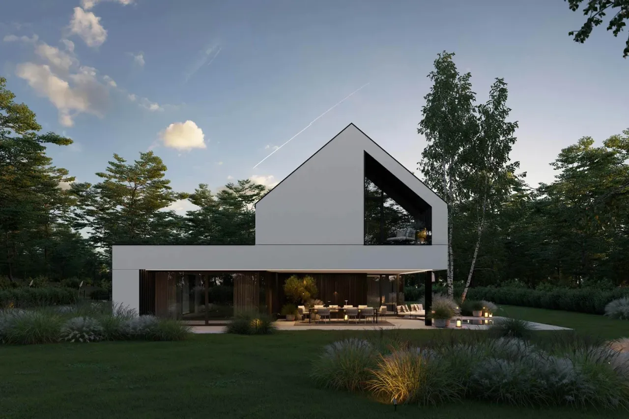 - Elewacja: tynk silikonowy połączony z deską elewacyjną.