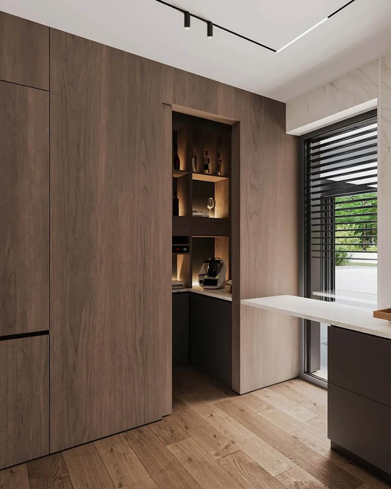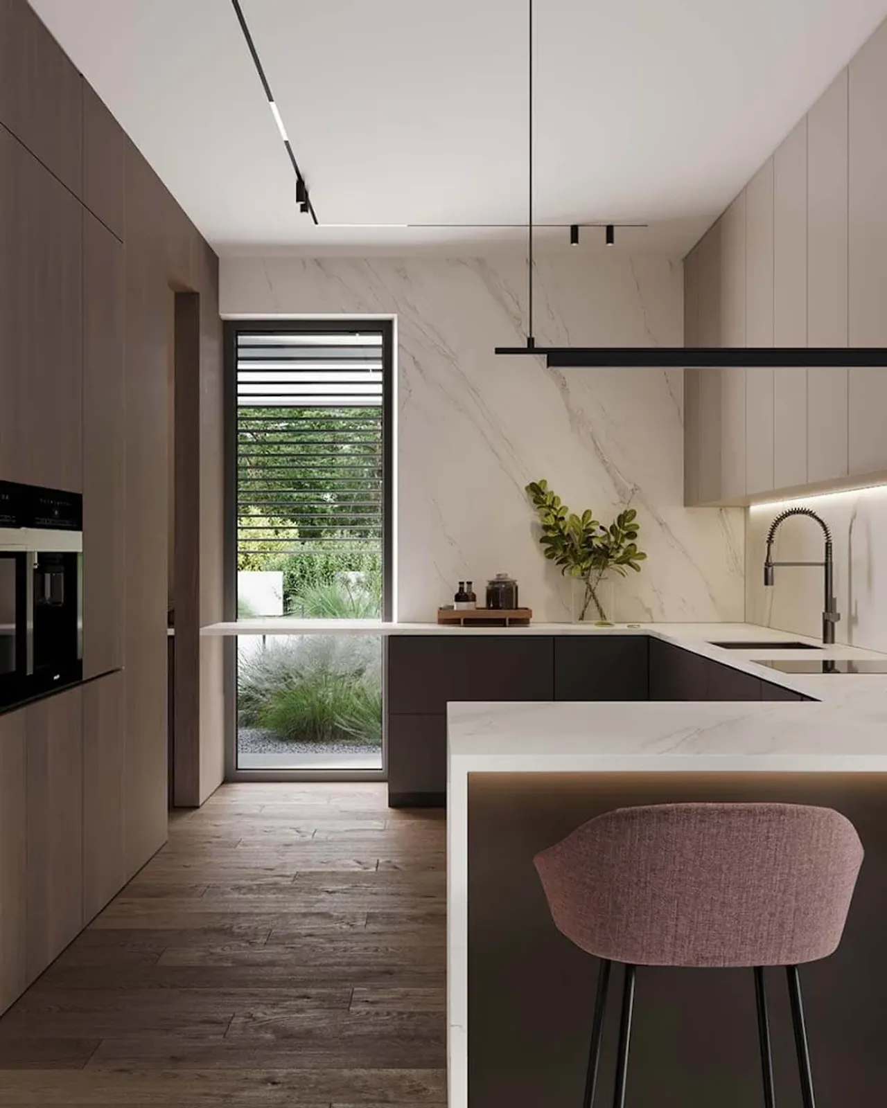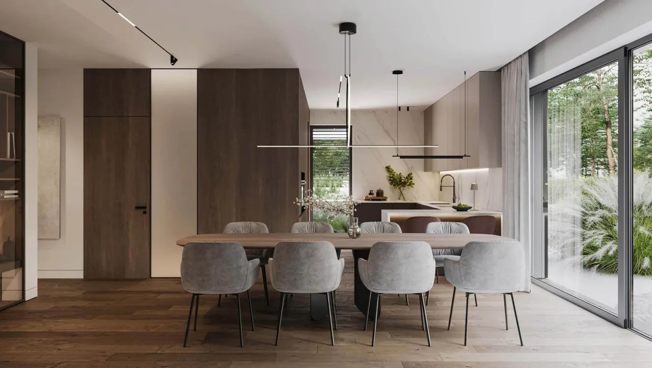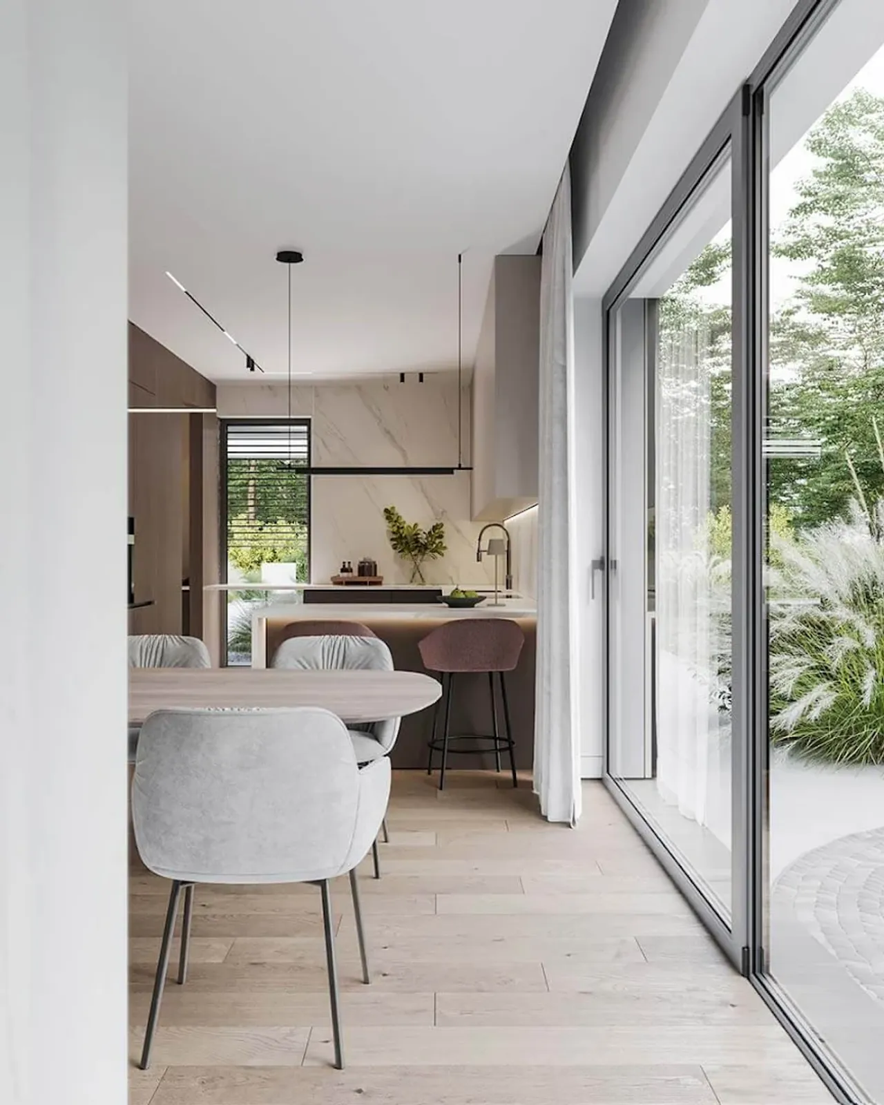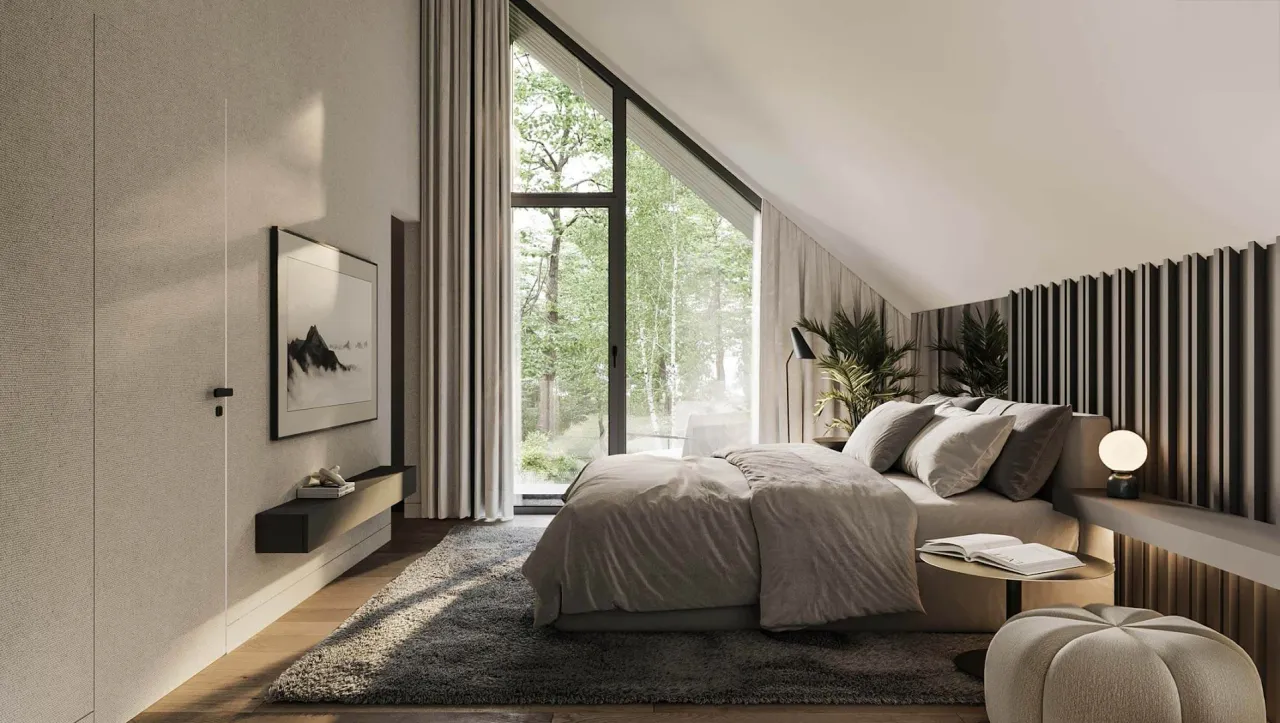 - Elewacja: tynk silikonowy połączony z deską elewacyjną.