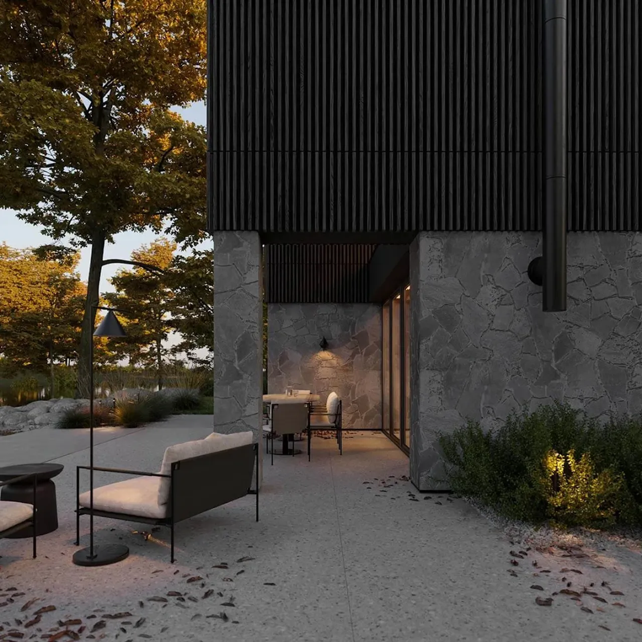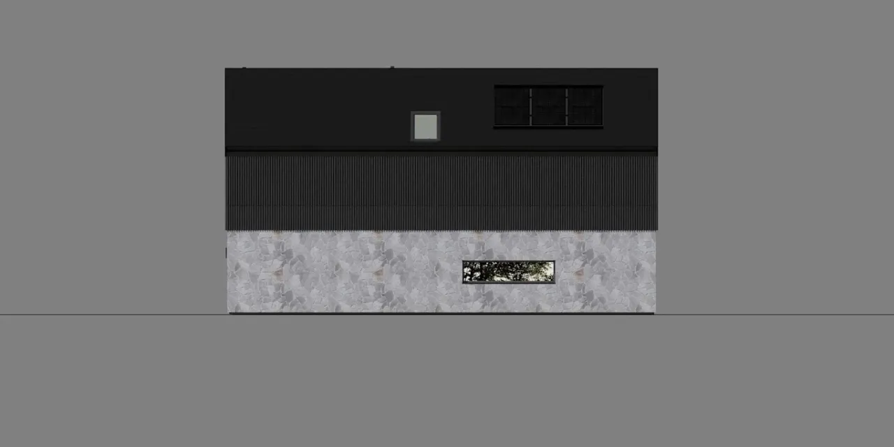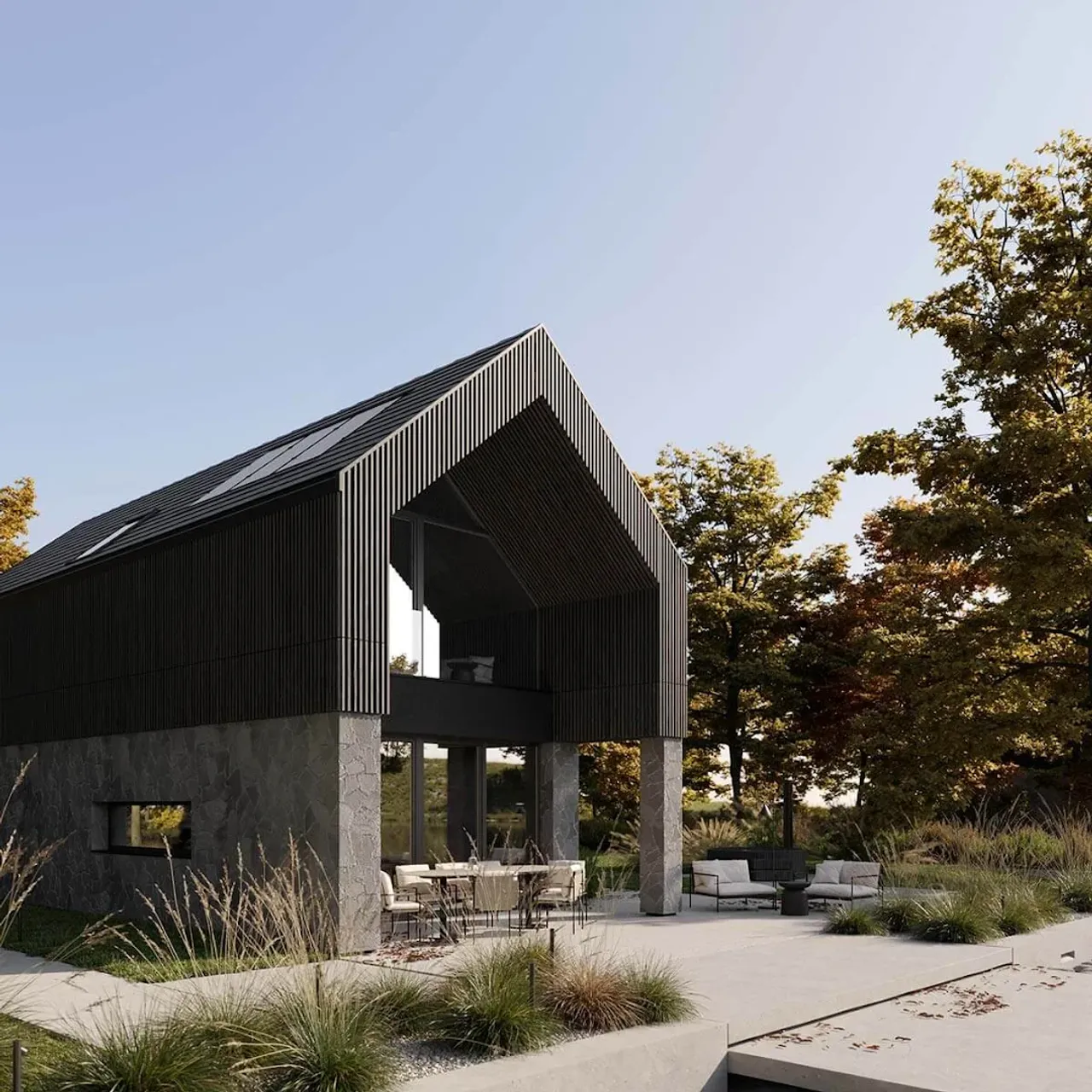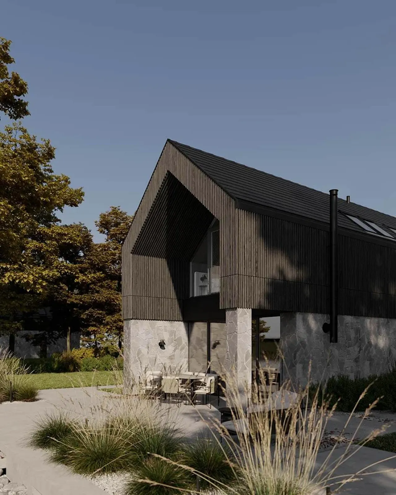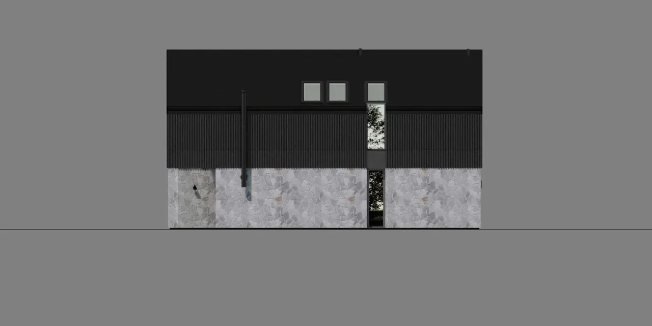 - Elewacja: panele lamelowe połączone z kamieniem elewacyjnym.