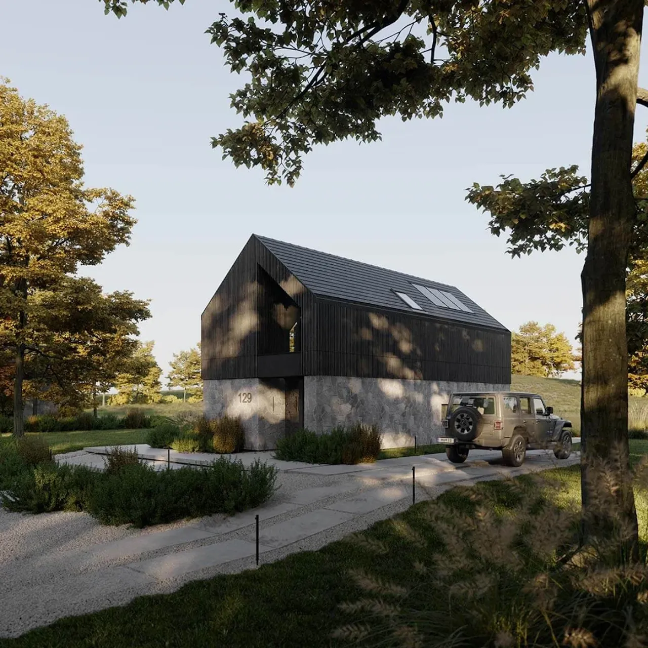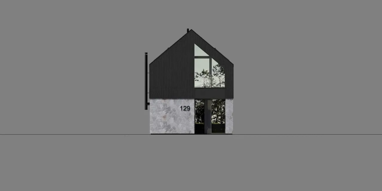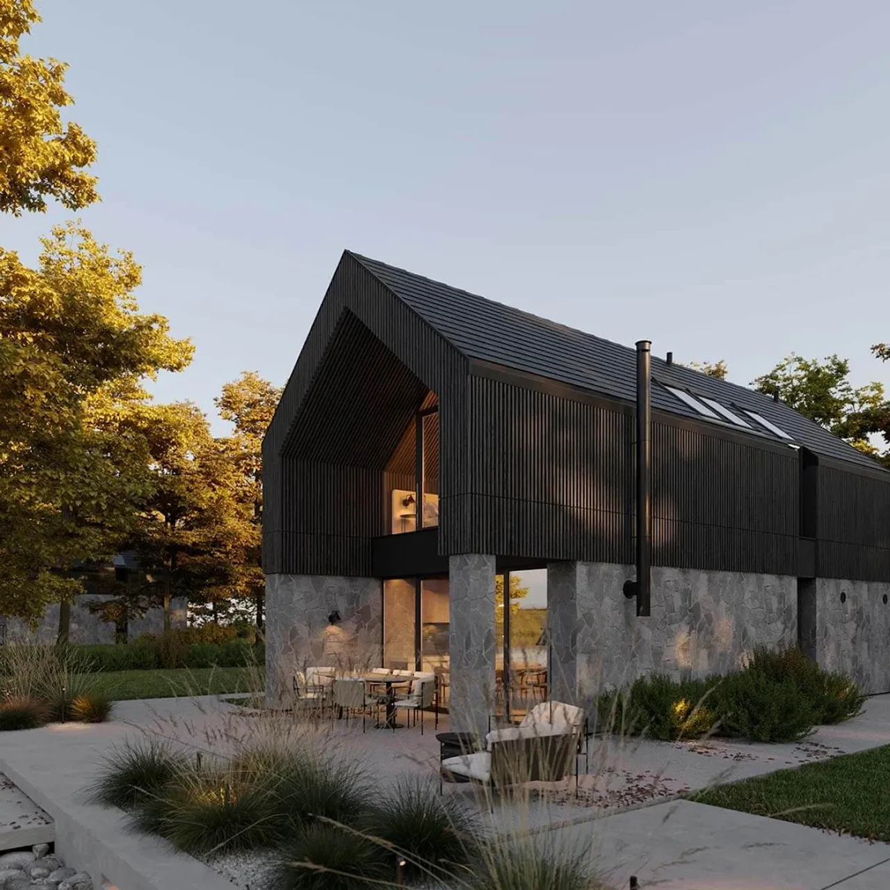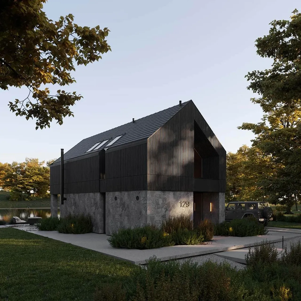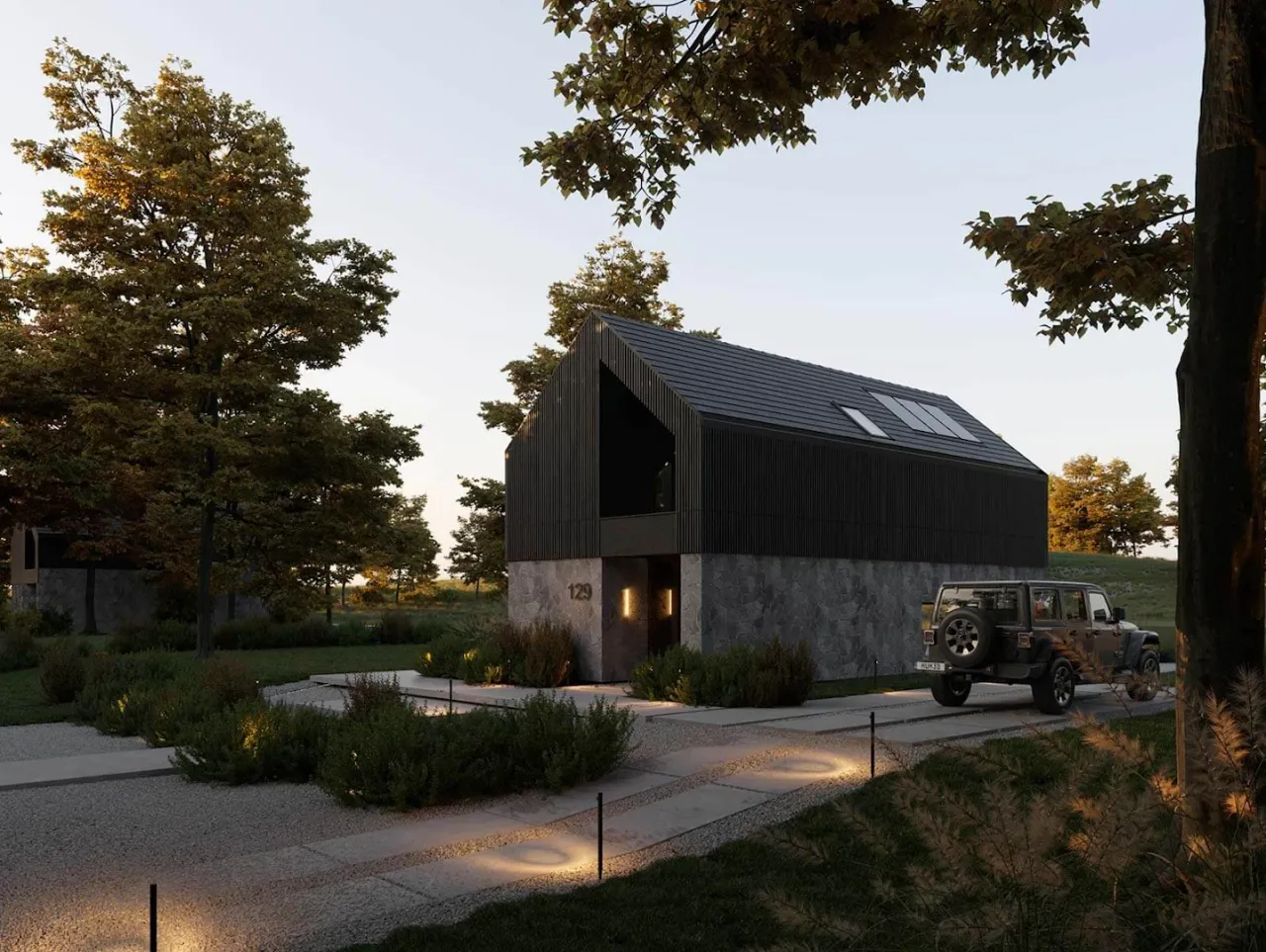 - Elewacja: panele lamelowe połączone z kamieniem elewacyjnym.