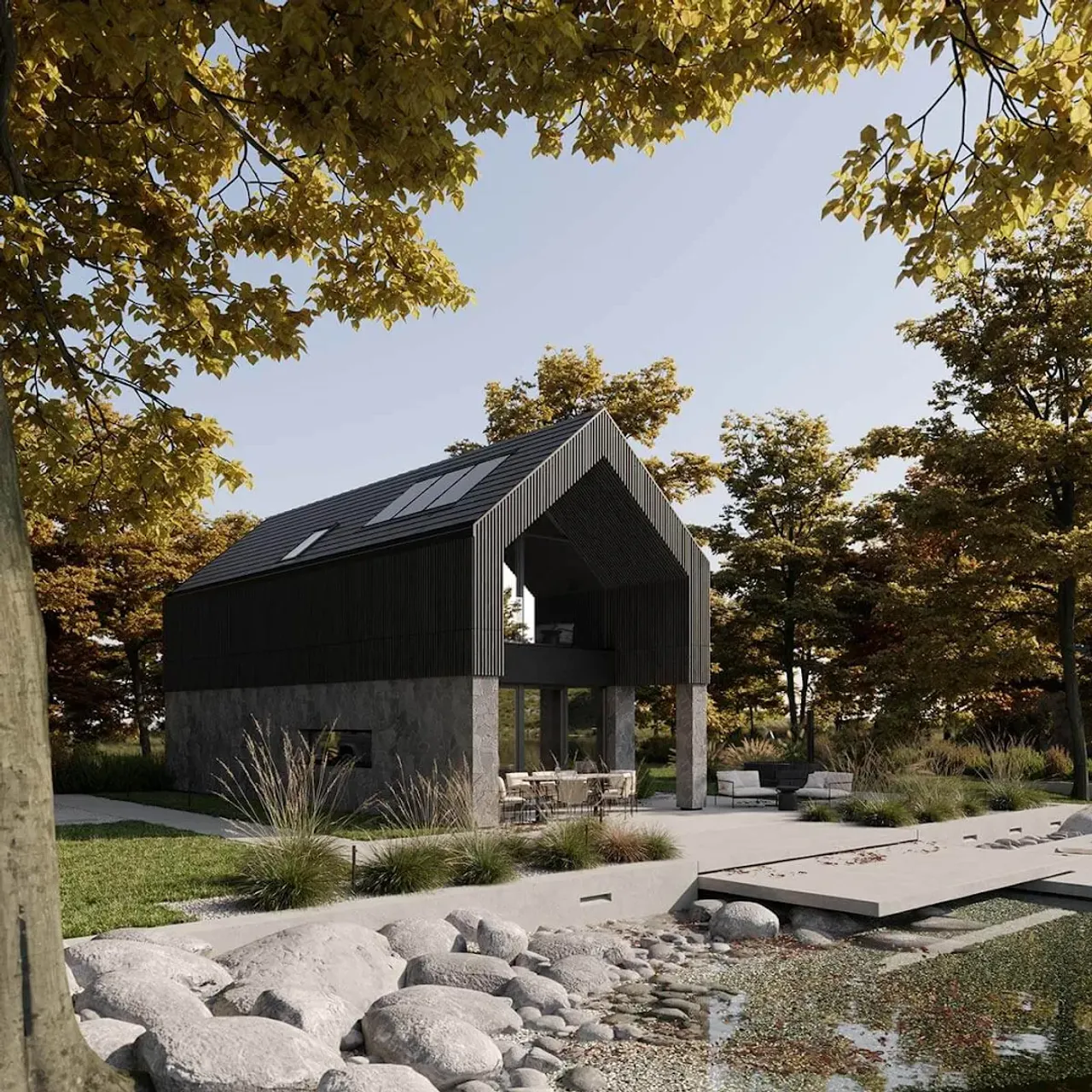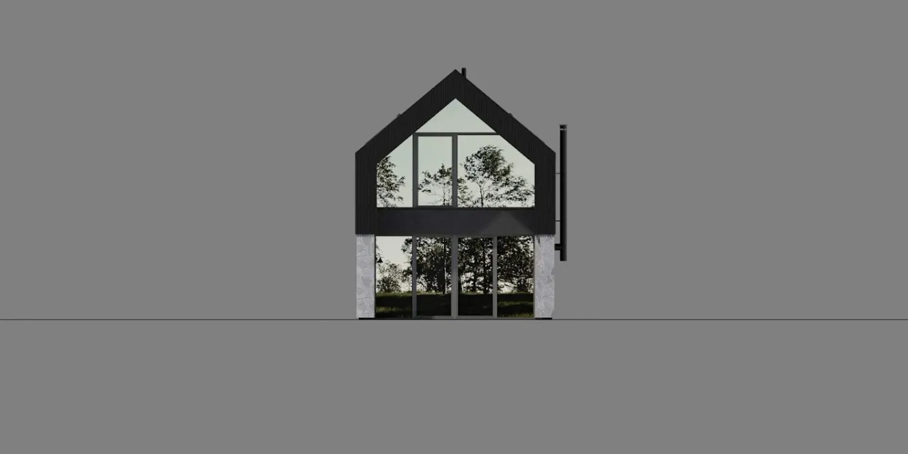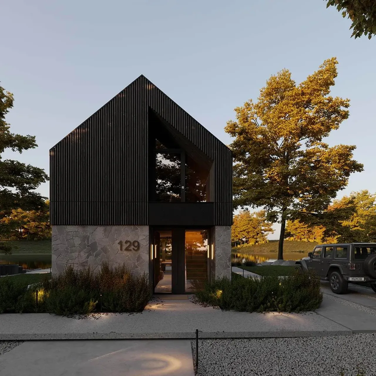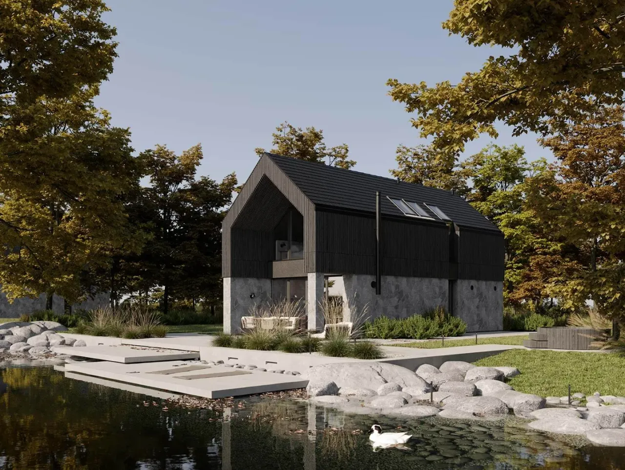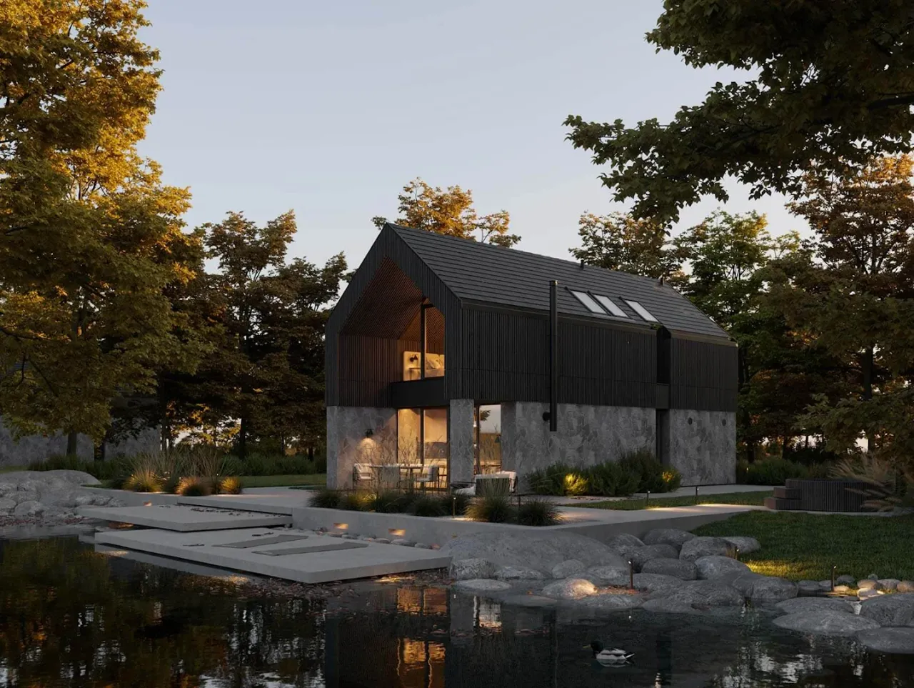 - Elewacja: panele lamelowe połączone z kamieniem elewacyjnym.