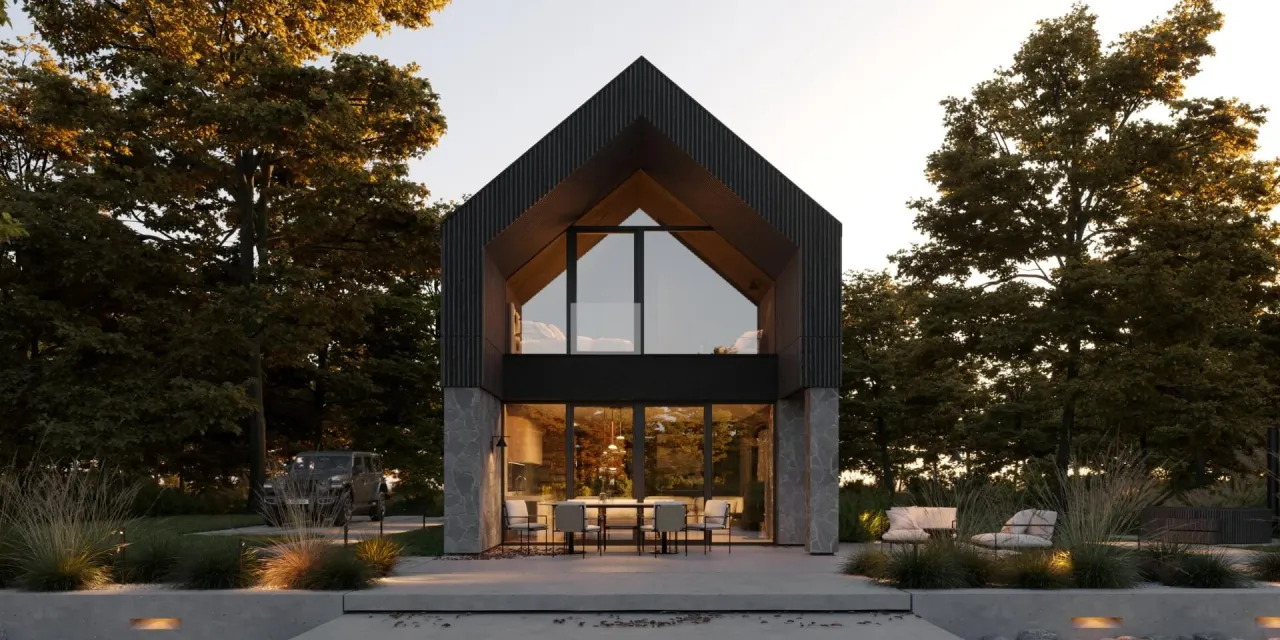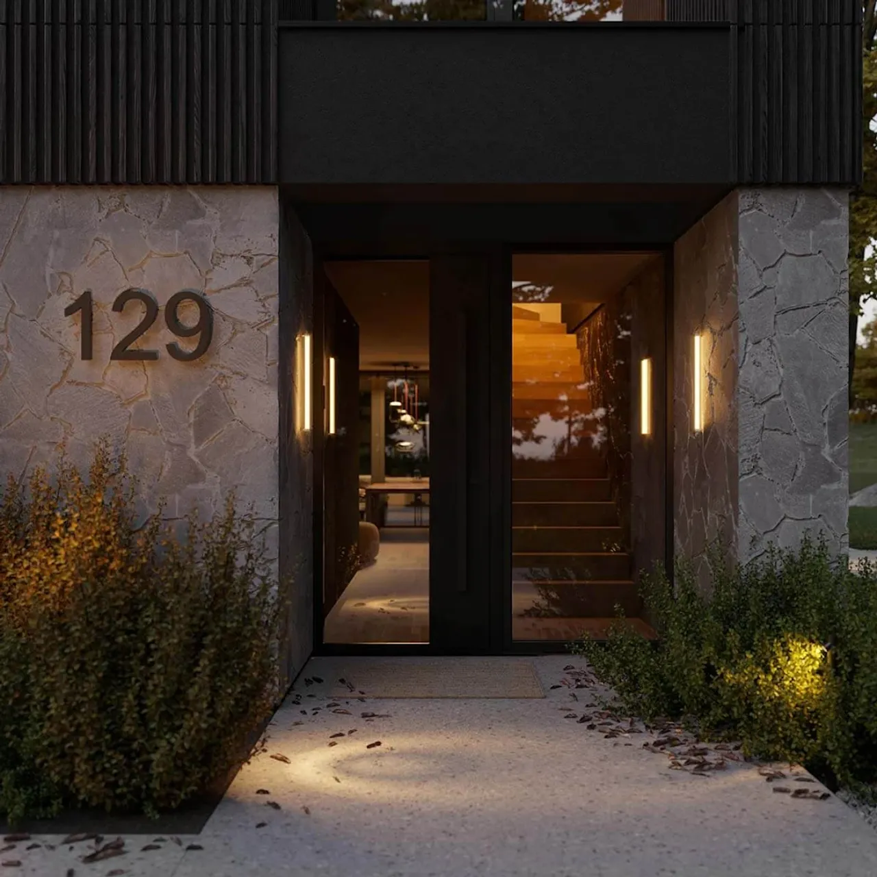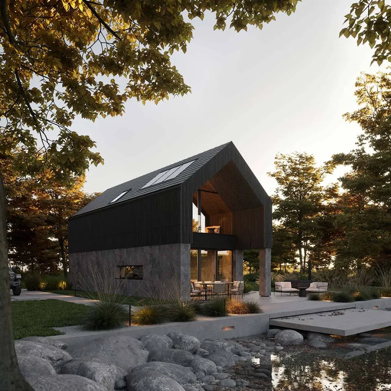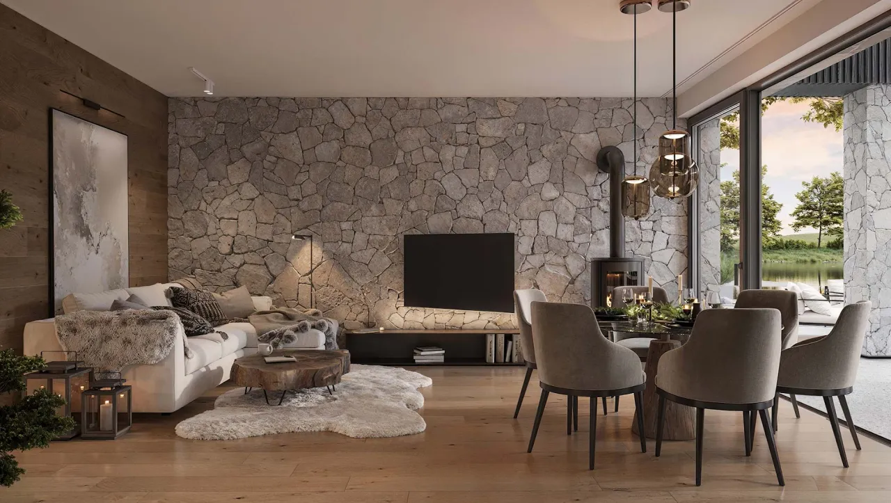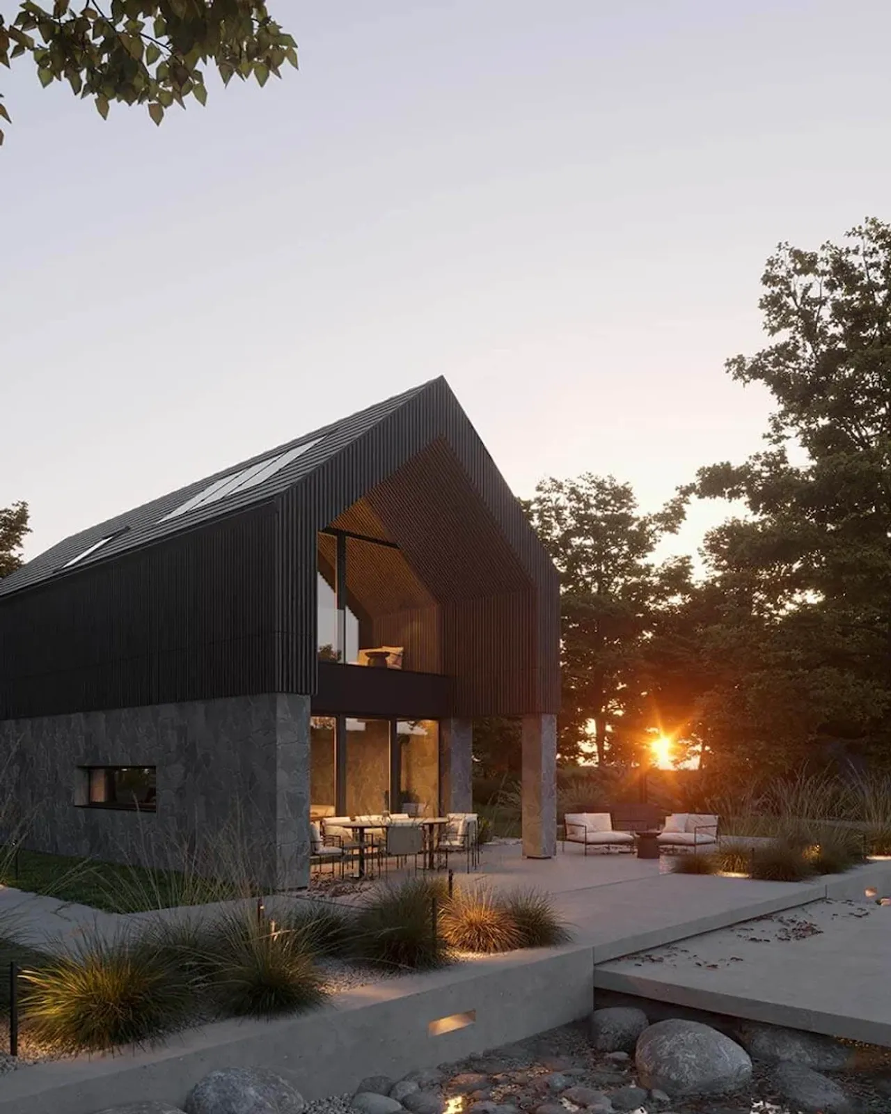 - Elewacja: panele lamelowe połączone z kamieniem elewacyjnym.