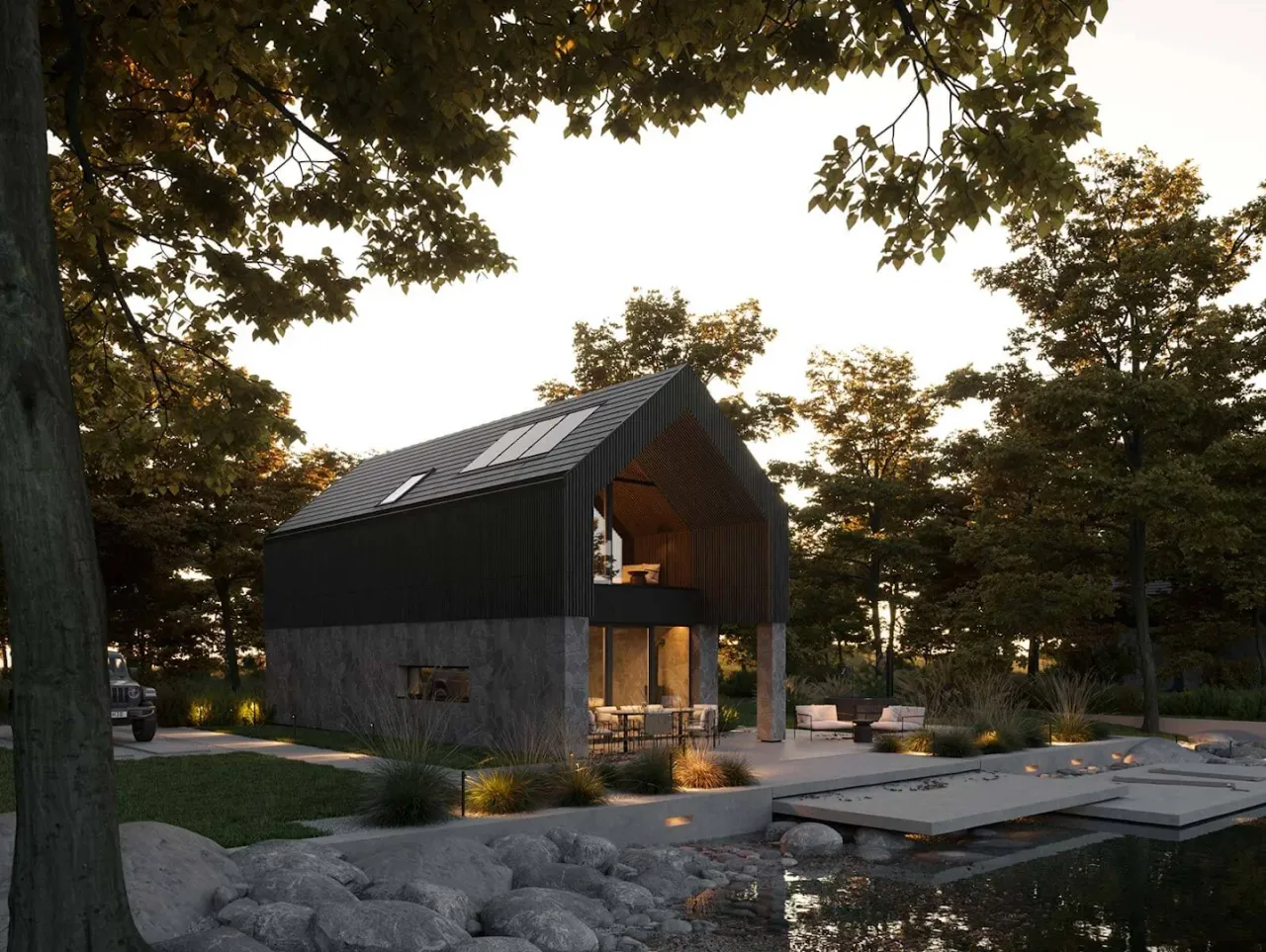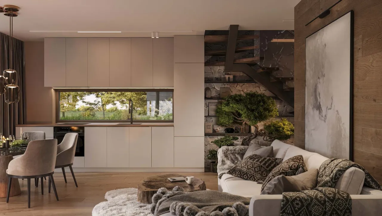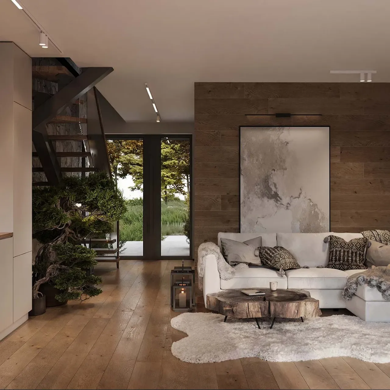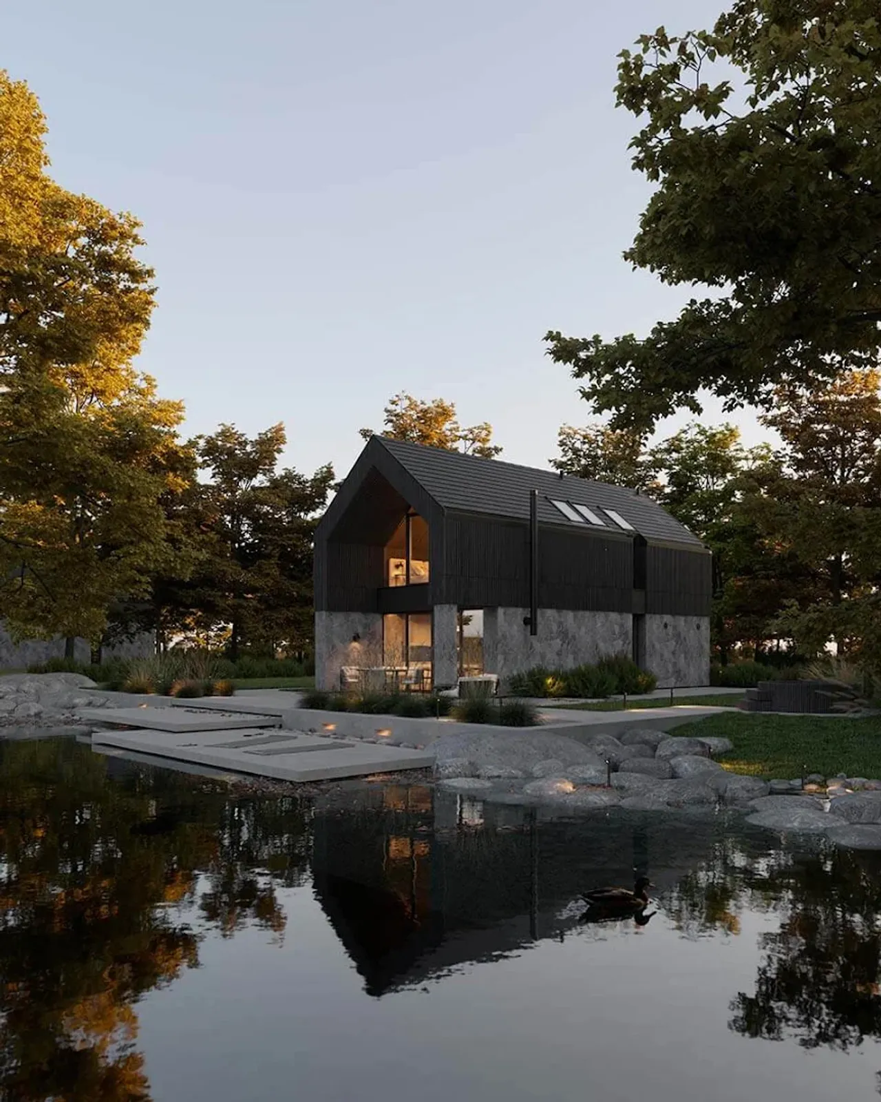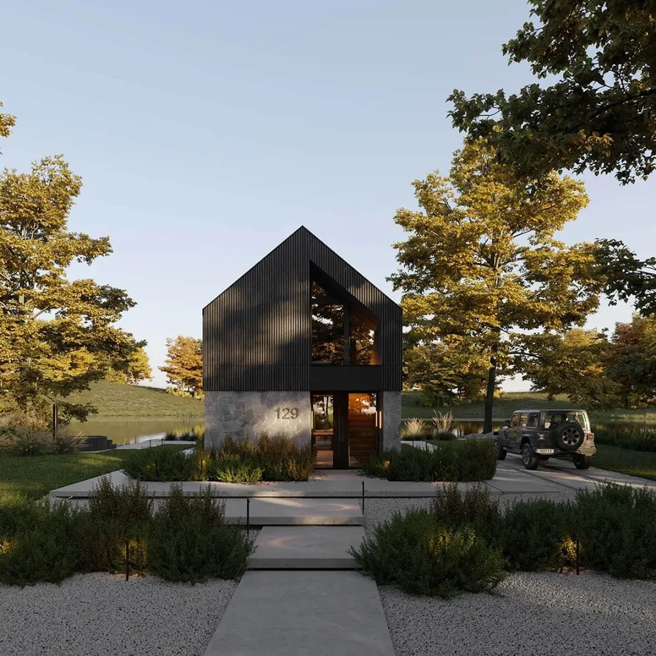 - Elewacja: panele lamelowe połączone z kamieniem elewacyjnym.