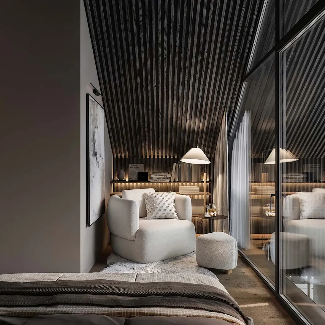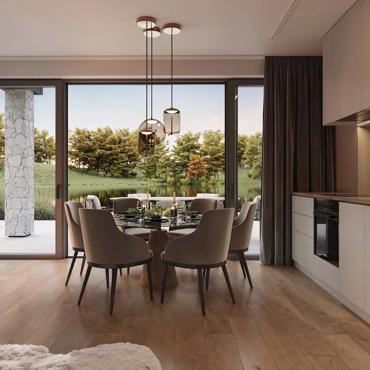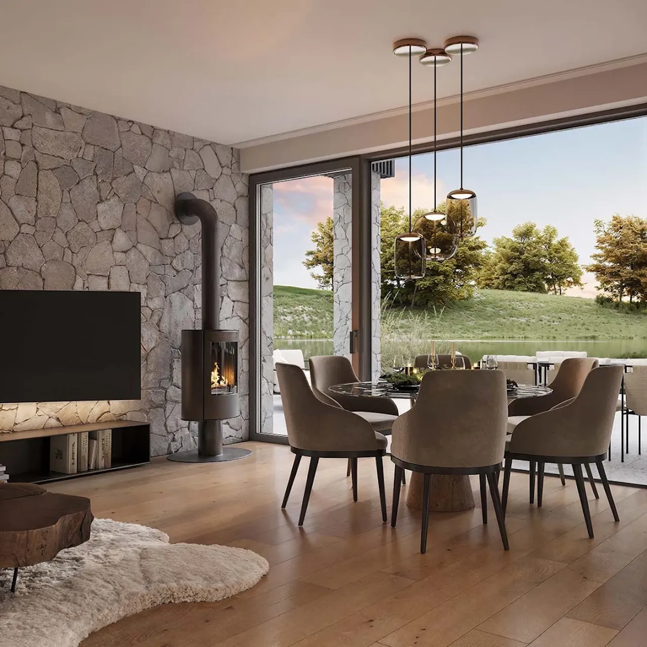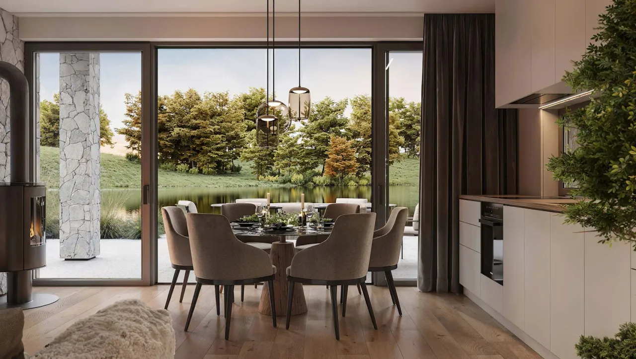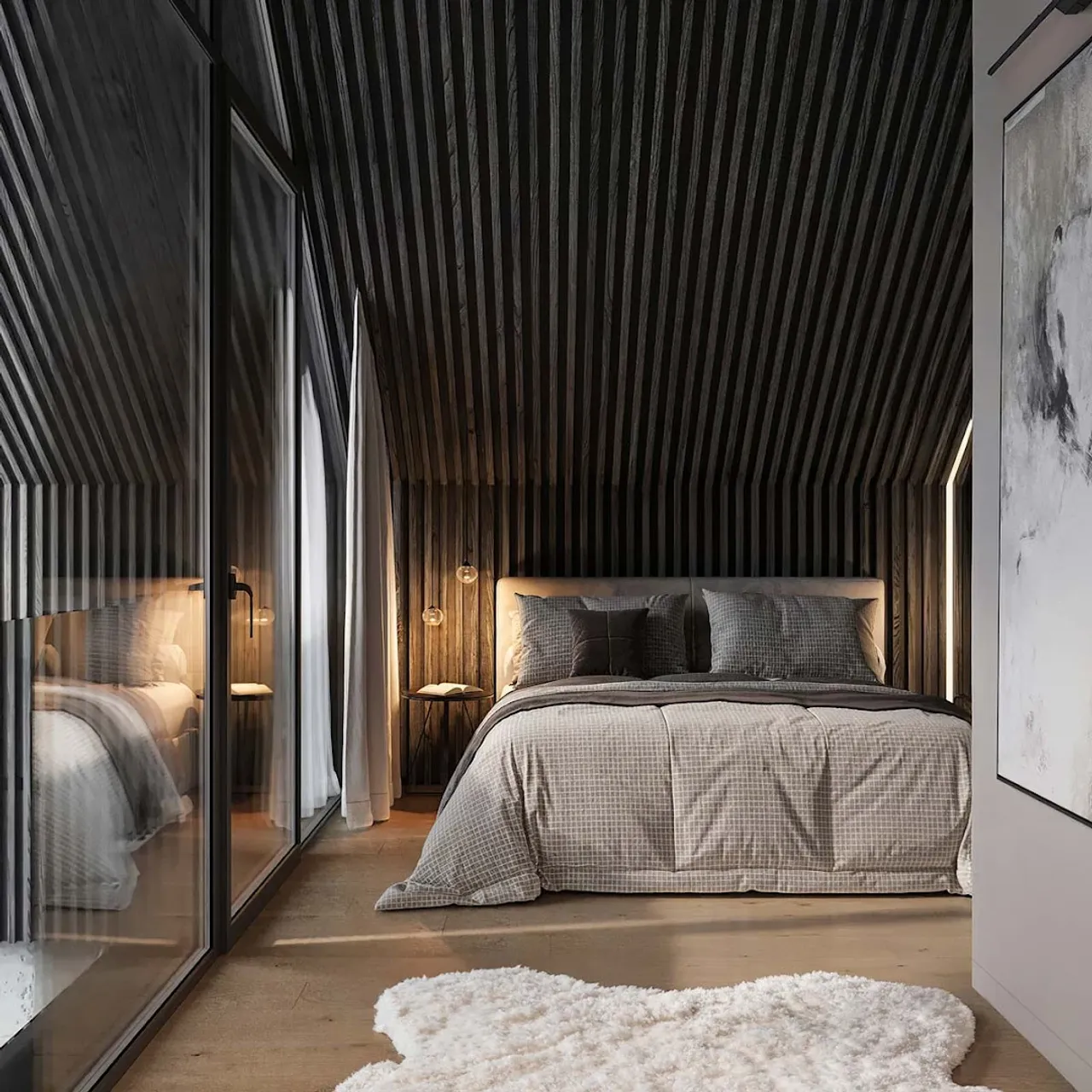 - Elewacja: panele lamelowe połączone z kamieniem elewacyjnym.
