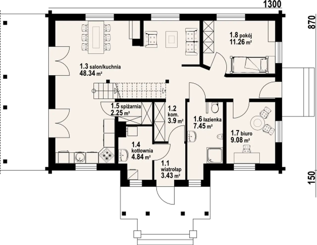 - opisu architektonicznego zawierającego m.in. opis przyjętych rozwiązań, zestawienia powierzchni (użytkowej, zabudowy, netto), kubatury oraz powierzchni poszczególnych pomieszczeń