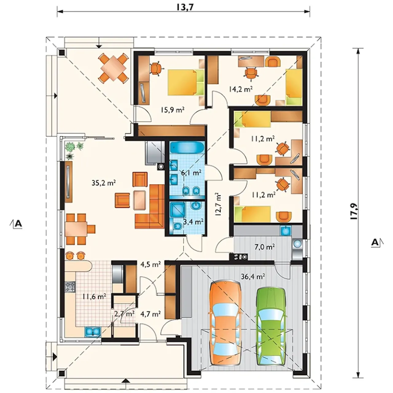 - elewacje - pokazują dokładny wygląd domu od frontu, z tyłu i z boków