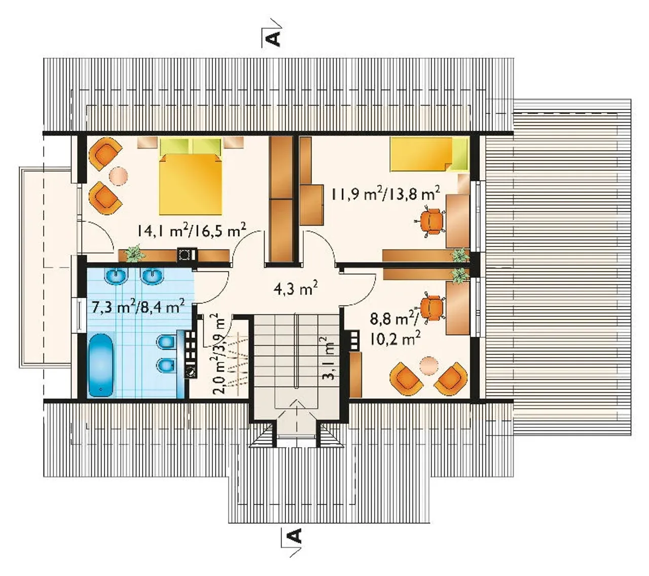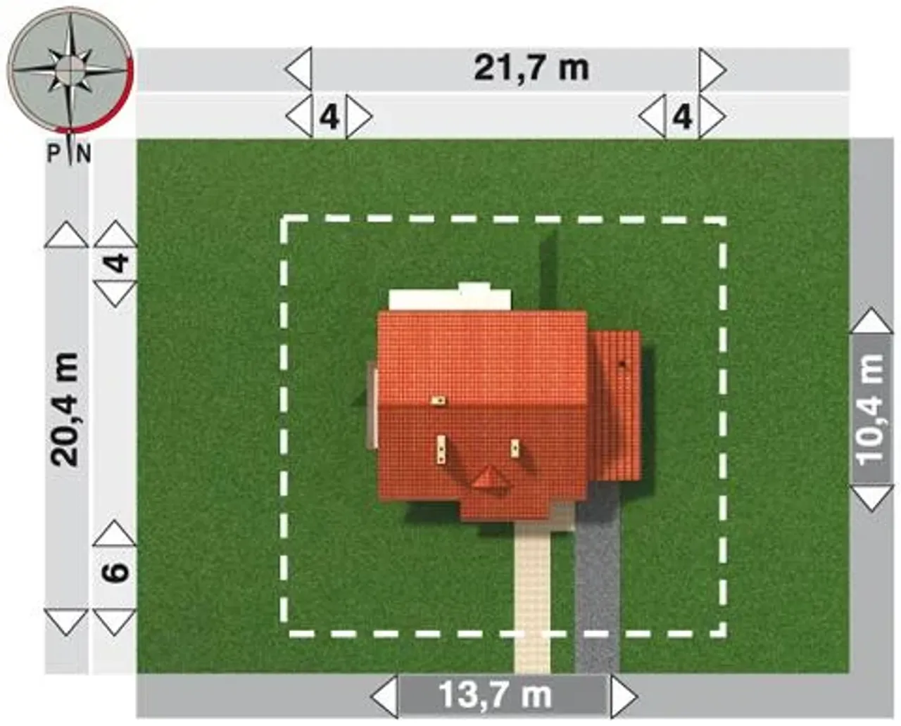 - rzut dachu - ukazuje jego kształt, wymiary, kąt nachylenia połaci, rozmieszczenie okien połaciowych, lukarn, świetlików i rur spustowych, pokazuje rozmieszczenie kominów i informuje o sposobie odwodnienia: rozmieszczeniu i rozmiarach rynien