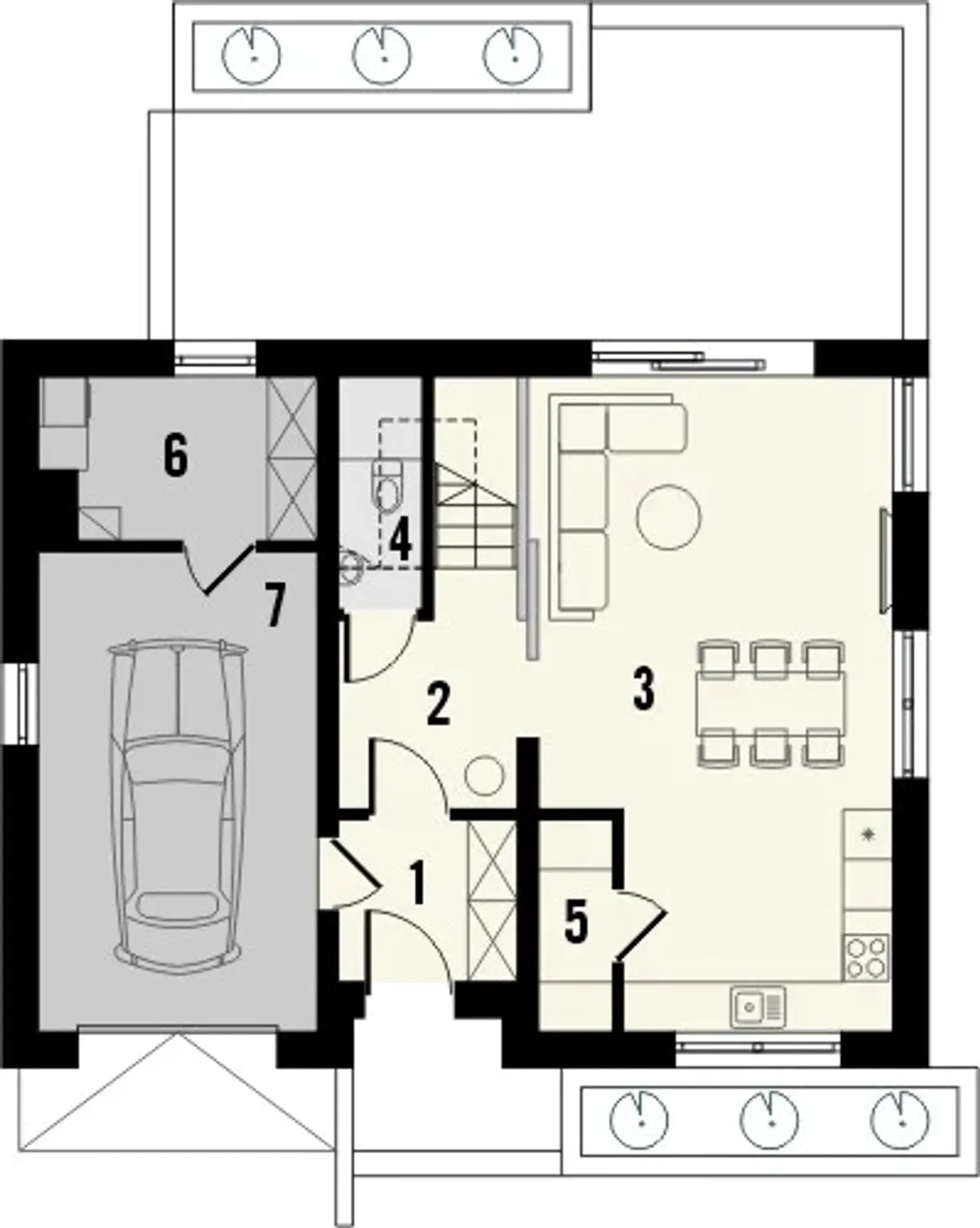 - Garaż na 1 auto: Zintegrowany z bryłą budynku garaż porządkuje przestrzeń działki i chroni samochód przed mrozem oraz upałem.