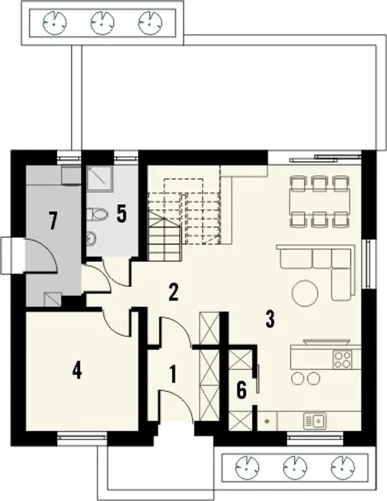 - 5 pokoi dla rodziny: Więcej miejsca na strefę nocną, gabinet lub pokój gościnny, co sprzyja swobodnemu podziałowi przestrzeni między domownikami.