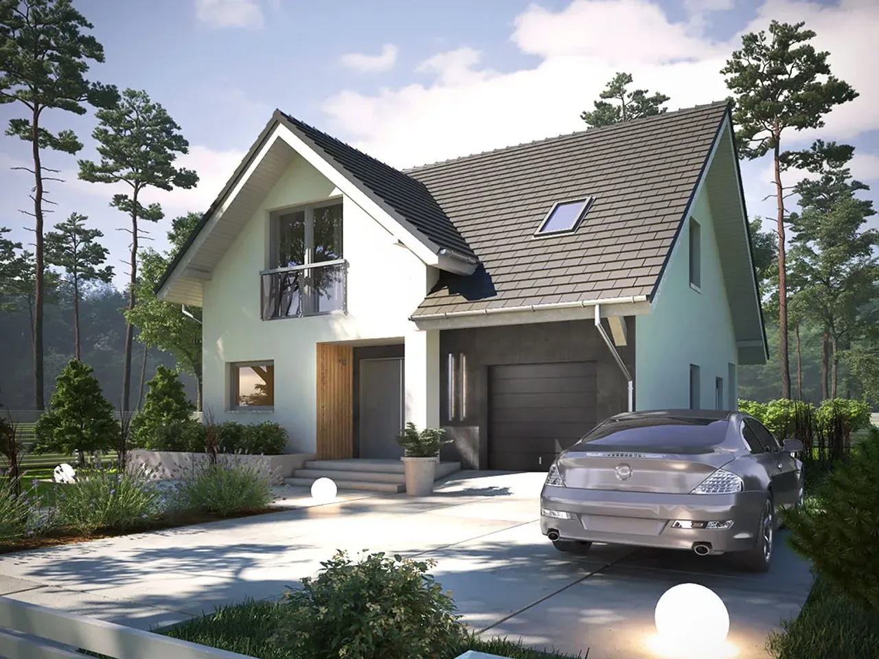 Ten dom jednorodzinny całoroczny z czterema pokojami i garażem jednostanowiskowym dobrze odpowiada na potrzeby rodzin, które szukają kompromisu między metrażem a kosztami budowy i utrzymania. Sprawdza się na działkach o regularnym kształcie, z dojazdem od dłuższego boku, gdzie kalenica równoległa do drogi porządkuje zabudowę i ułatwia usytuowanie domu względem stron świata.