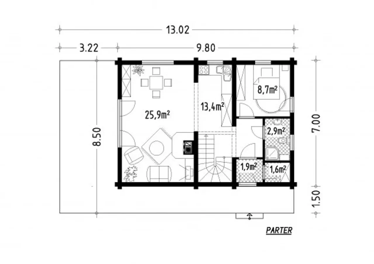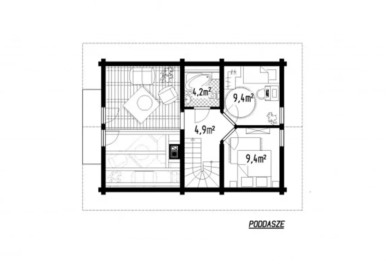 Dom z drewna zapewnia cztery wygodne pokoje, z elastycznym układem kondygnacji: parter oraz poddasze użytkowe. Dzięki odpowiedniemu rozplanowaniu przestrzeni, dom sprzyja codziennej aktywności domowników i pozwala na łatwą organizację zarówno strefy dziennej, jak i prywatnych sypialni. Centralnie usytuowany kominek przyciąga domowników w długie wieczory i staje się naturalnym sercem domowego życia. Drewniany strop uzupełnia wnętrze o przyjemne, naturalne akcenty i wycisza pomieszczenia.