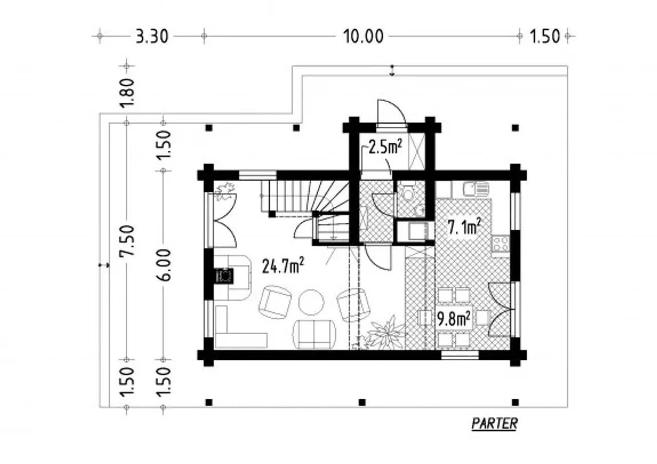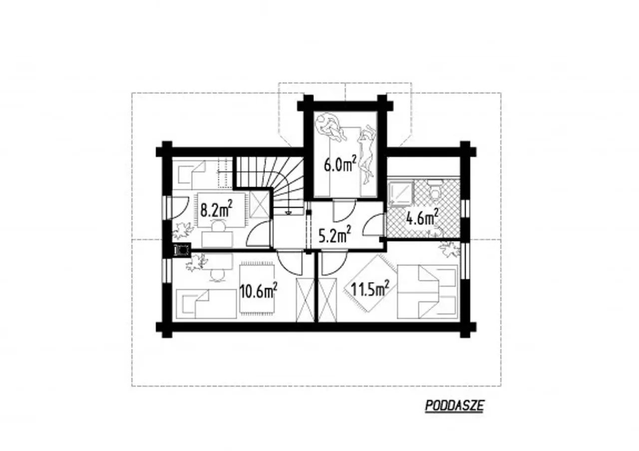 Dom jednorodzinny z bali doskonale sprawdzi się jako komfortowa siedziba na co dzień, jak również miejsce niespiesznego wypoczynku w każdy weekend. Parter stanowi główną przestrzeń użytkową - to tutaj można zaplanować przestronny salon, kuchnię, łazienkę lub gabinet według własnych potrzeb. Funkcjonalne poddasze umożliwia bieżącą adaptację wraz ze zmieniającymi się oczekiwaniami domowników.