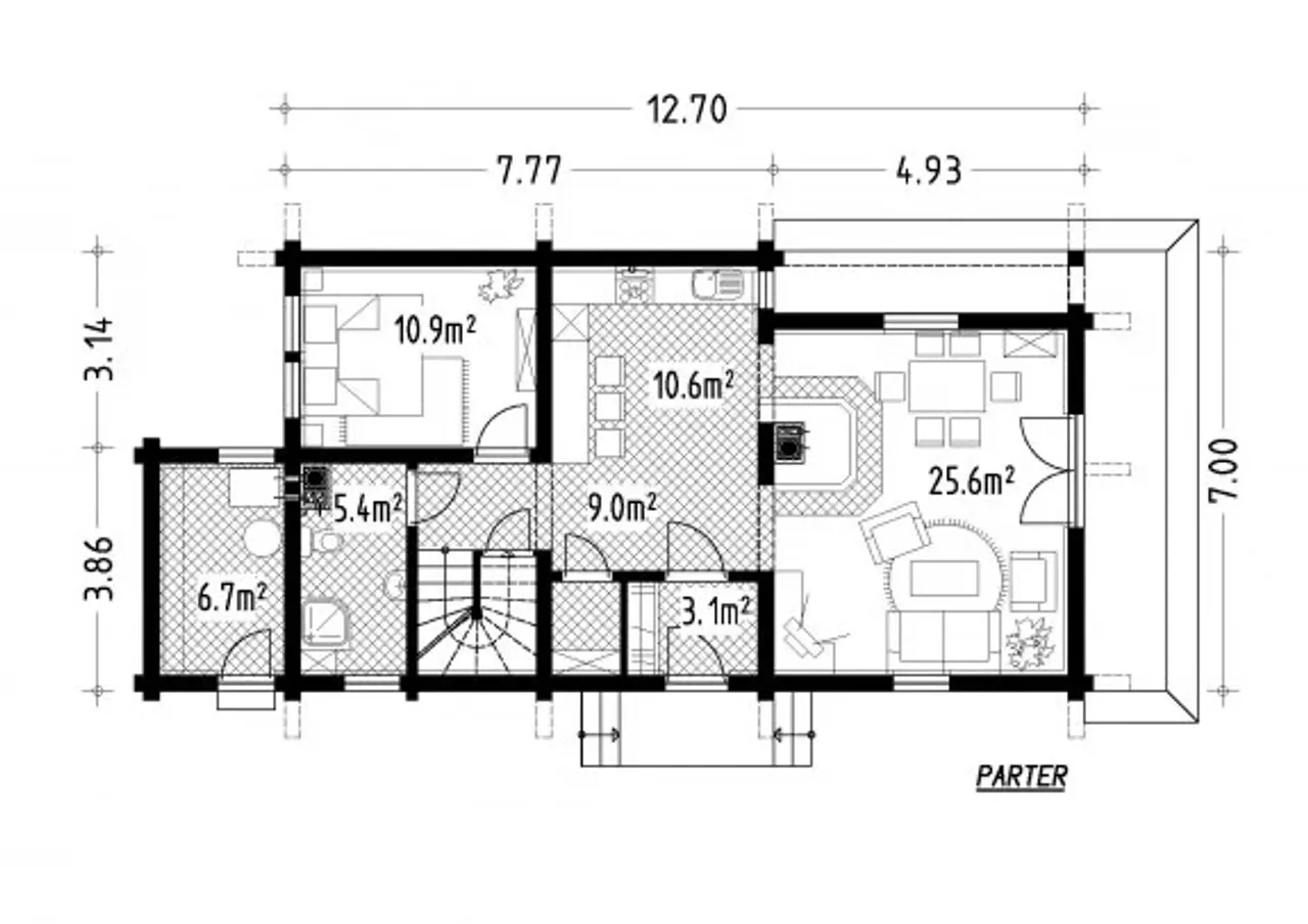 Dom L-229 wybudowany w technologii z bali prezentuje doskonałe połączenie trwałości, solidności i piękna natury. To propozycja dla tych, którzy chcą mieszkać wygodnie przez cały rok, korzystając z uroków nowoczesnych rozwiązań i urody drewna.