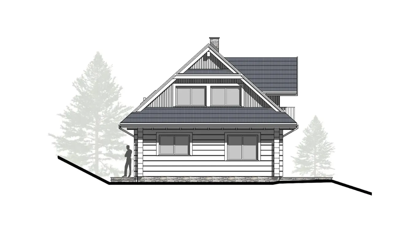 Dom posiada wygodny rozkład pomieszczeń z czterema jasno wydzielonymi pokojami, które można dowolnie zaadaptować - sypialnia, pokój dla dziecka, gabinet lub przestrzeń do hobby. Dwuspadowy dach o właściwej proporcji pozwala na bezproblemową aranżację poddasza, a praktyczne lukarny doświetlają wnętrza. Kominek w salonie pozwala stworzyć przytulną atmosferę, która sprzyja rodzinnym spotkaniom i odpoczynkowi.