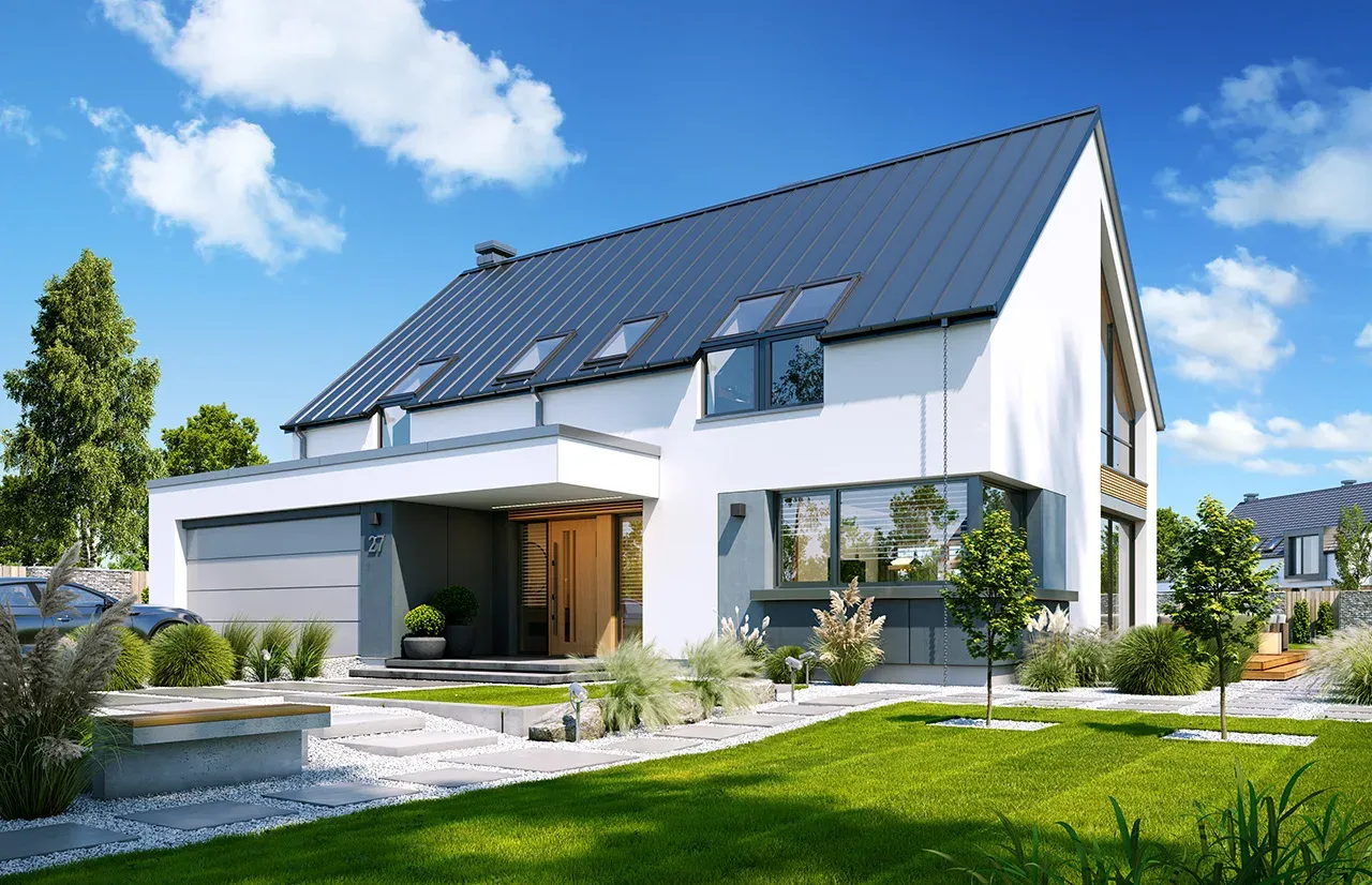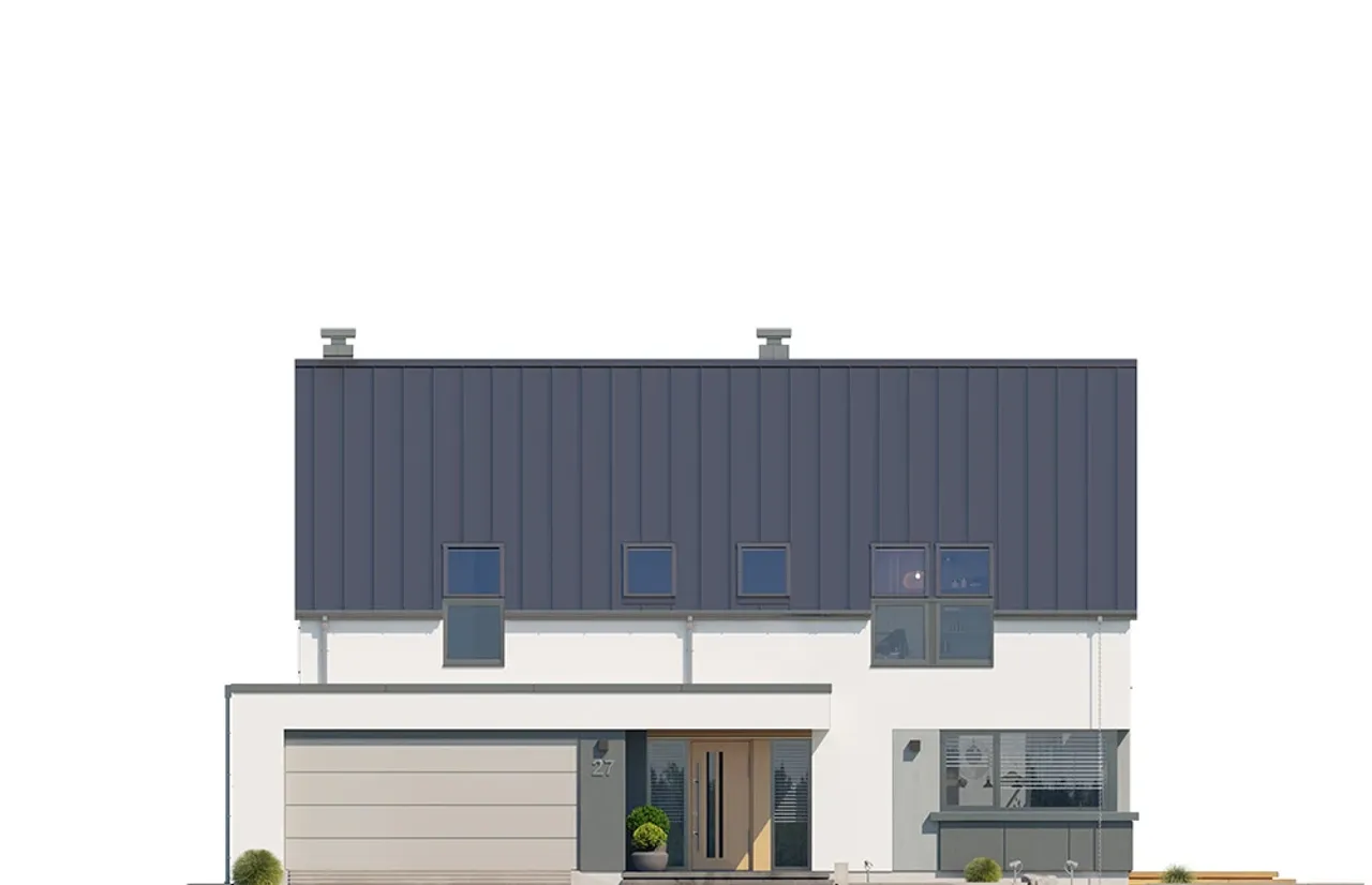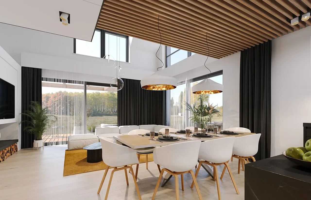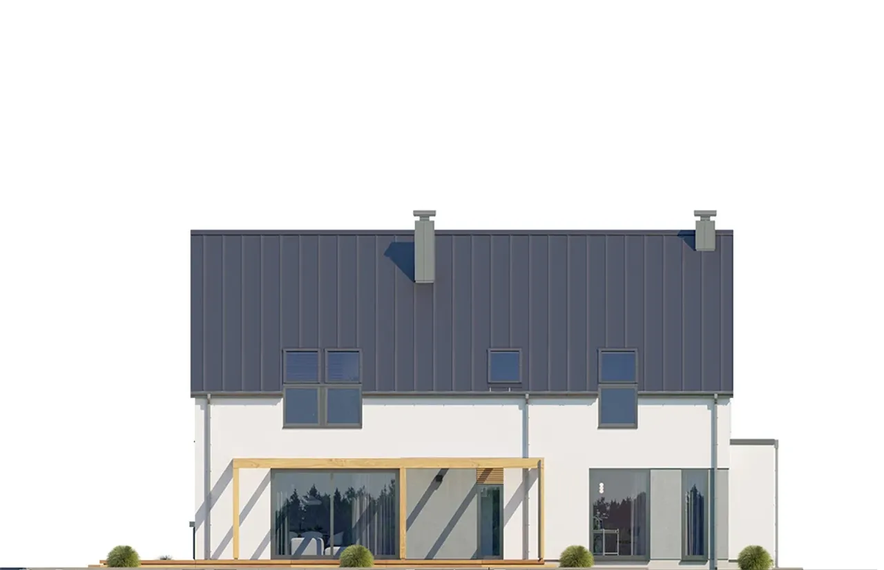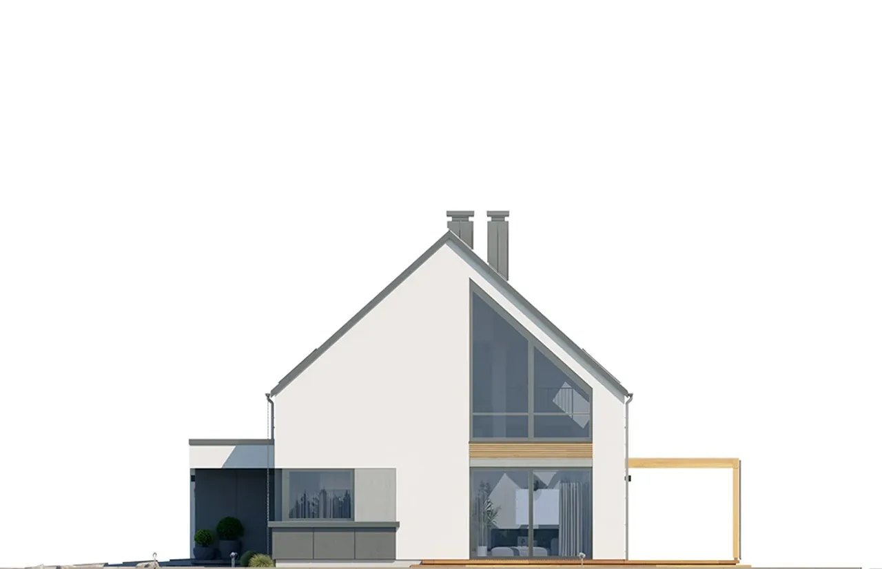 Projekt Domu Lambada wyróżnia się oryginalnym połączeniem funkcjonalności z nowoczesnym designem, co sprawia, że jest idealnym wyborem dla rodziny ceniącej sobie styl życia blisko natury i współczesne podejście do architektury. Jasna elewacja z elementami drewna doskonale wpisuje się w otoczenie ogrodowe, tworząc harmonijną całość. Przestronne wnętrze, wielofunkcyjne pomieszczenia oraz przeszklone ściany zapewniają nie tylko komfortowe użytkowanie, ale również maksymalne wykorzystanie światła naturalnego, co jest nie tylko praktyczne, ale i ekologiczne. To idealne połączenie estetyki i użyteczności, które zapewni ciepło domowego ogniska każdego dnia. Projekt Domu Lambada to więcej niż dom; to przestrzeń, gdzie każdy dzień można zaczynać od pięknych widoków i zakończyć w komforcie własnego azylu.