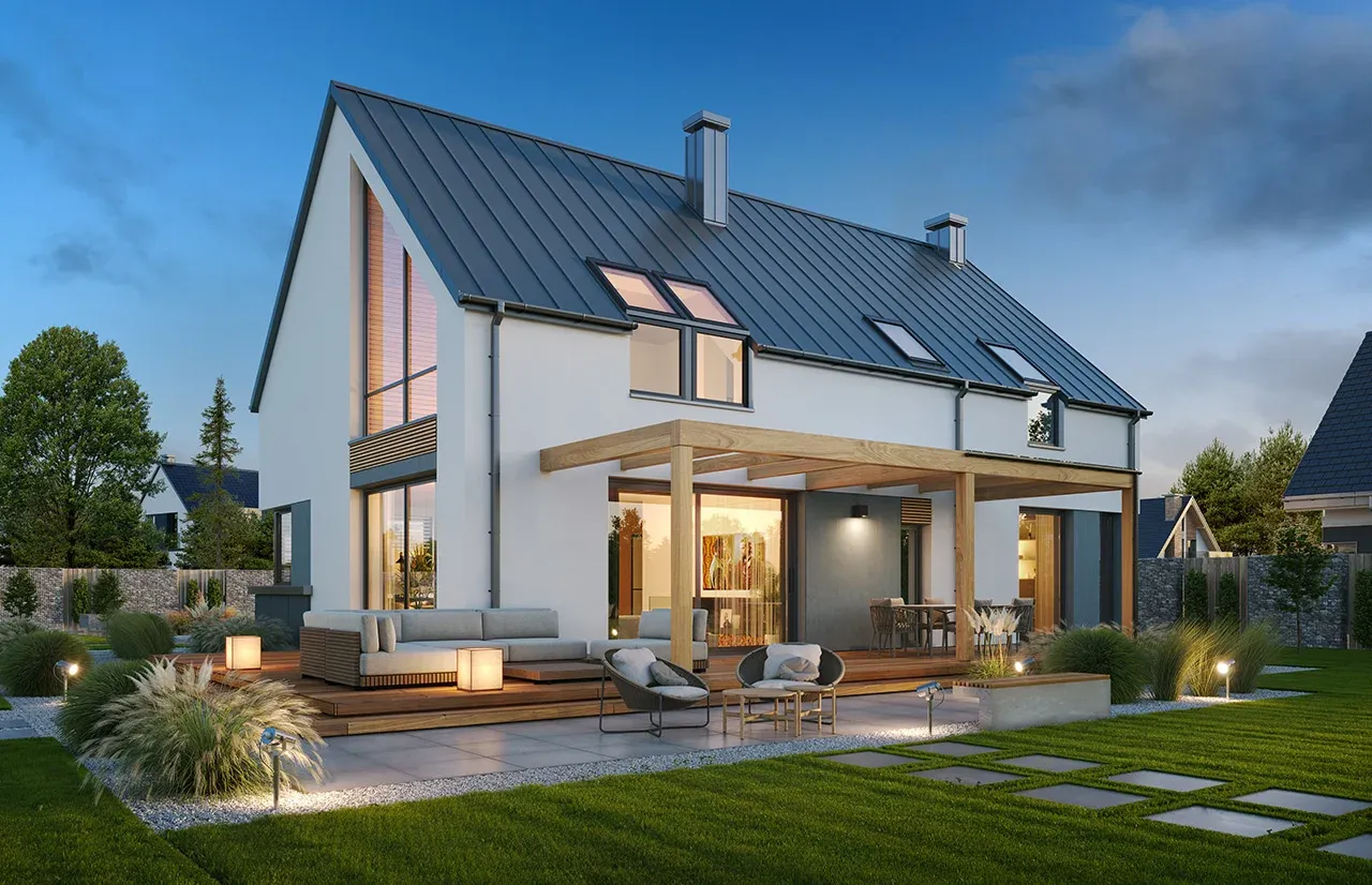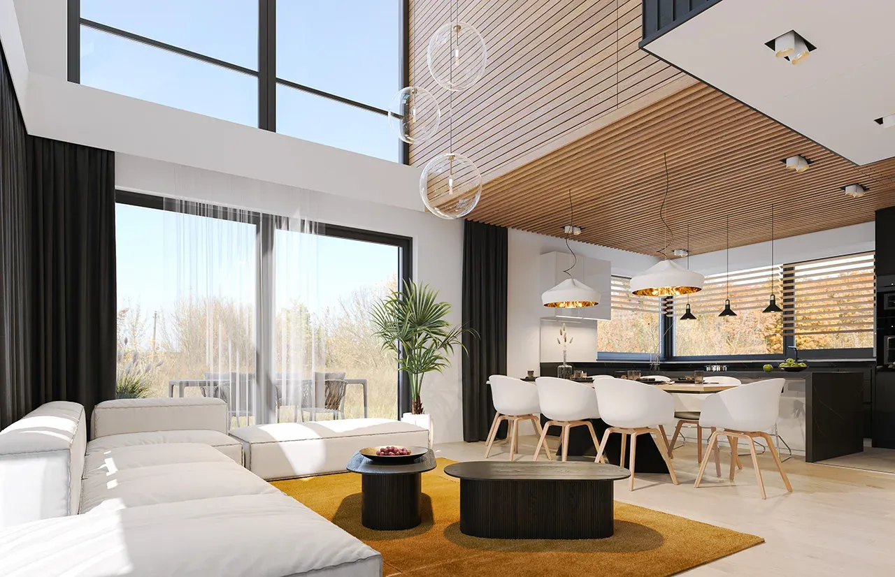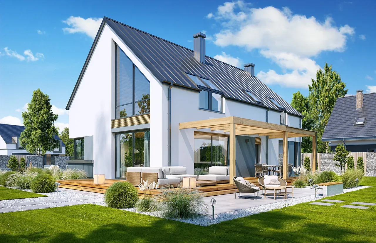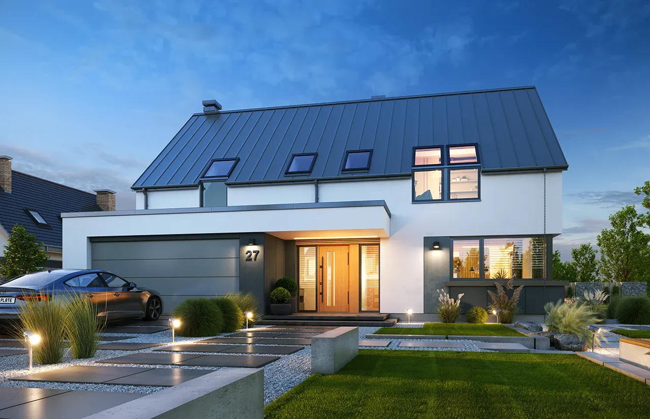 Projekt Domu Lambada wyróżnia się oryginalnym połączeniem funkcjonalności z nowoczesnym designem, co sprawia, że jest idealnym wyborem dla rodziny ceniącej sobie styl życia blisko natury i współczesne podejście do architektury. Jasna elewacja z elementami drewna doskonale wpisuje się w otoczenie ogrodowe, tworząc harmonijną całość. Przestronne wnętrze, wielofunkcyjne pomieszczenia oraz przeszklone ściany zapewniają nie tylko komfortowe użytkowanie, ale również maksymalne wykorzystanie światła naturalnego, co jest nie tylko praktyczne, ale i ekologiczne. To idealne połączenie estetyki i użyteczności, które zapewni ciepło domowego ogniska każdego dnia. Projekt Domu Lambada to więcej niż dom; to przestrzeń, gdzie każdy dzień można zaczynać od pięknych widoków i zakończyć w komforcie własnego azylu.