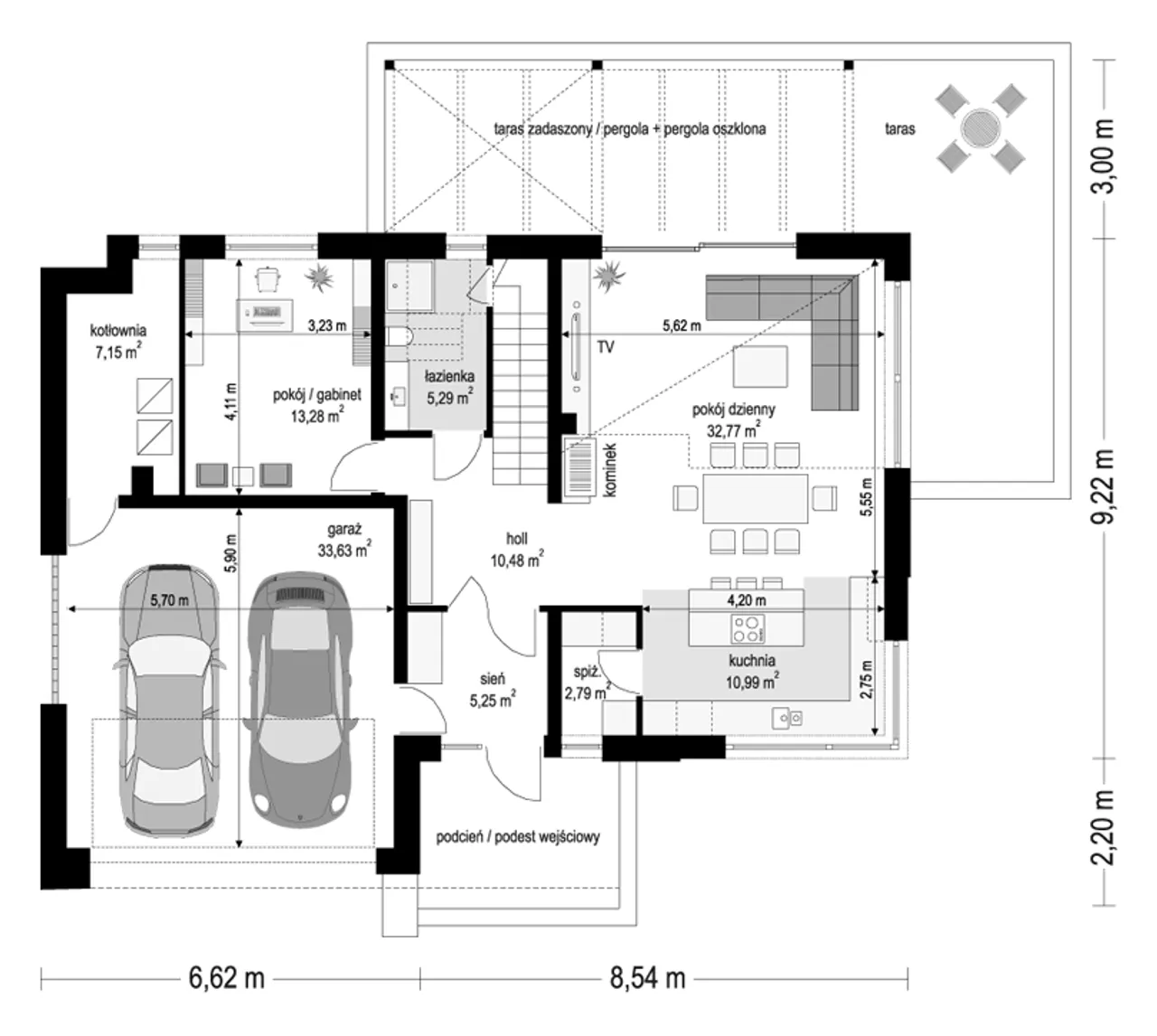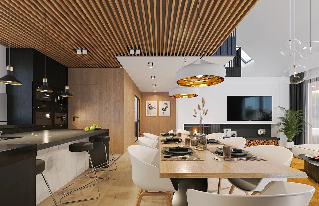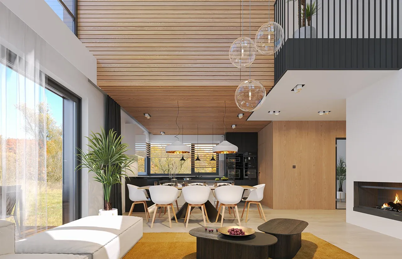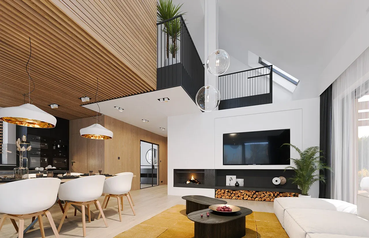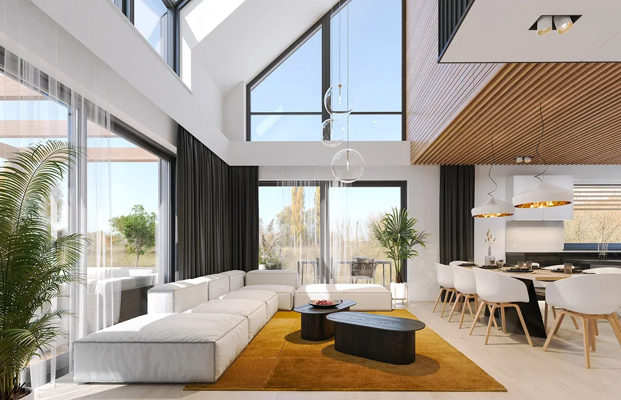 Projekt Domu Lambada wyróżnia się oryginalnym połączeniem funkcjonalności z nowoczesnym designem, co sprawia, że jest idealnym wyborem dla rodziny ceniącej sobie styl życia blisko natury i współczesne podejście do architektury. Jasna elewacja z elementami drewna doskonale wpisuje się w otoczenie ogrodowe, tworząc harmonijną całość. Przestronne wnętrze, wielofunkcyjne pomieszczenia oraz przeszklone ściany zapewniają nie tylko komfortowe użytkowanie, ale również maksymalne wykorzystanie światła naturalnego, co jest nie tylko praktyczne, ale i ekologiczne. To idealne połączenie estetyki i użyteczności, które zapewni ciepło domowego ogniska każdego dnia. Projekt Domu Lambada to więcej niż dom; to przestrzeń, gdzie każdy dzień można zaczynać od pięknych widoków i zakończyć w komforcie własnego azylu.